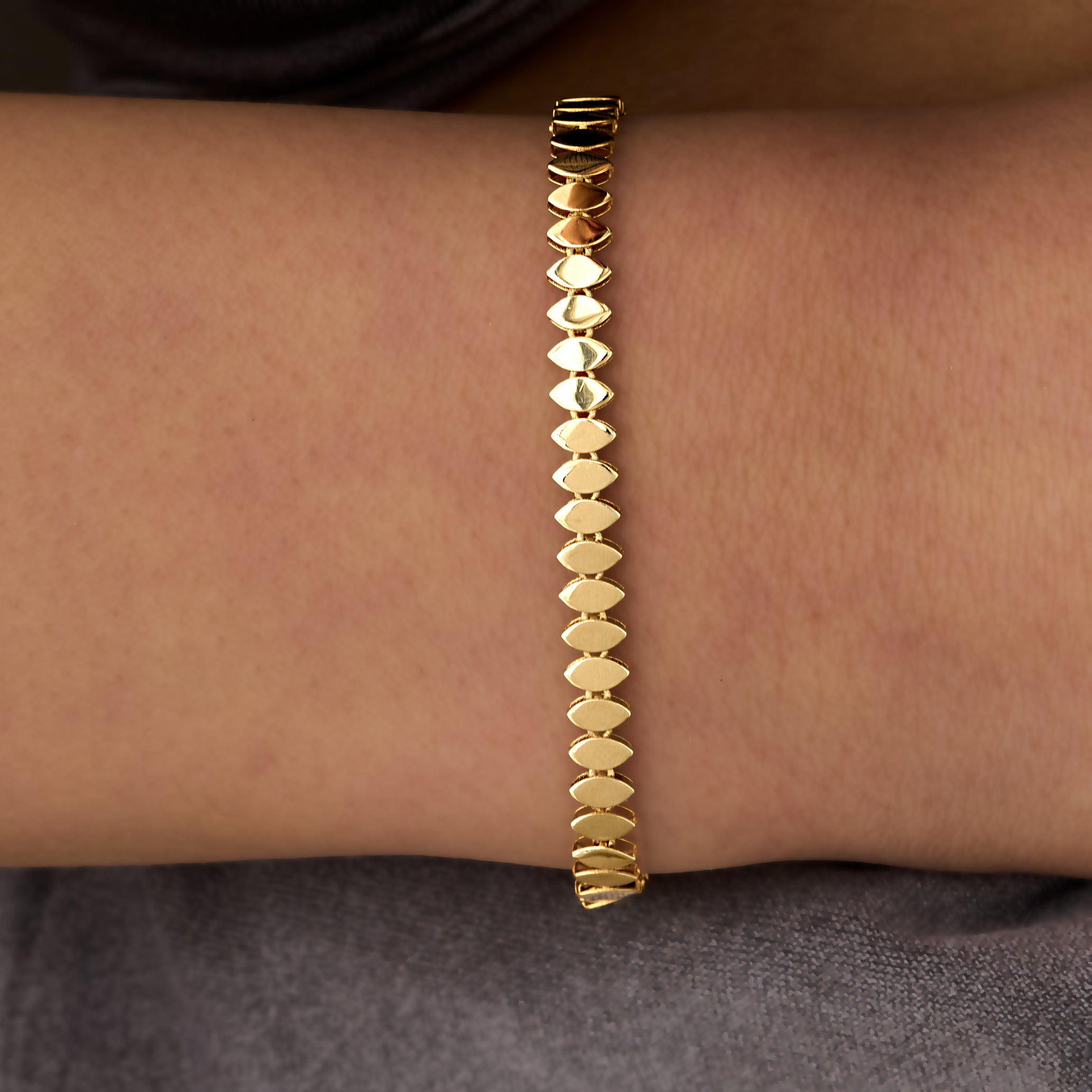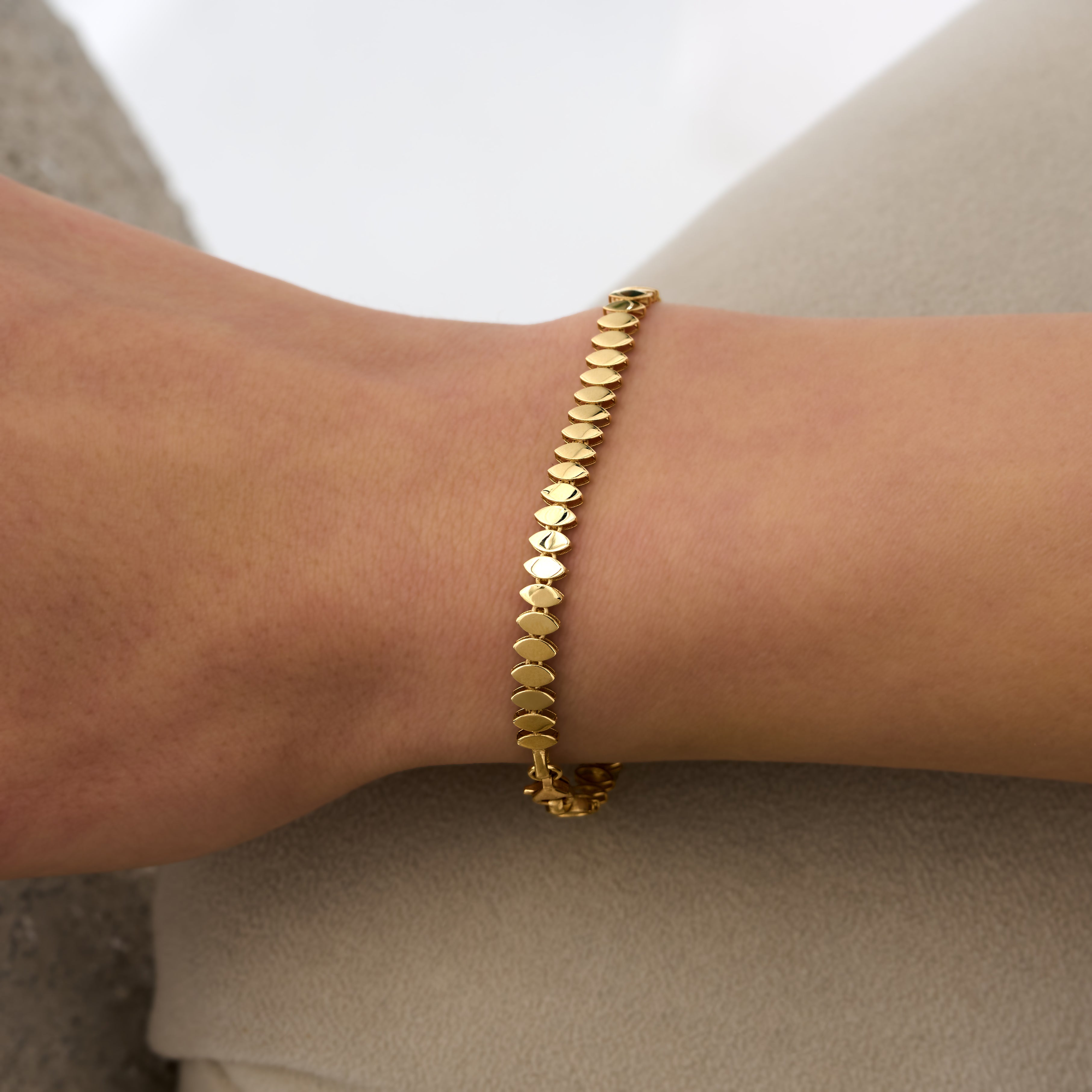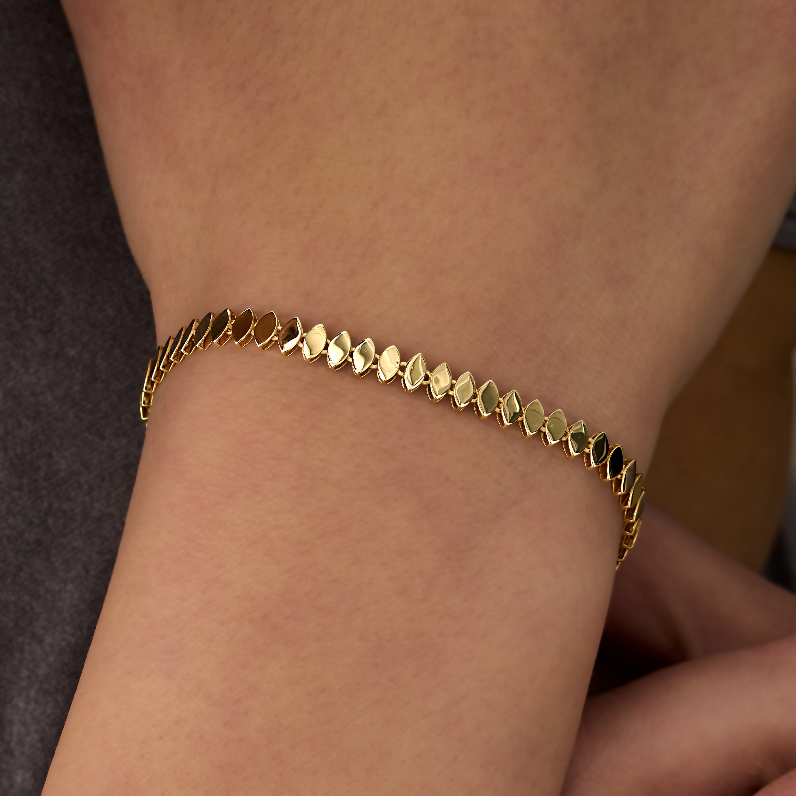 Yaprak Motifli Bileklik modeli, yaklaşık 3.55 gr ağırlığında 14 Ayar Sarı Altın kullanılarak özel olarak tasarlanmıştır.