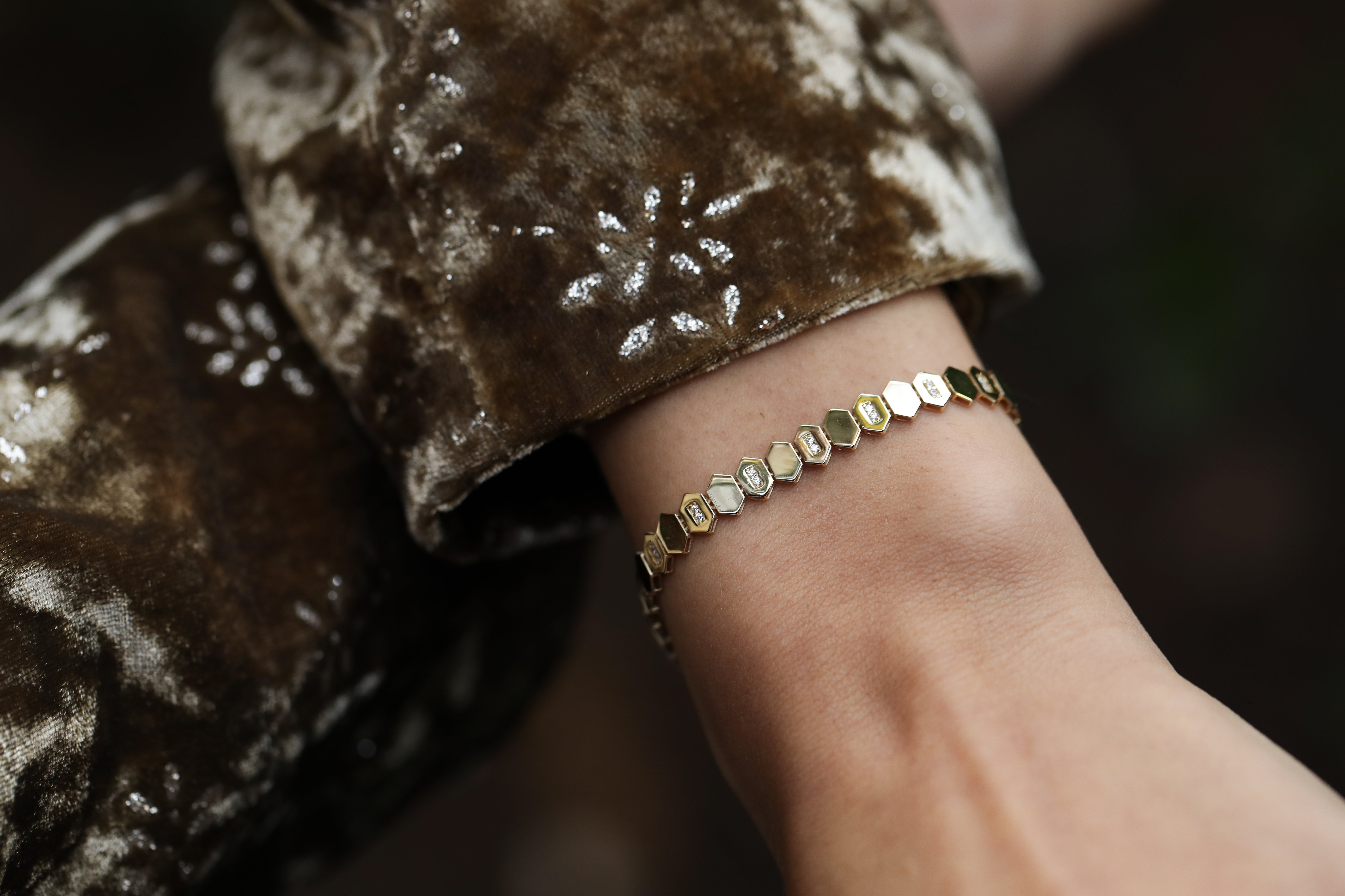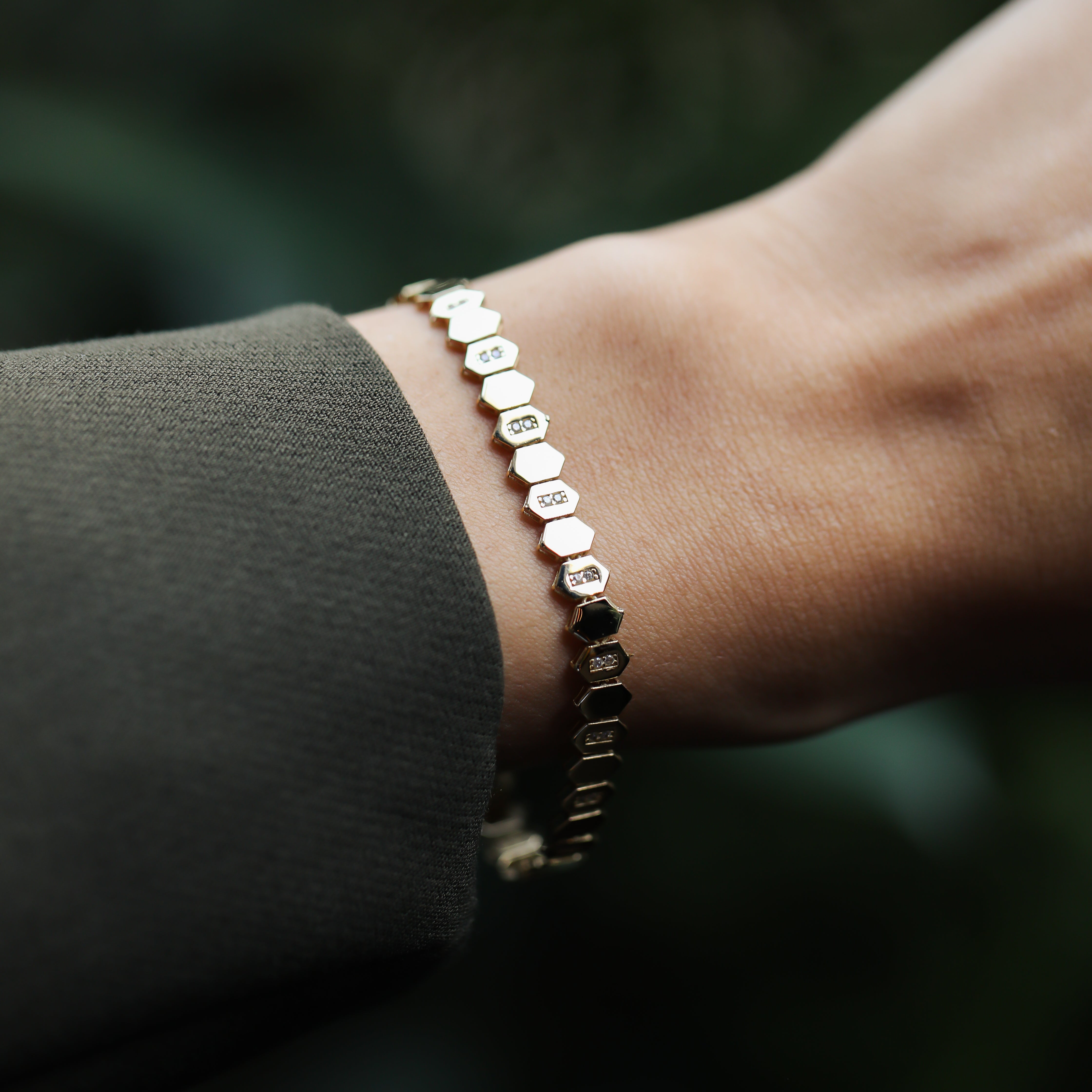 Altıgen Pırlanta Bileklik modeli, yaklaşık 6.02 gr ağırlığında 14 Ayar Sarı Altın kullanılarak özel olarak tasarlanmıştır.