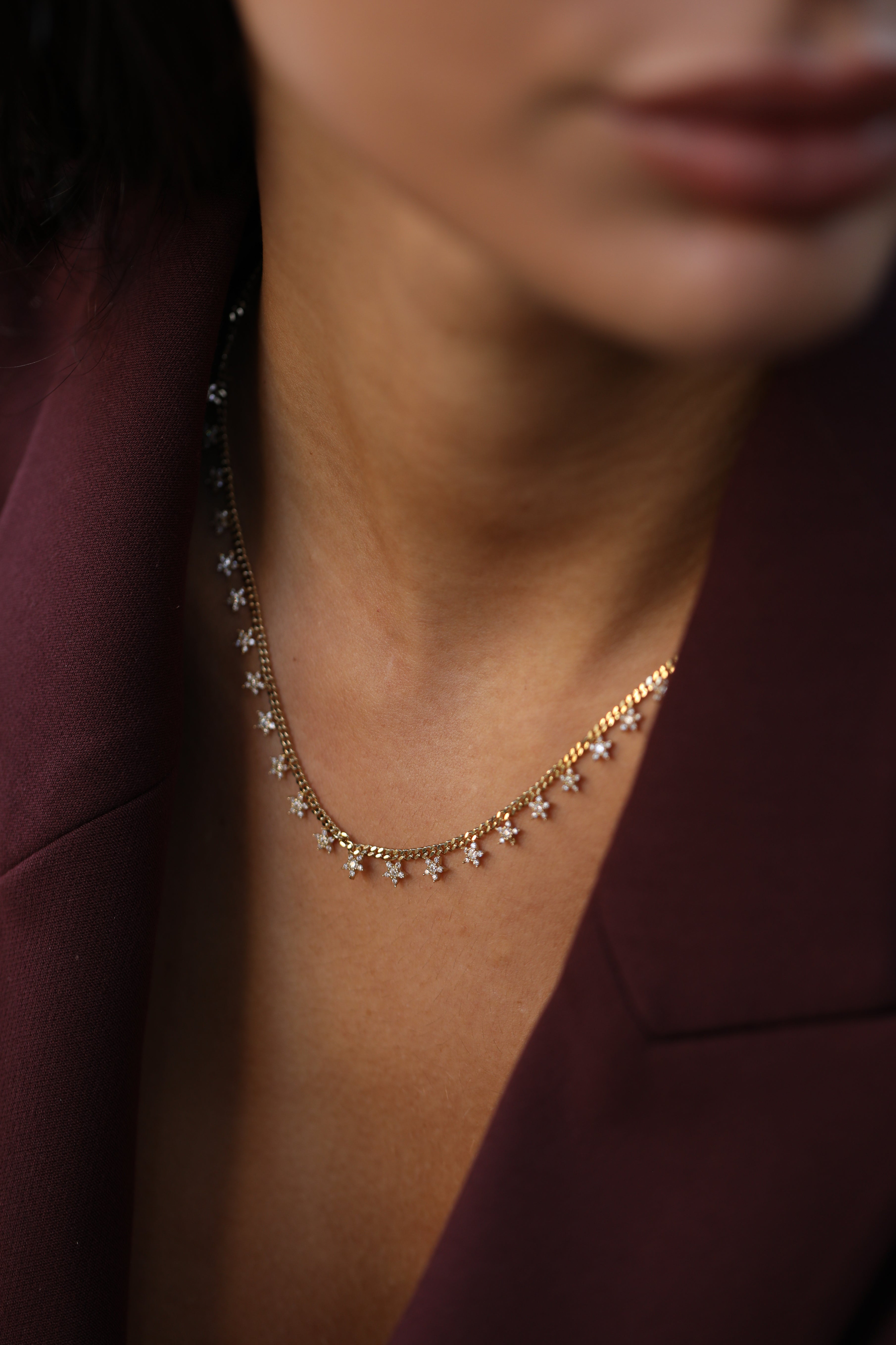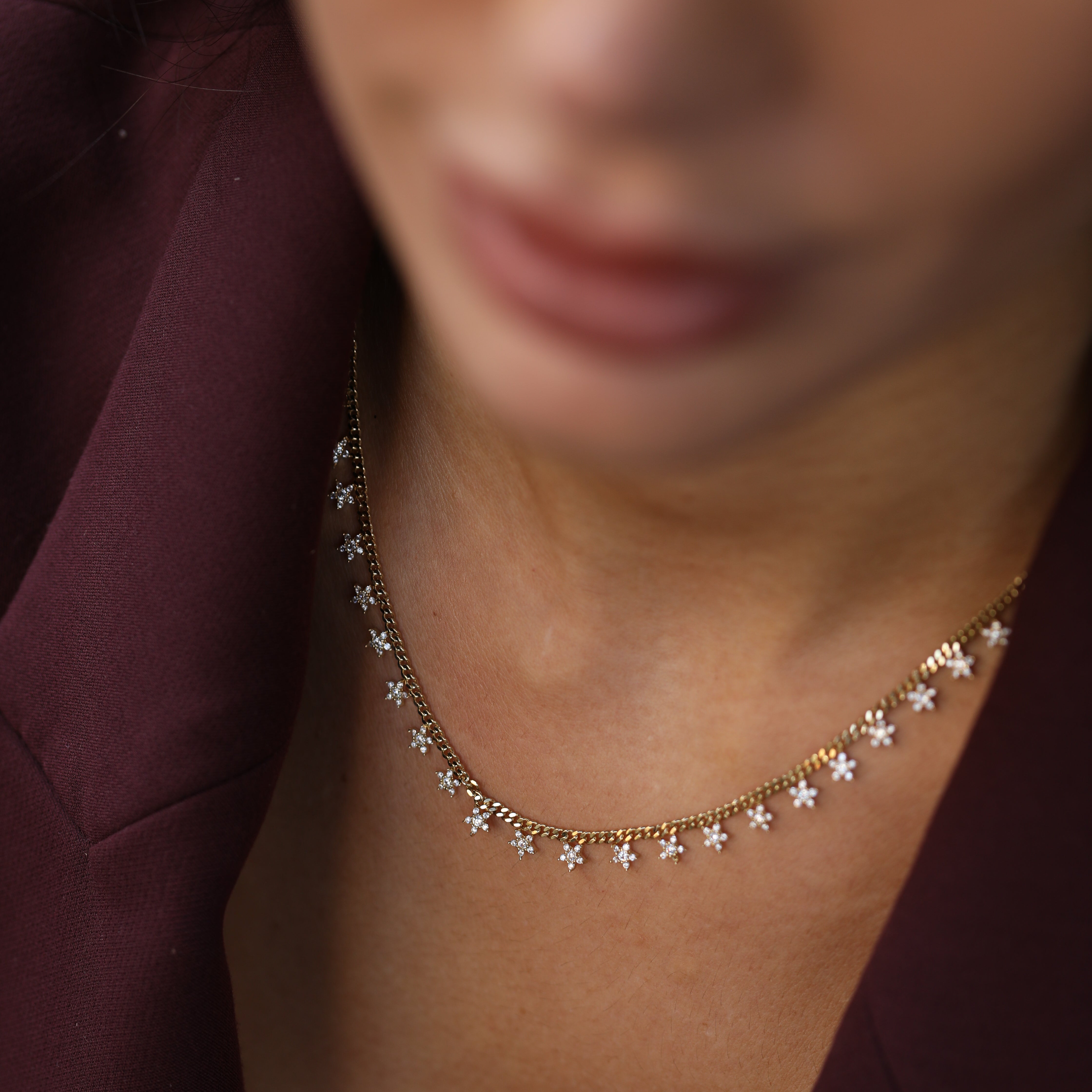 Pırlanta Çiçek Sallantılı Kolye modeli, yaklaşık 9.26 gr ağırlığında 14 Ayar Sarı Altın kullanılarak özel olarak tasarlanmıştır.
