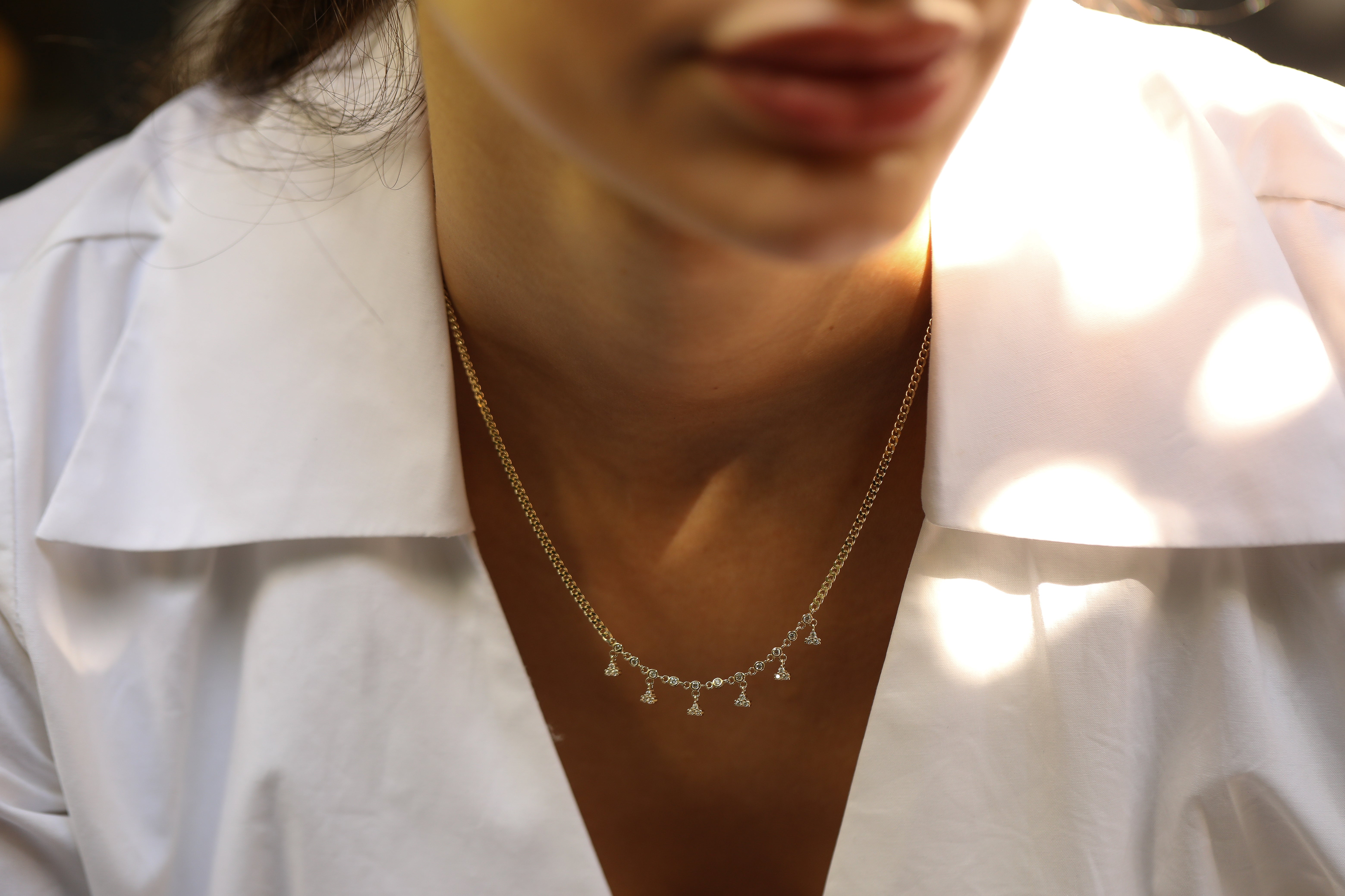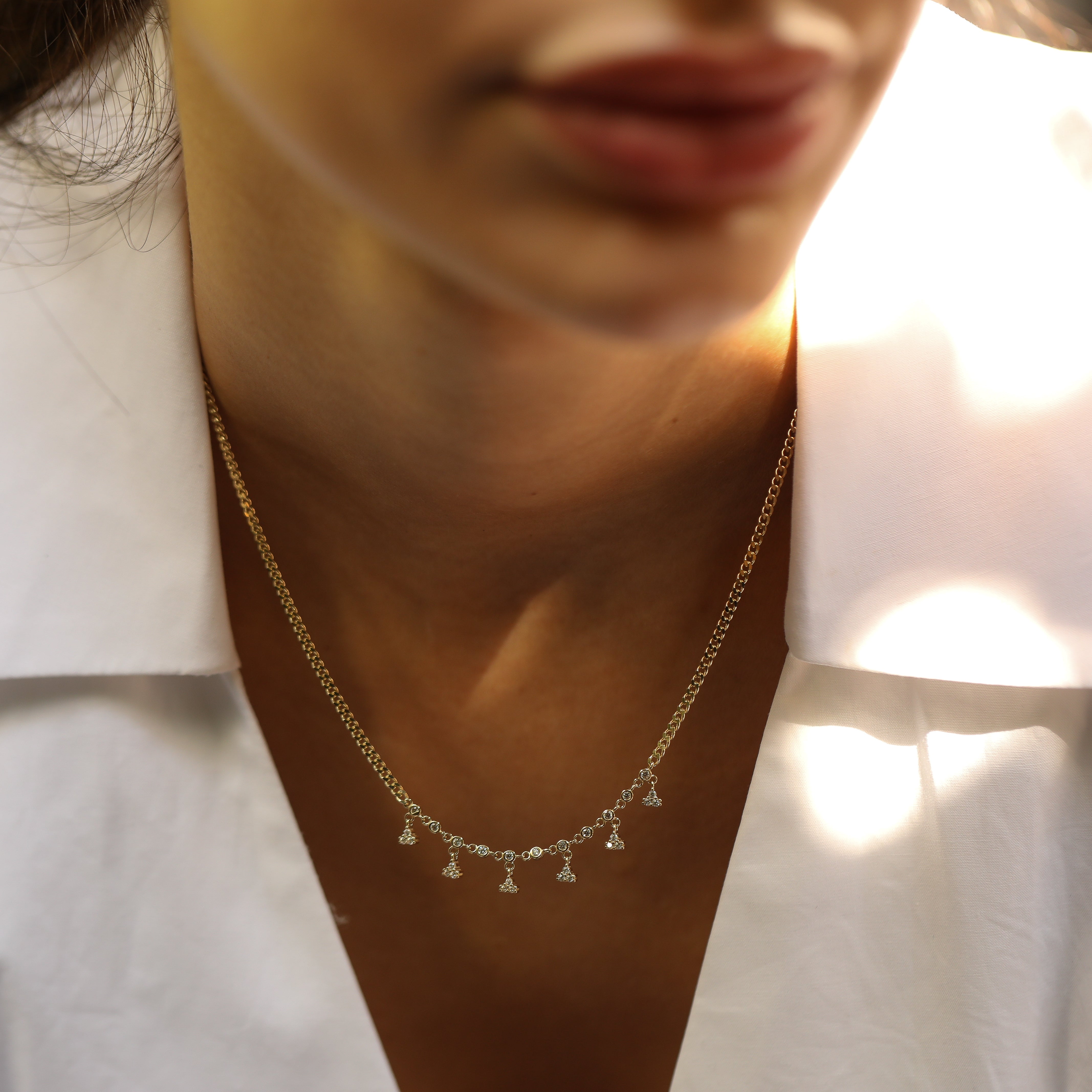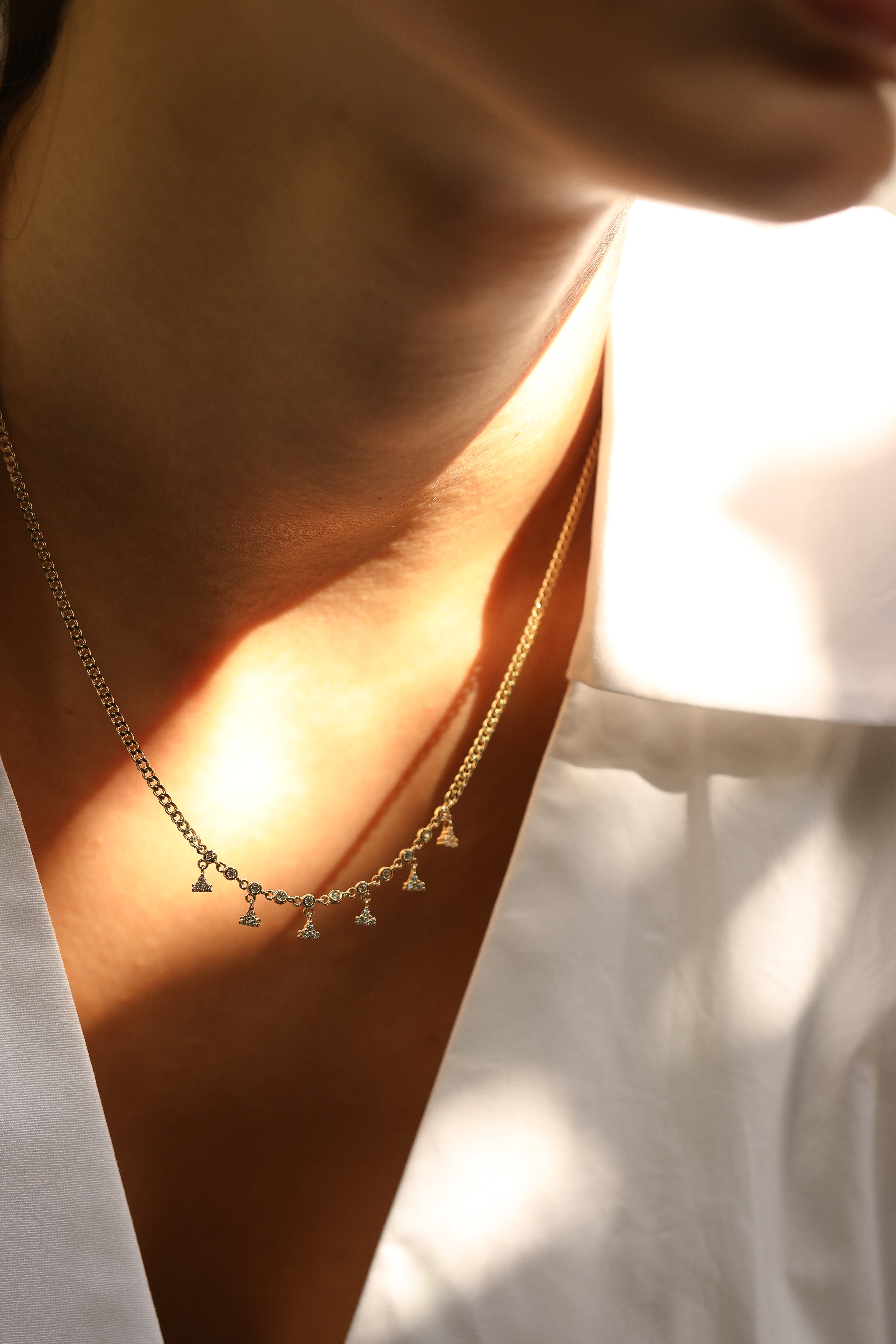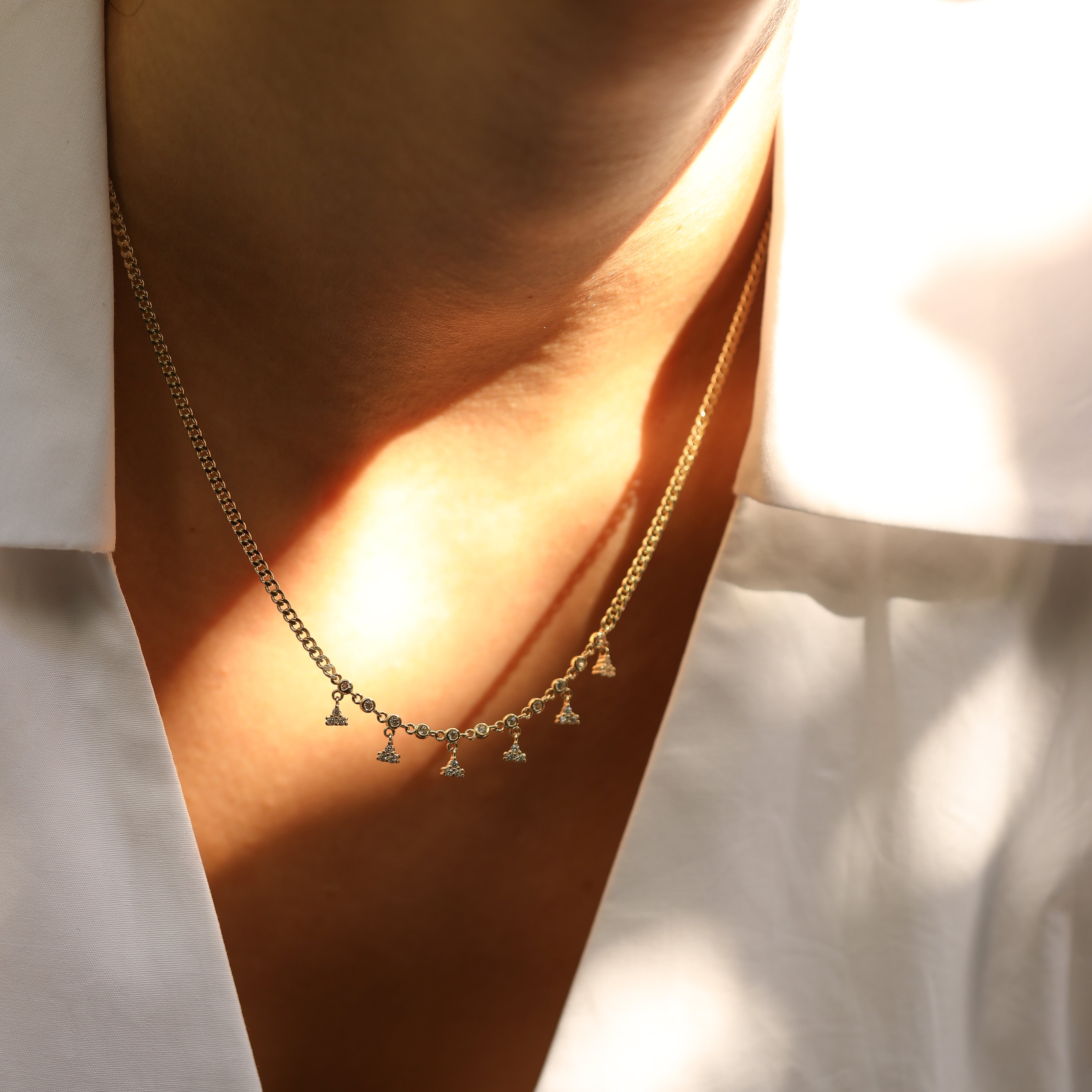 Üçgen Taş Sallantılı Minimal Kolye modeli, yaklaşık 6.73 gr ağırlığında 14 Ayar Sarı Altın kullanılarak özel olarak tasarlanmıştır.