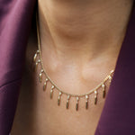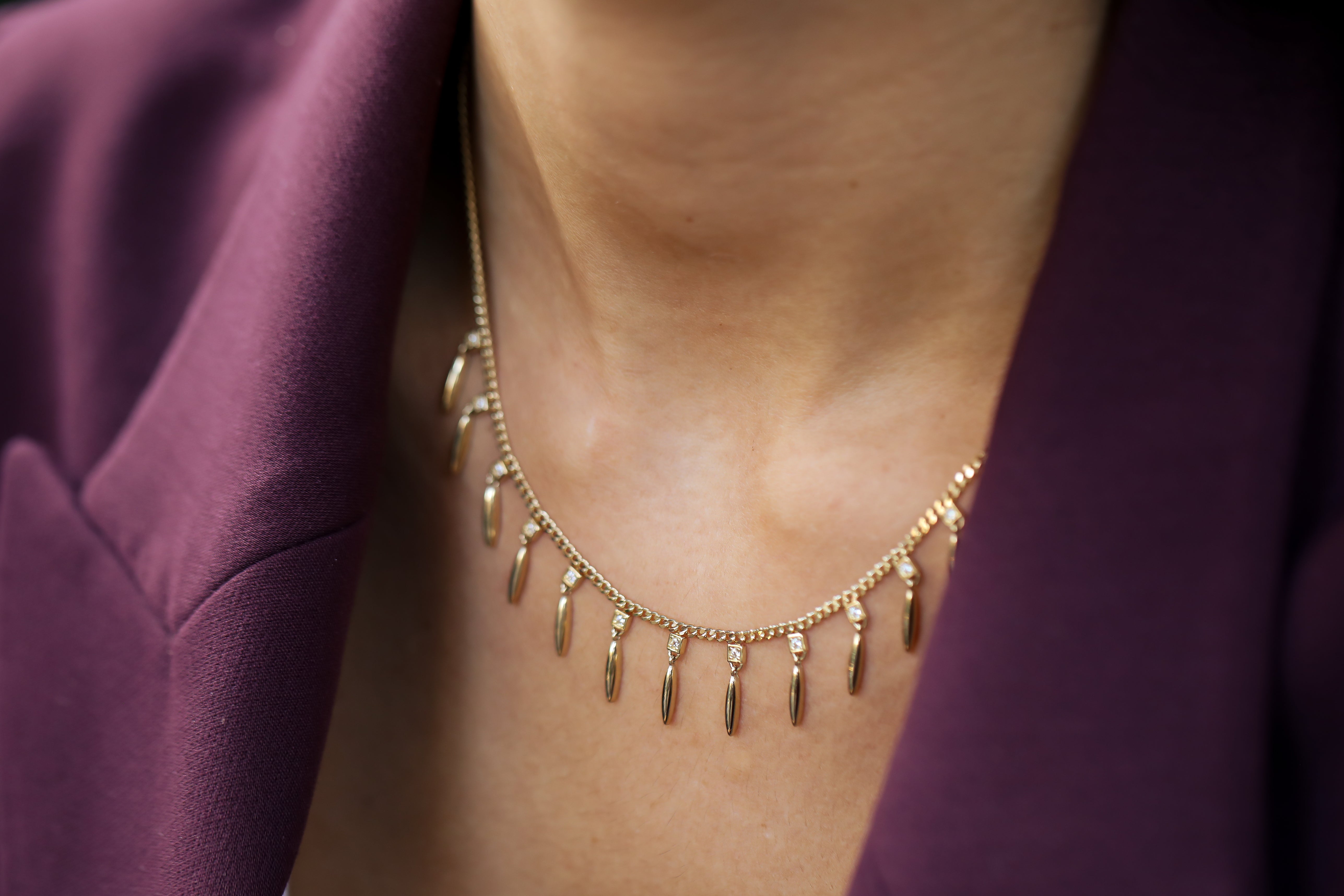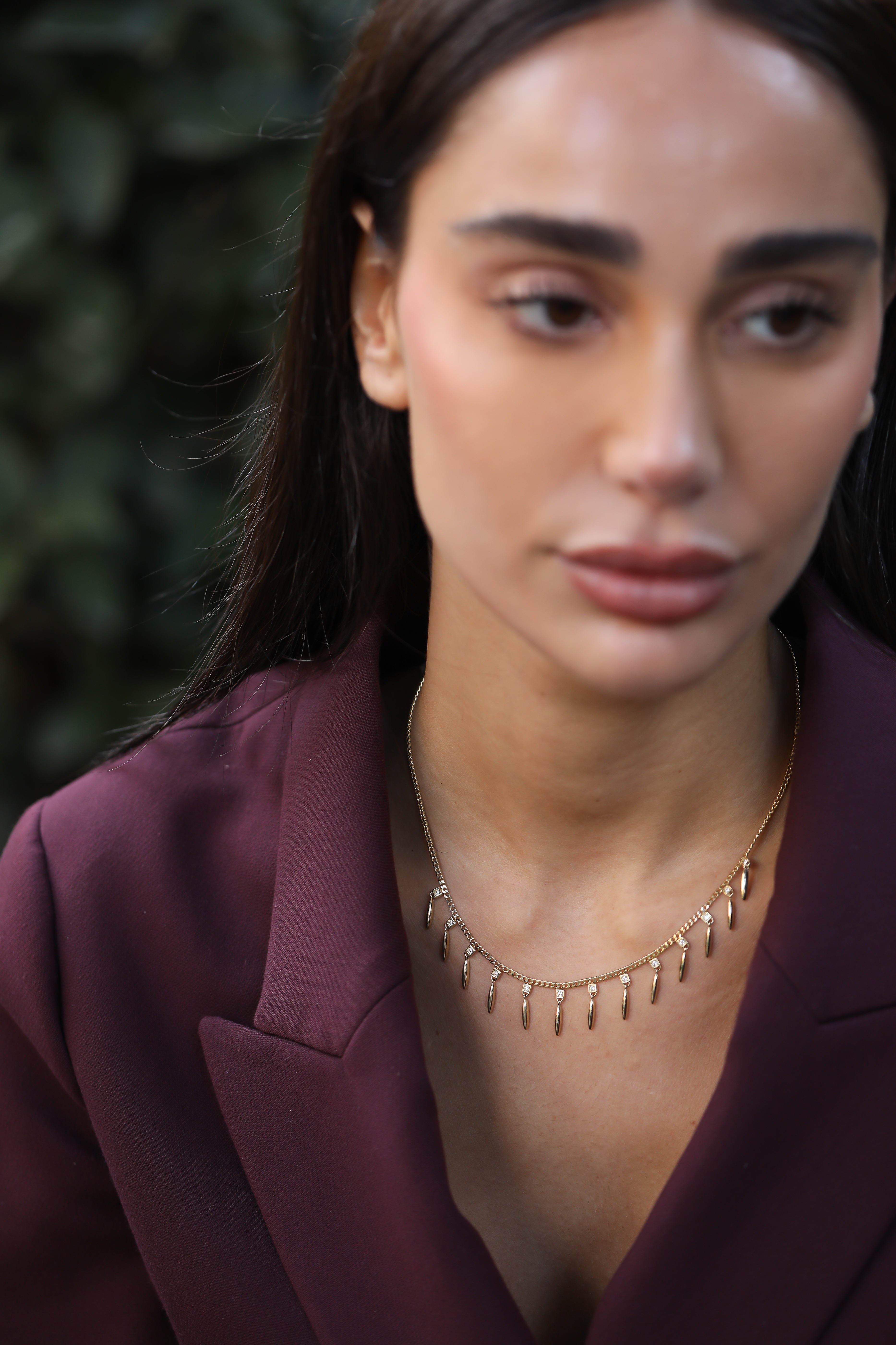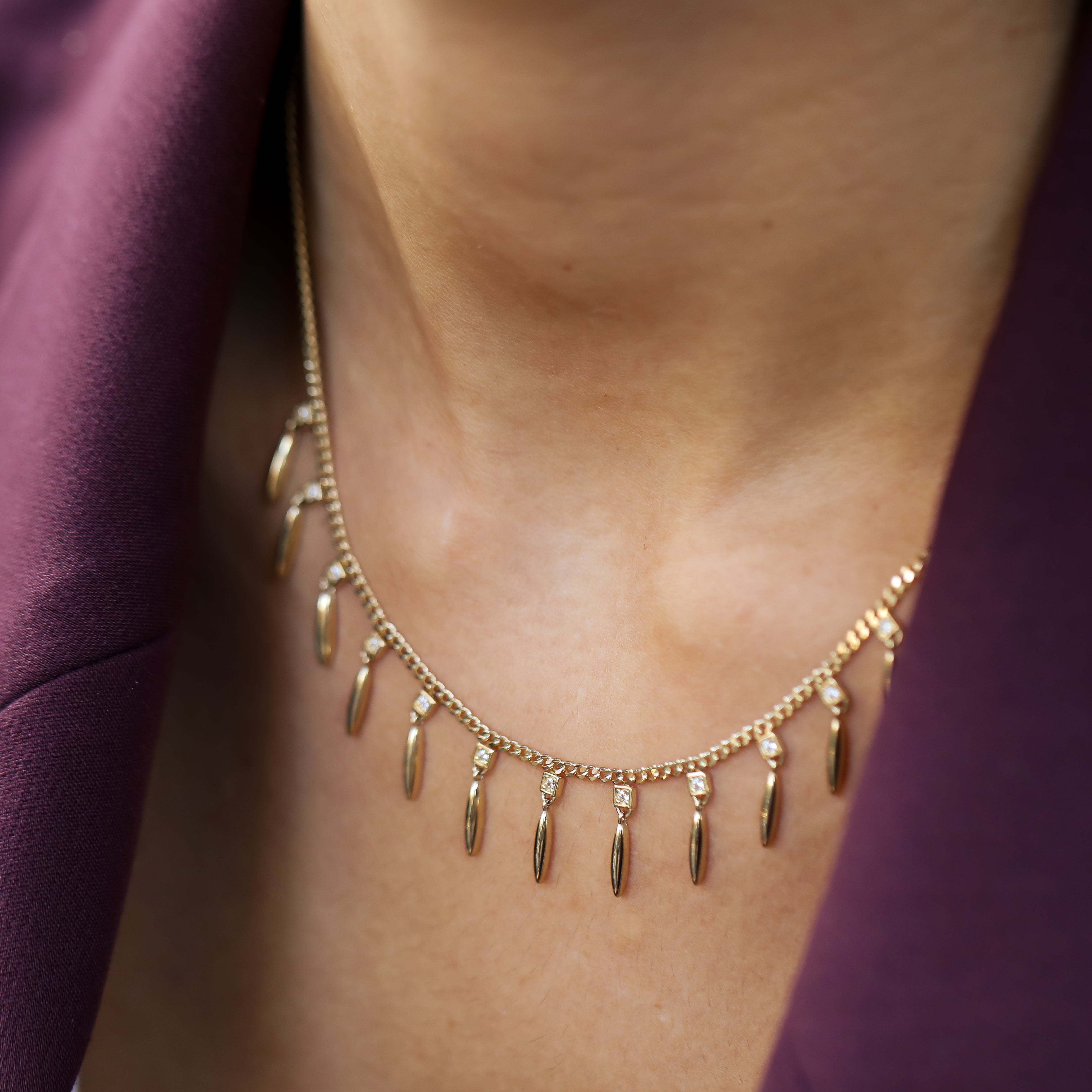 Uzun Sallantı Detaylı Kolye modeli, yaklaşık 9.98 gr ağırlığında 14 Ayar Sarı Altın kullanılarak özel olarak tasarlanmıştır.