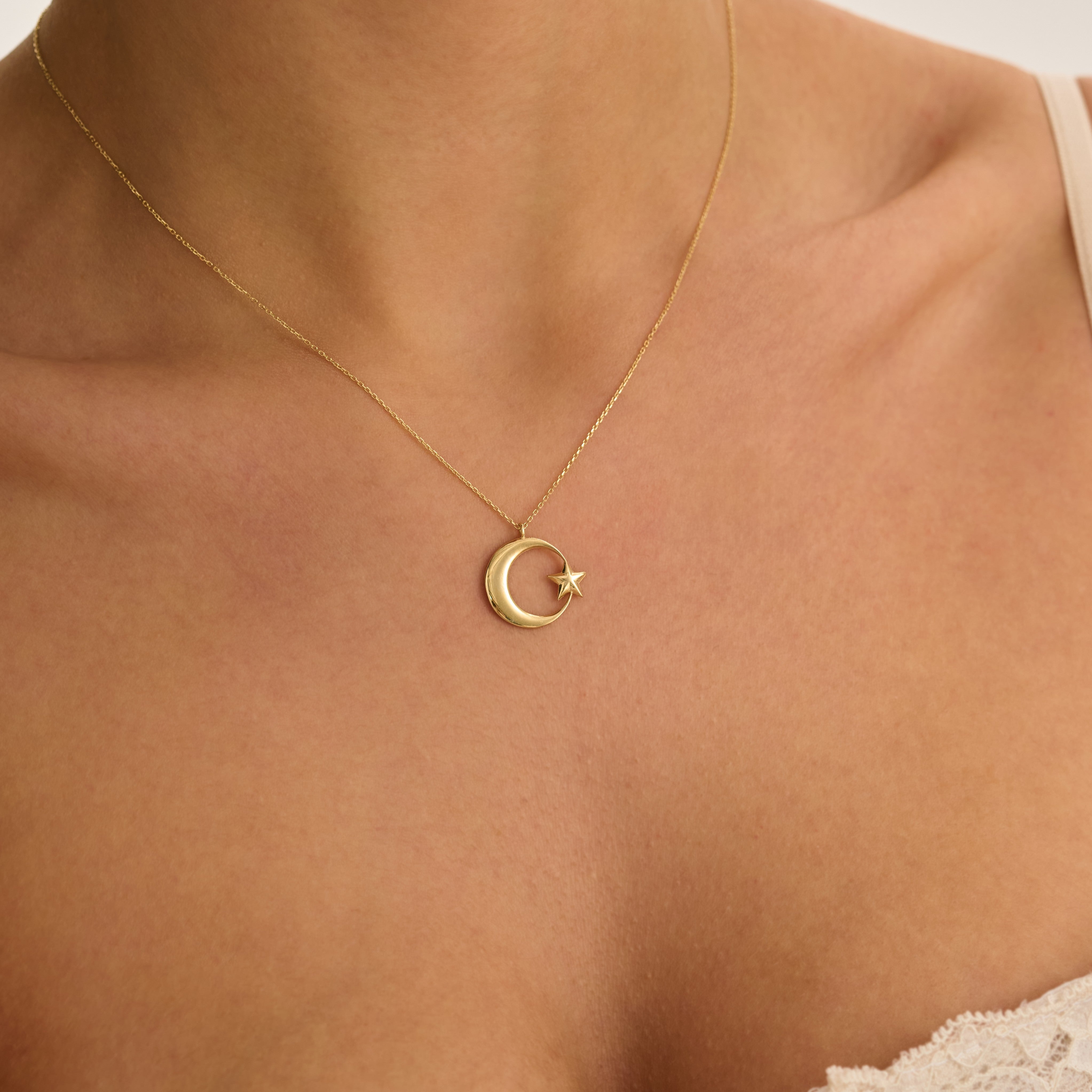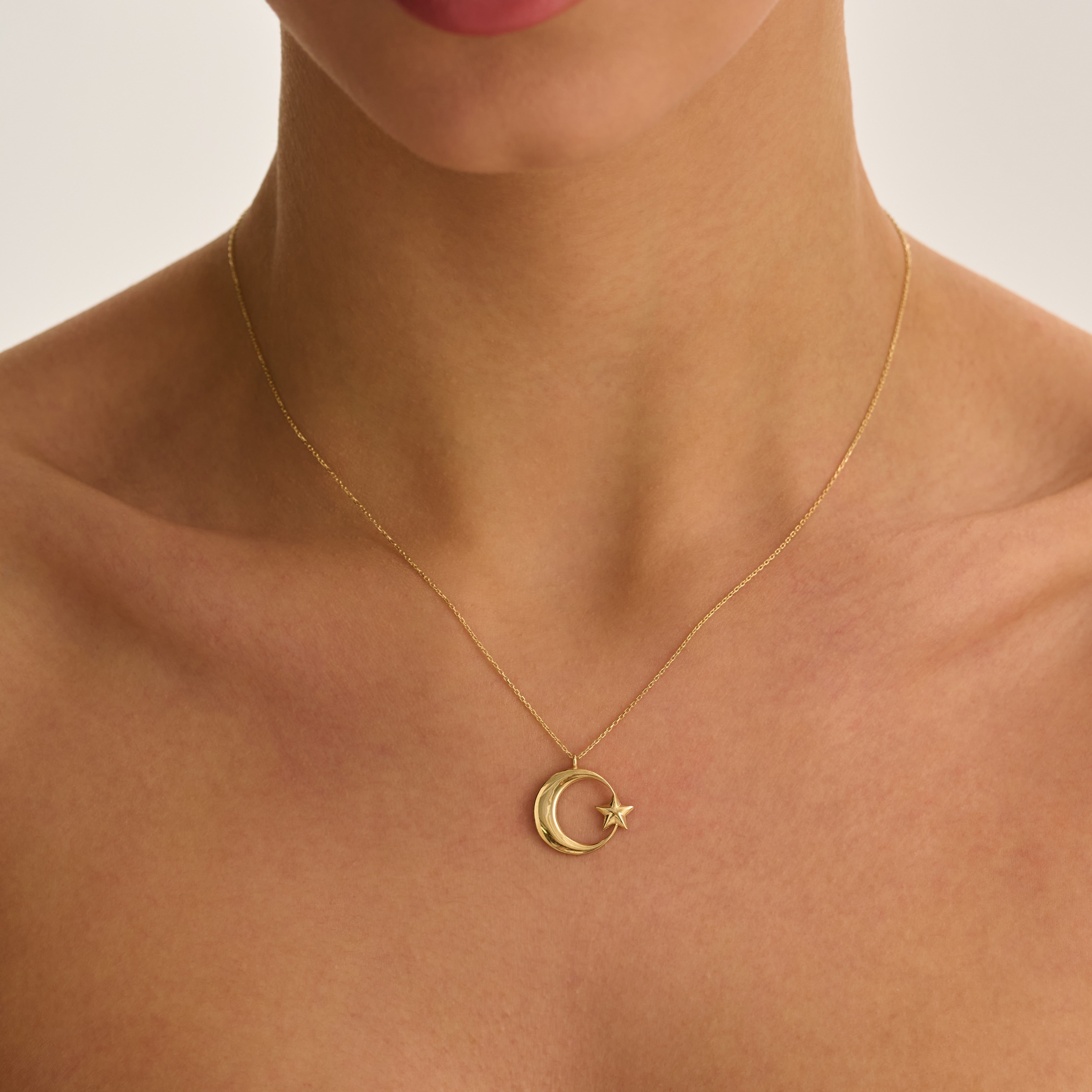 AY-YILDIZ Tasarım Kolye modeli, yaklaşık 2.05 gr ağırlığında 14 Ayar Sarı Altın kullanılarak özel olarak tasarlanmıştır.