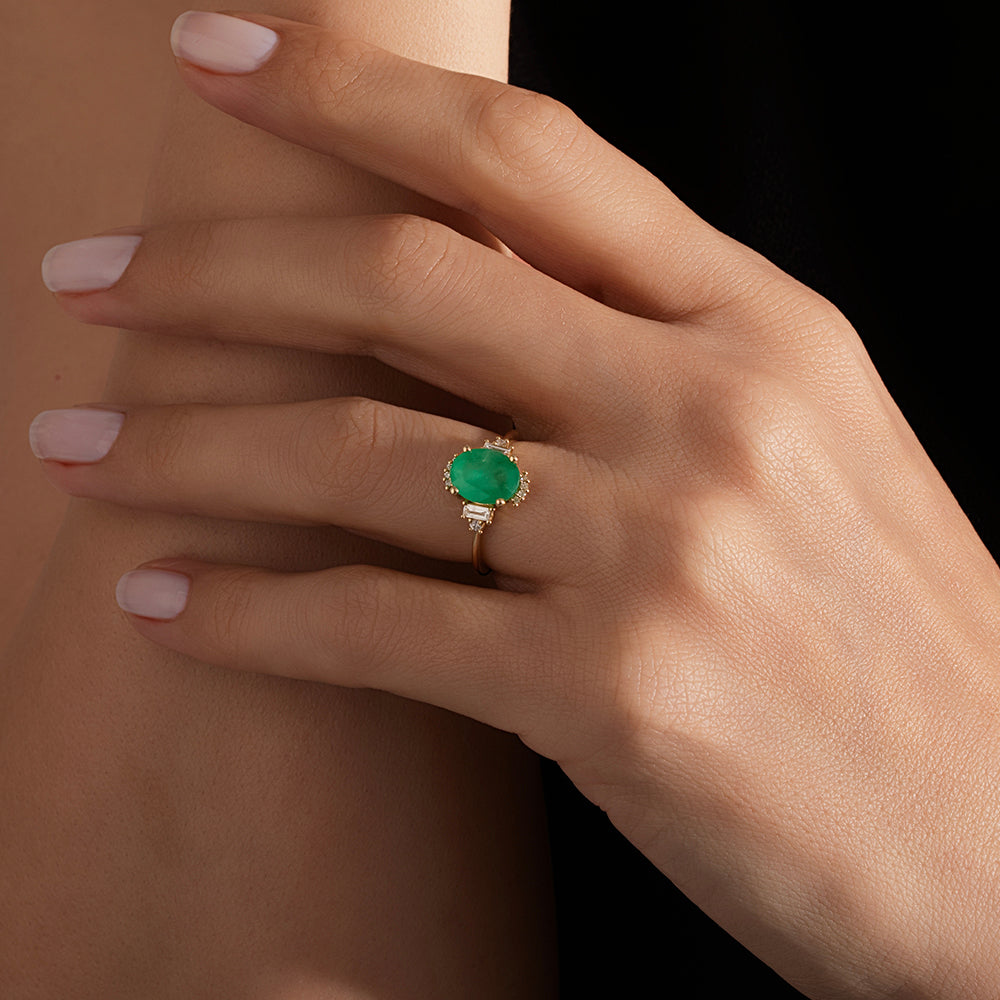 2.00 Karat Oval Zümrüt & 0.20 Karat Baget & 0.10 Karat Yuvarlak Pırlanta Renkli Yüzük-RNF1330