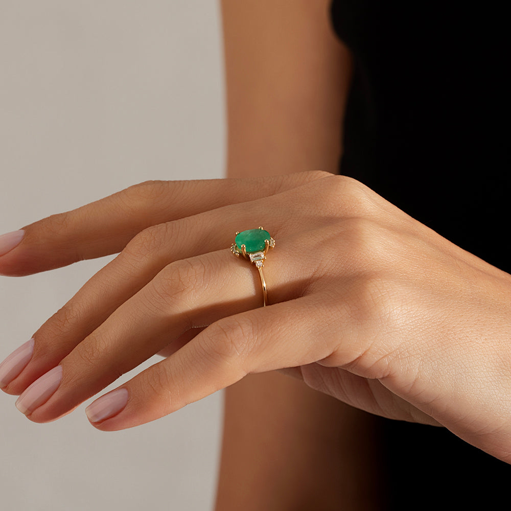 2.00 Karat Oval Zümrüt & 0.20 Karat Baget & 0.10 Karat Yuvarlak Pırlanta Renkli Yüzük modeli, yaklaşık 2.65 gr ağırlığında 14 Ayar Sarı Altın kullanılarak özel olarak tasarlanmıştır.