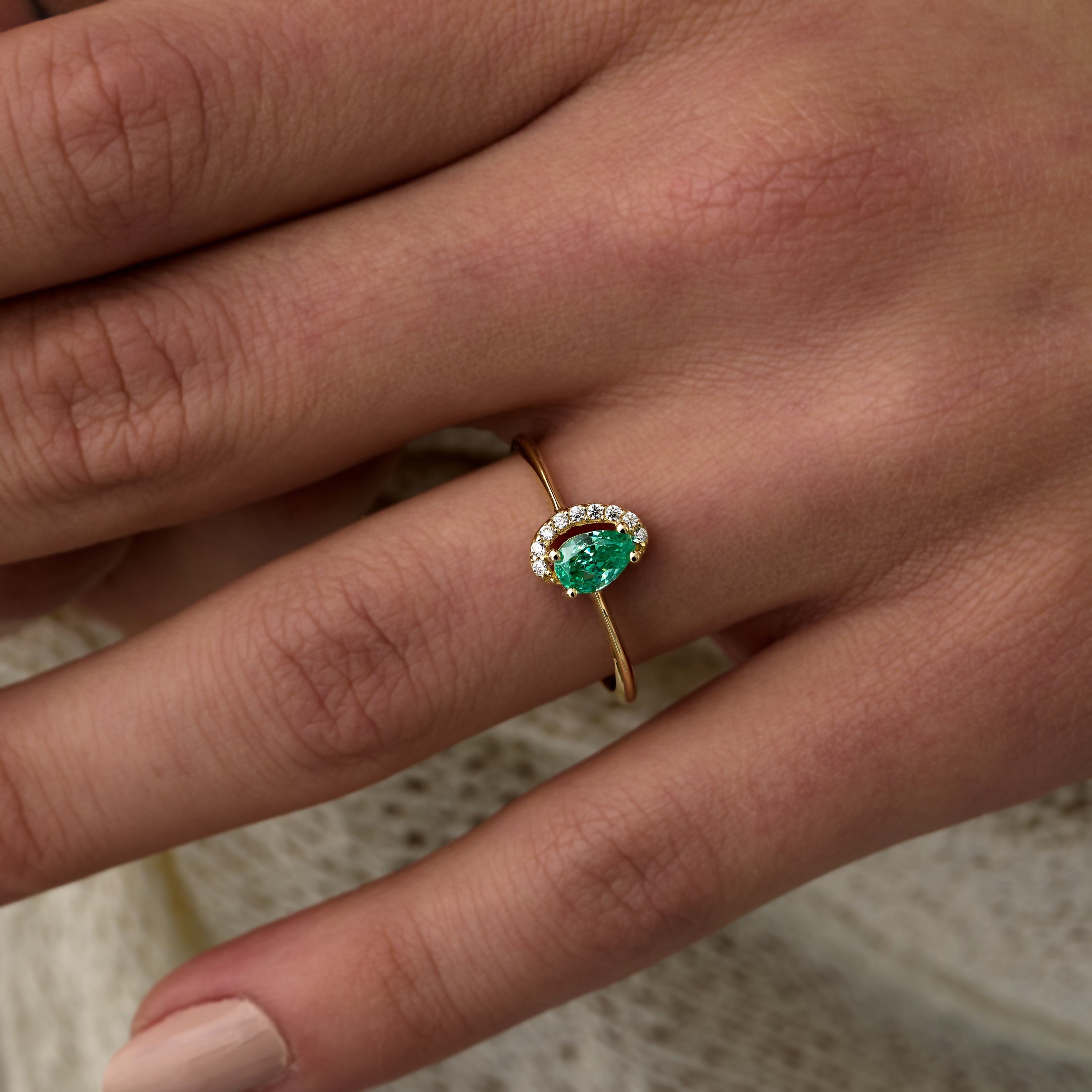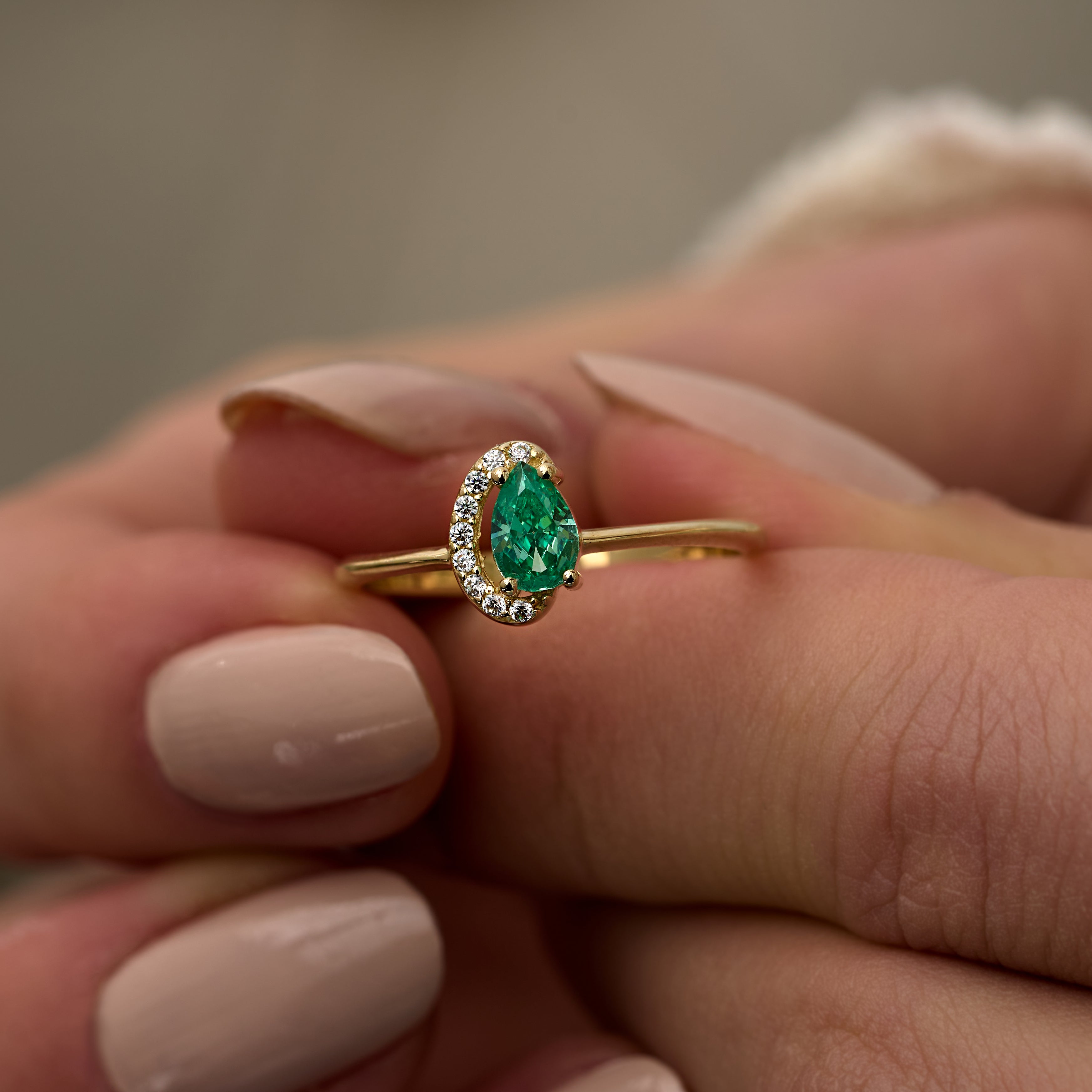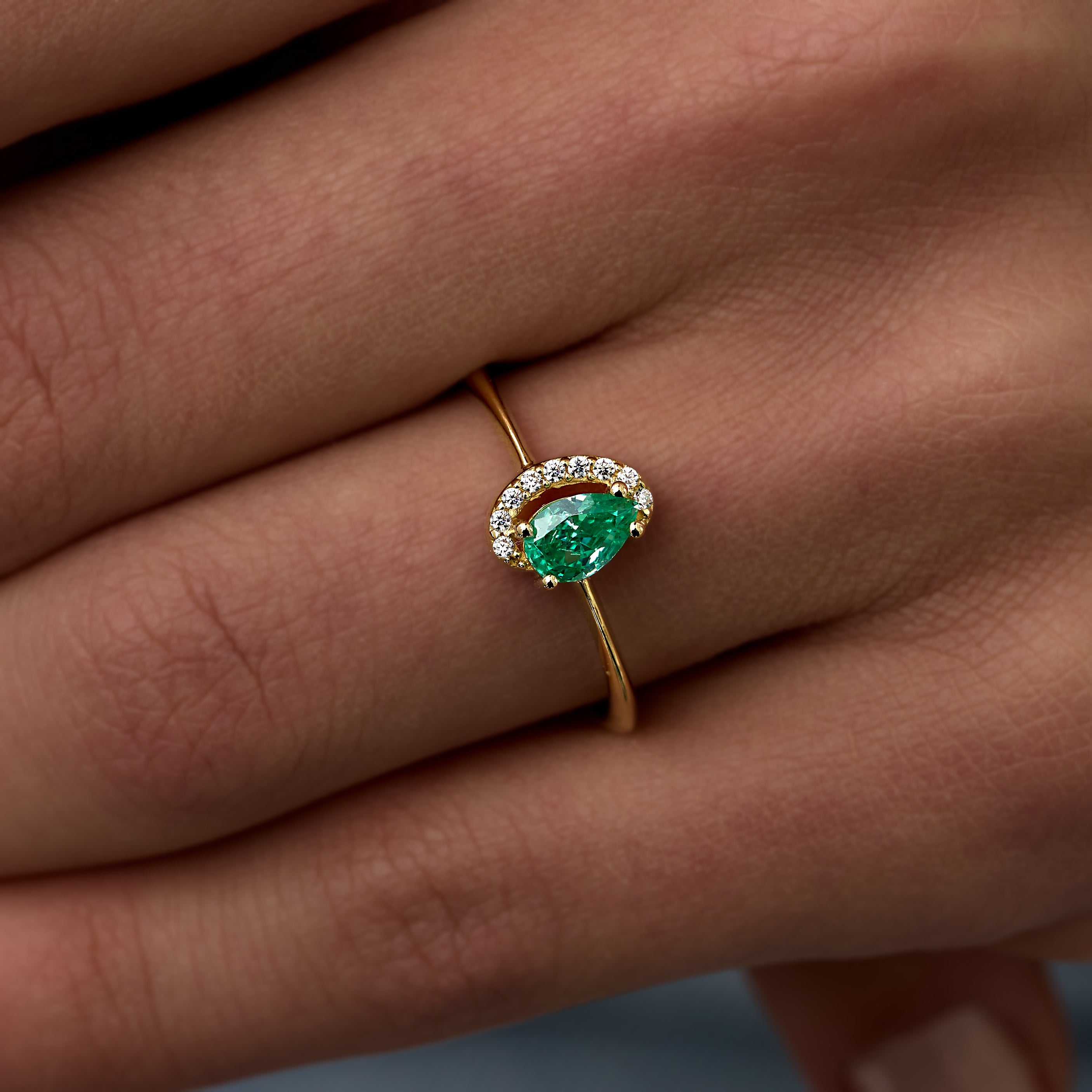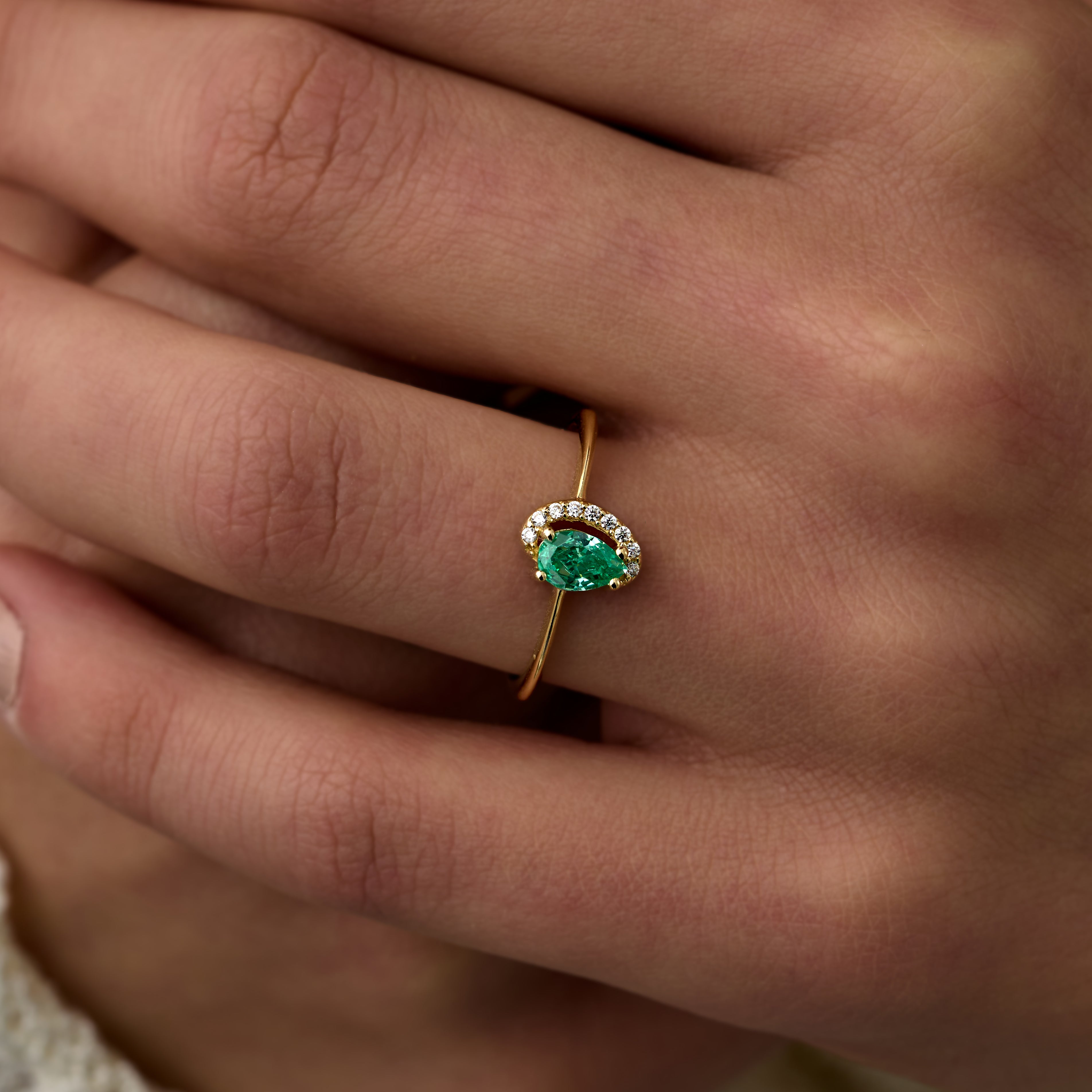 Zümrüt Damla Kesim Pırlanta Yüzük modeli, yaklaşık 1.98 gr ağırlığında 14 Ayar Sarı Altın kullanılarak özel olarak tasarlanmıştır.