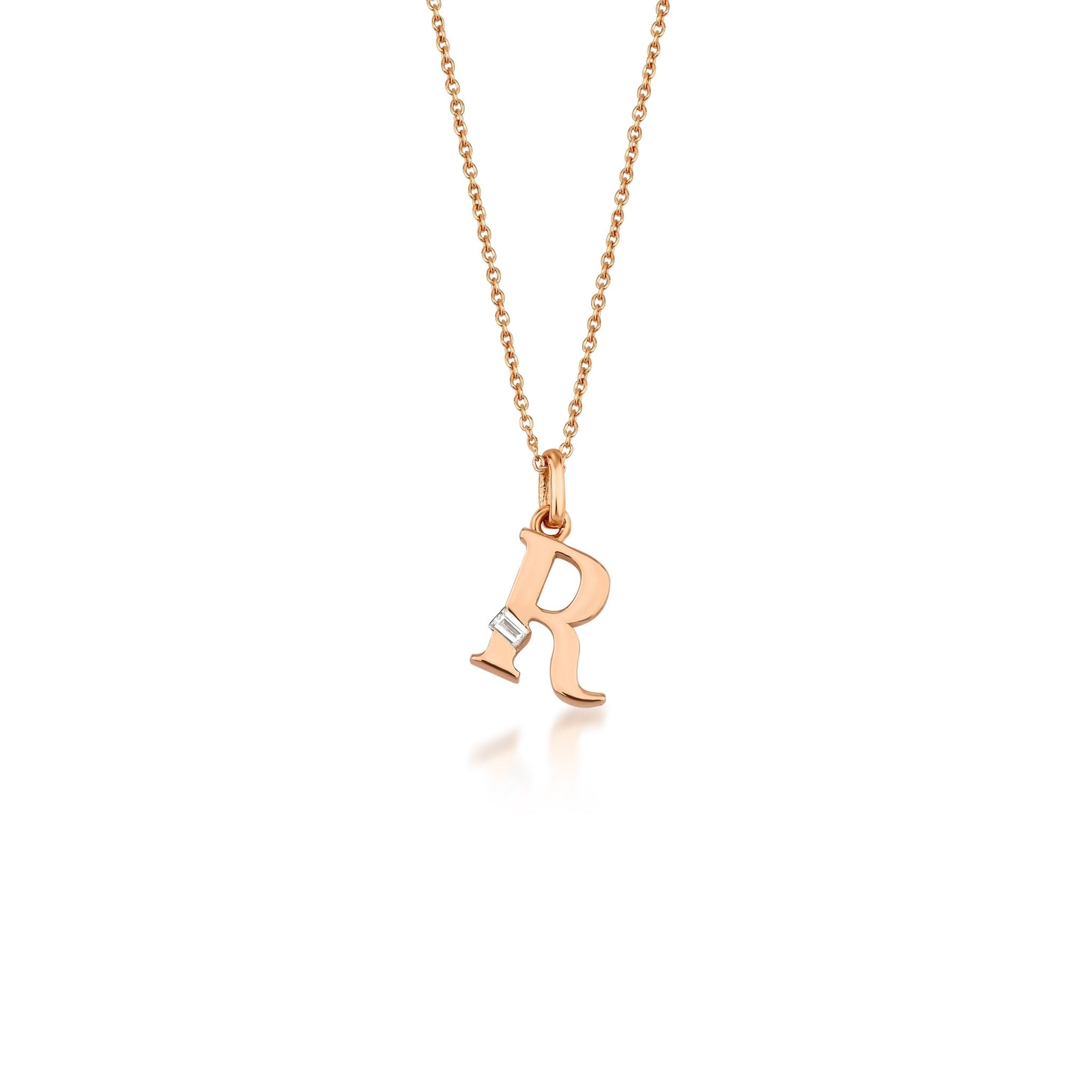 0.04 Karat Baget Pırlanta Harfli Kolye modeli, yaklaşık 1.68 gr ağırlığında 14 Ayar Rose Altın kullanılarak özel olarak tasarlanmıştır.
