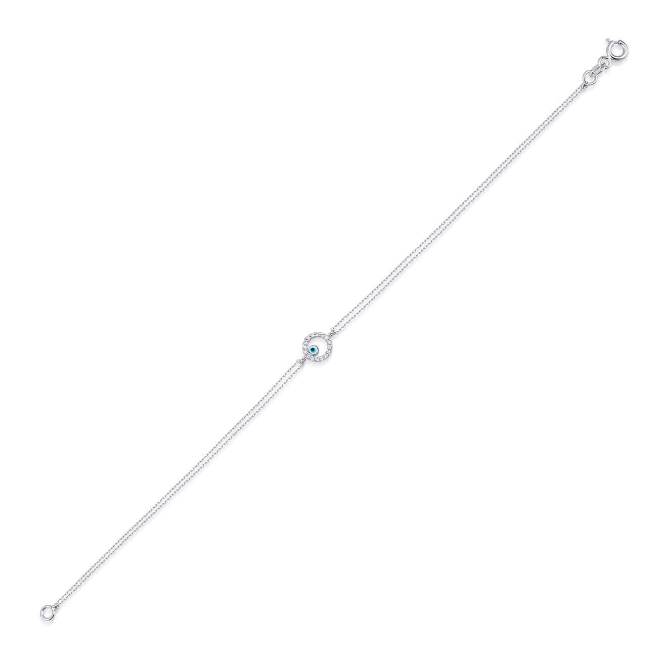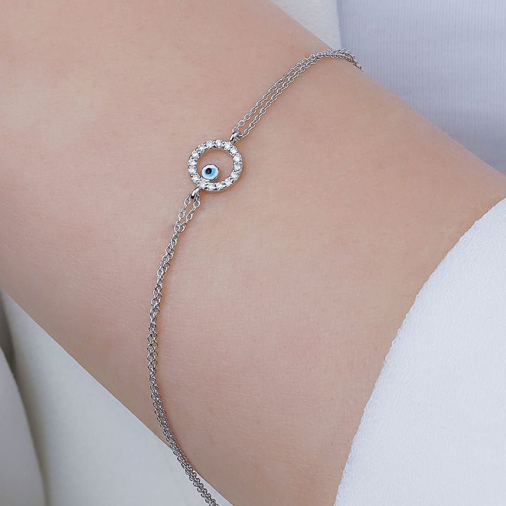 0.14 Karat Pırlantalı Nazar Boncuğu Bileklik modeli, yaklaşık 2.87 gr ağırlığında 14 Ayar Beyaz Altın kullanılarak özel olarak tasarlanmıştır.
