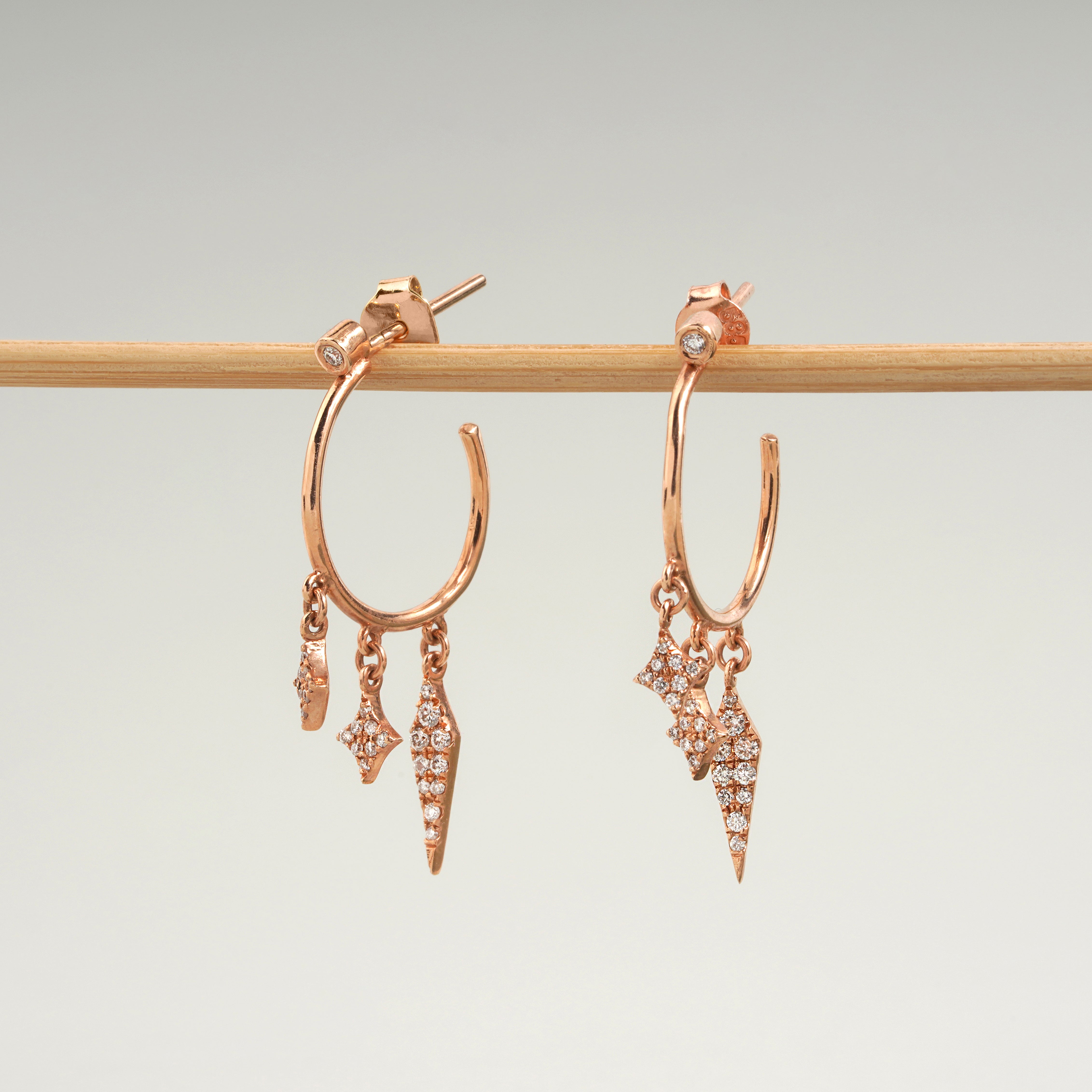 0.36 Karat Pırlanta Özel Tasarım Sallantılı Küpe modeli, yaklaşık 4.44 gr ağırlığında 14 Ayar Sarı Altın kullanılarak özel olarak tasarlanmıştır.