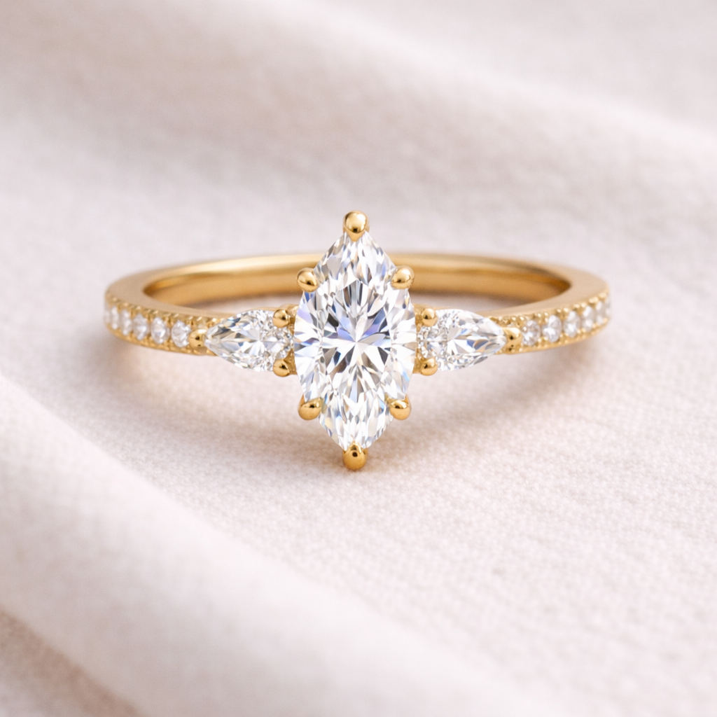 Markiz Kesim Tektaş Yüzük modeli, 14 Ayar Sarı Altın kullanılarak özel olarak tasarlanmıştır.