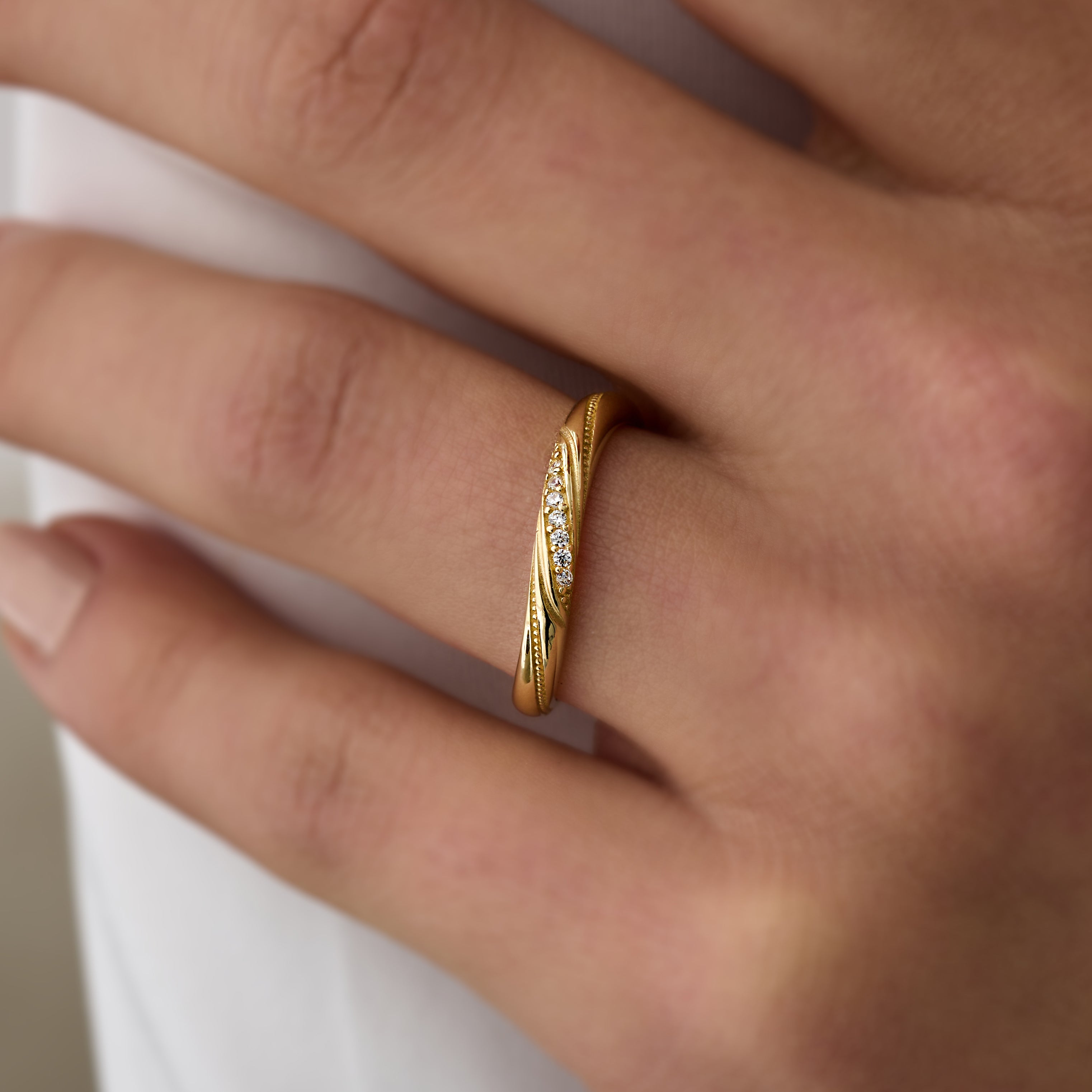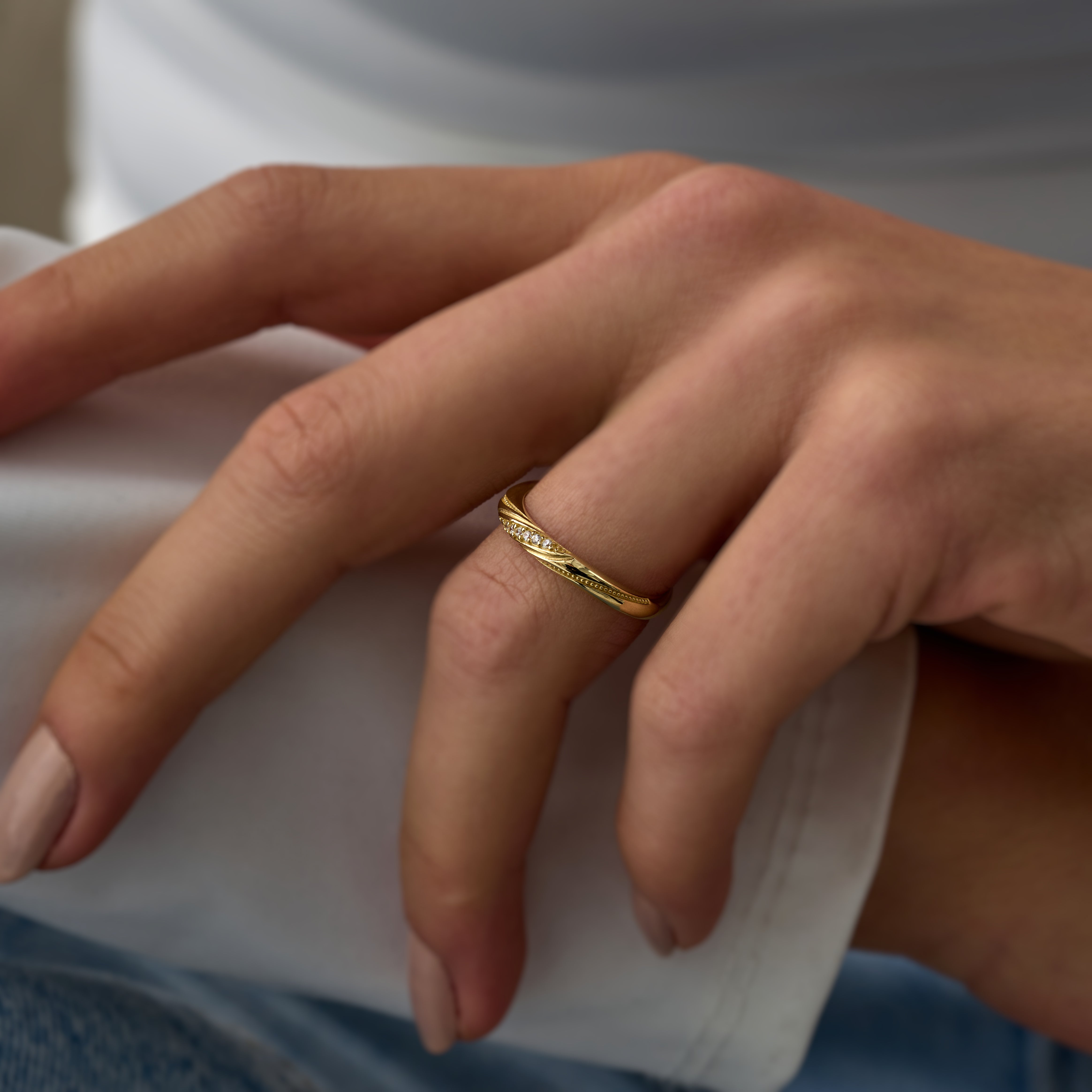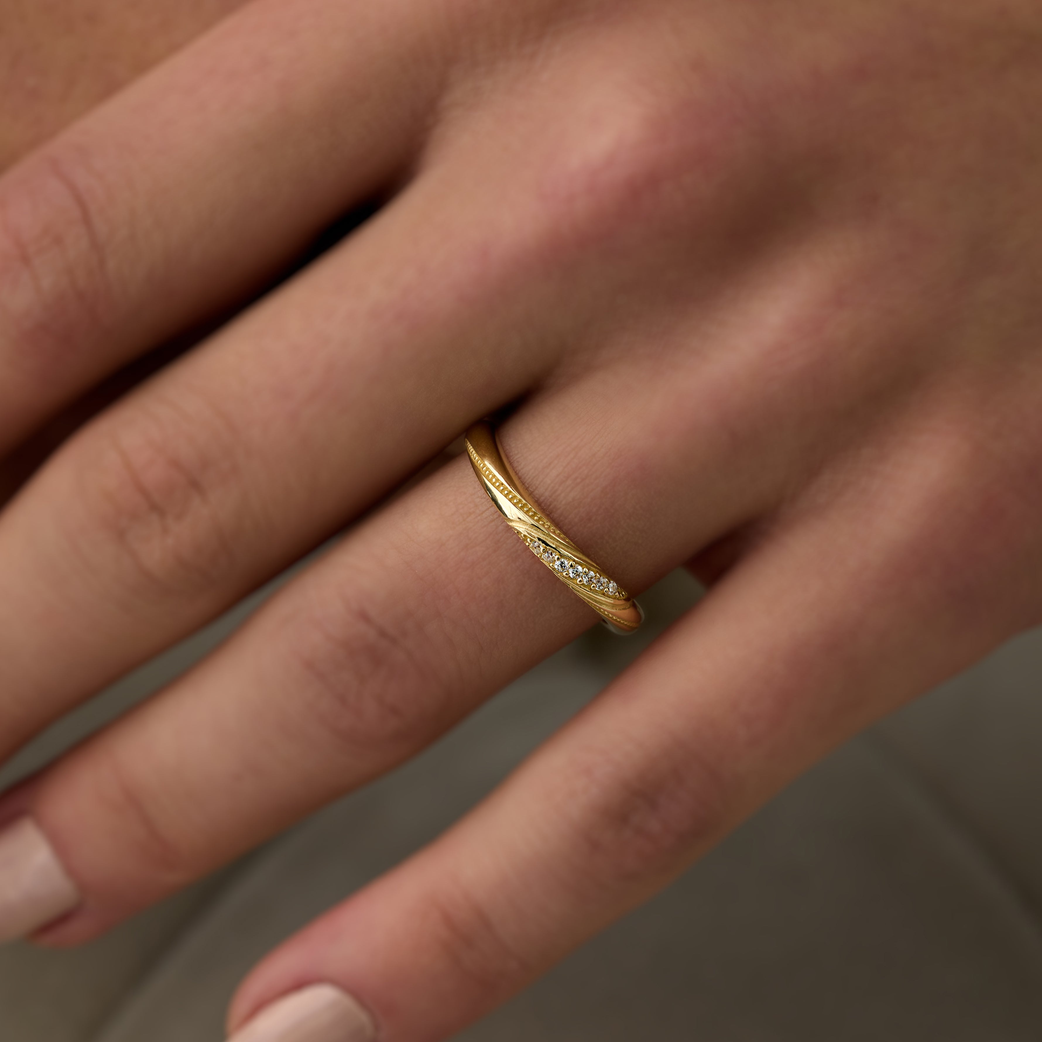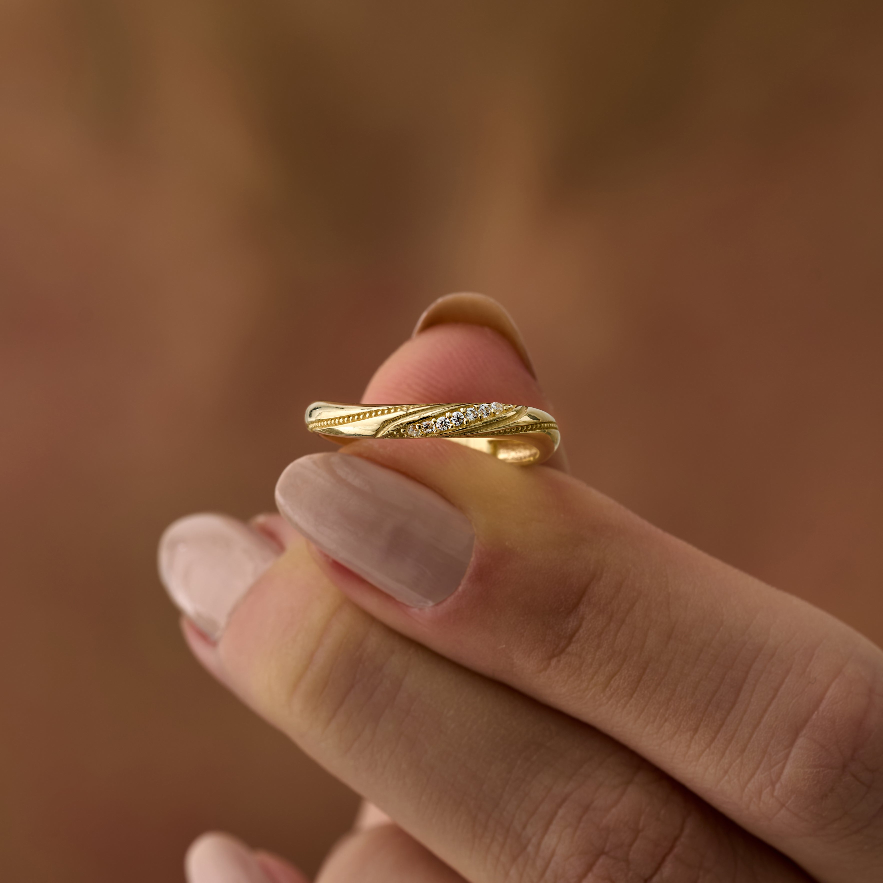 Kıvrımlı Pırlantalı Vintage Yüzük modeli, yaklaşık 1.78 gr ağırlığında 14 Ayar Sarı Altın kullanılarak özel olarak tasarlanmıştır.