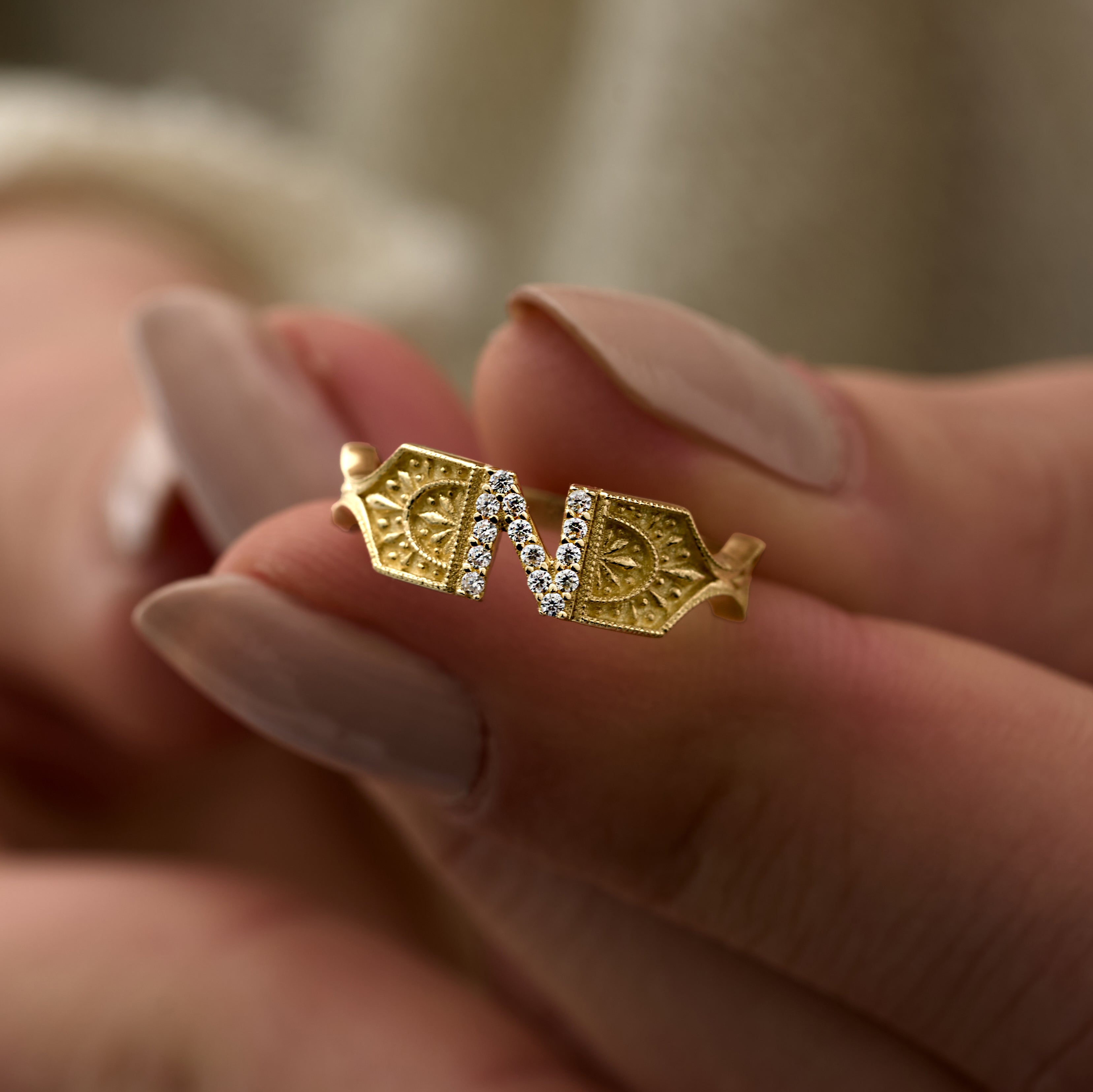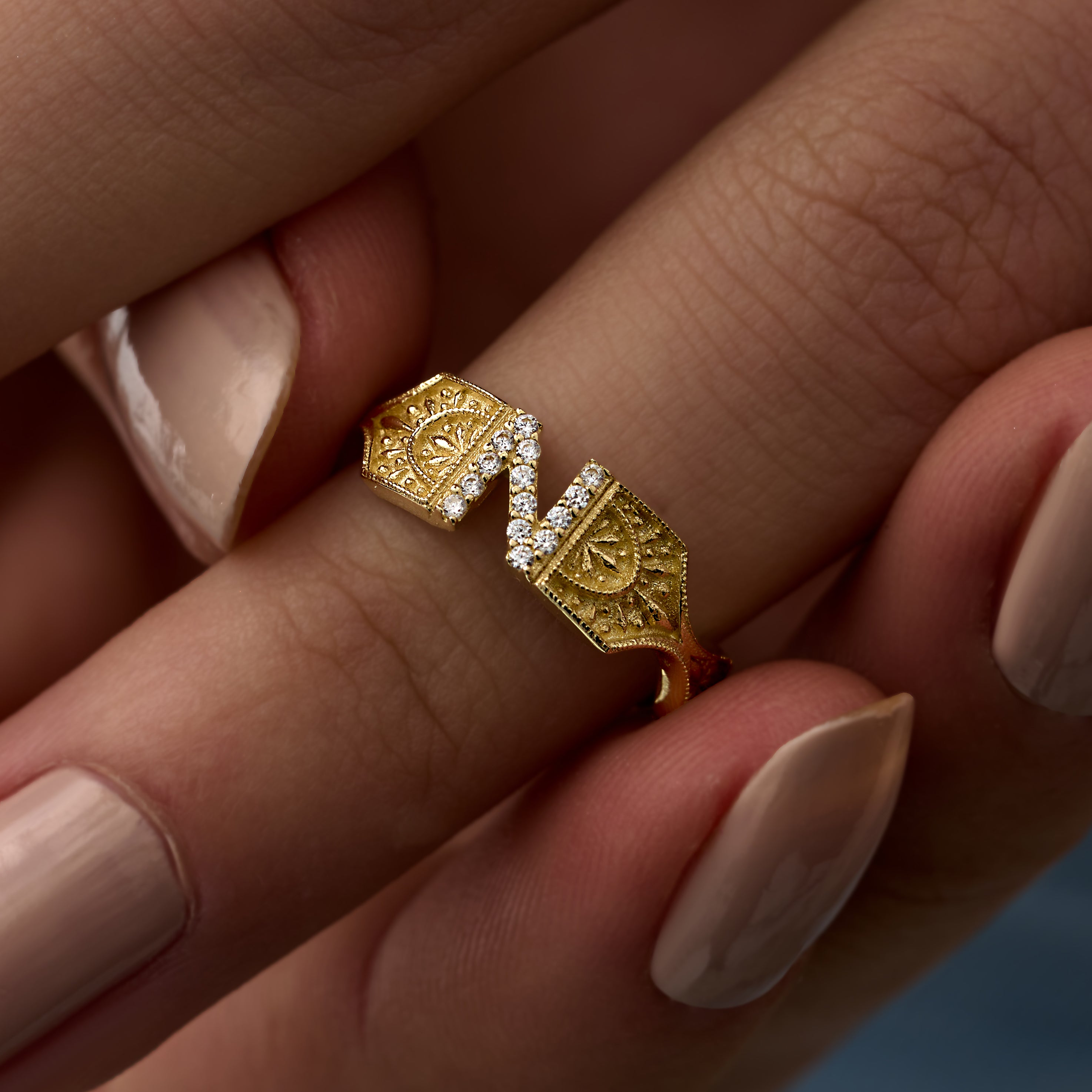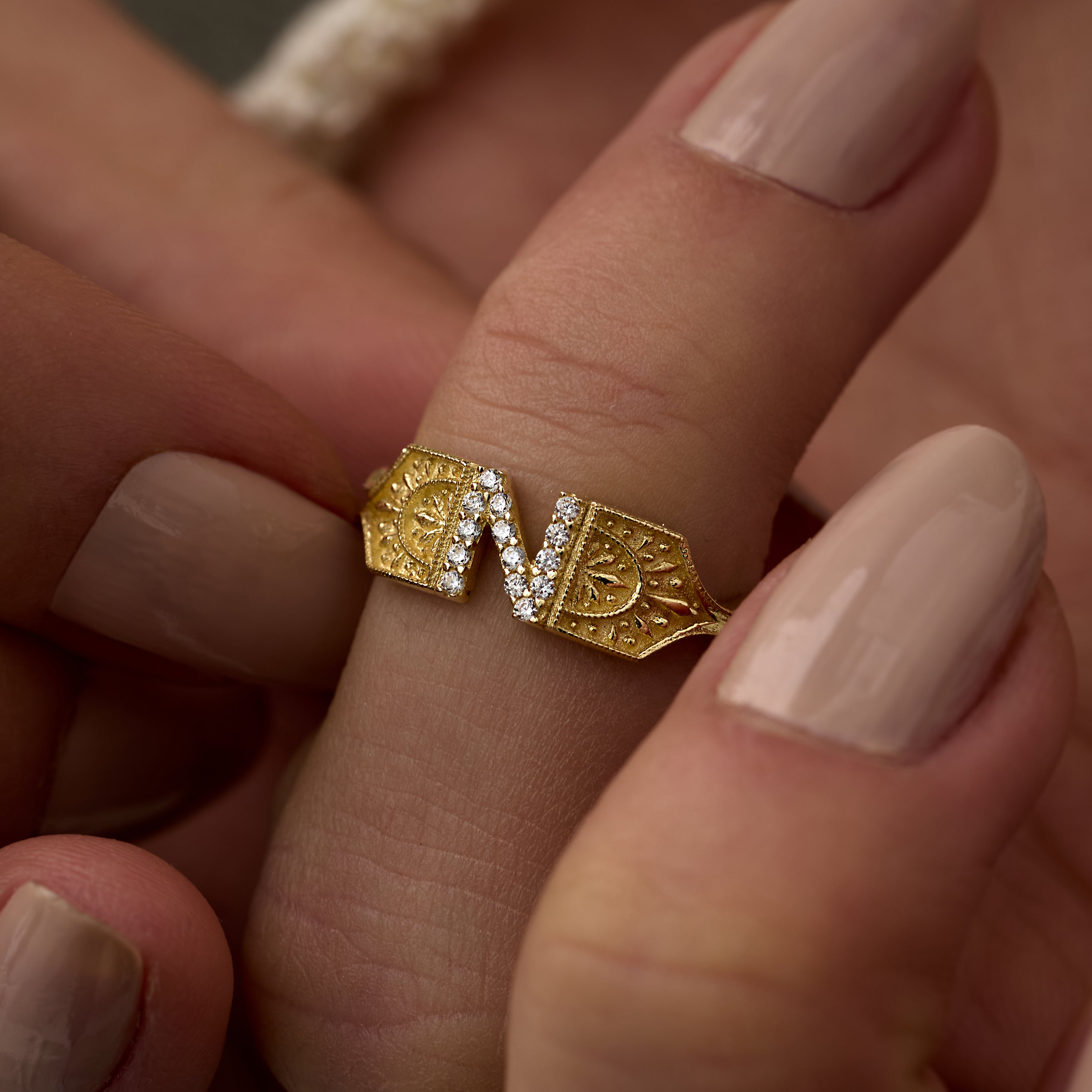 Vintage N Harf Pırlanta Yüzük modeli, yaklaşık 1.79 gr ağırlığında 14 Ayar Sarı Altın kullanılarak özel olarak tasarlanmıştır.