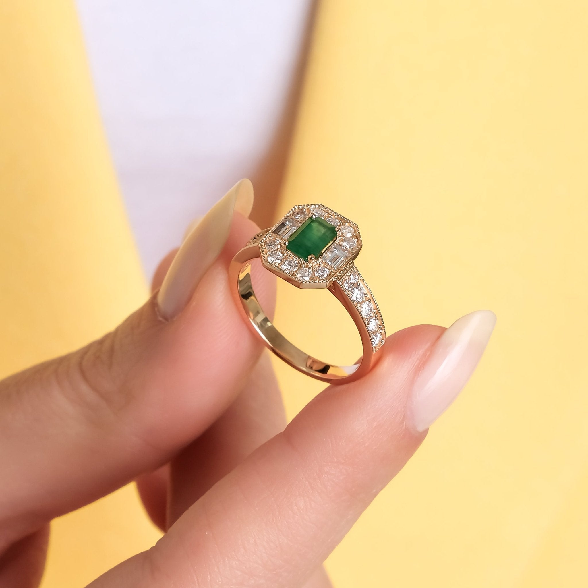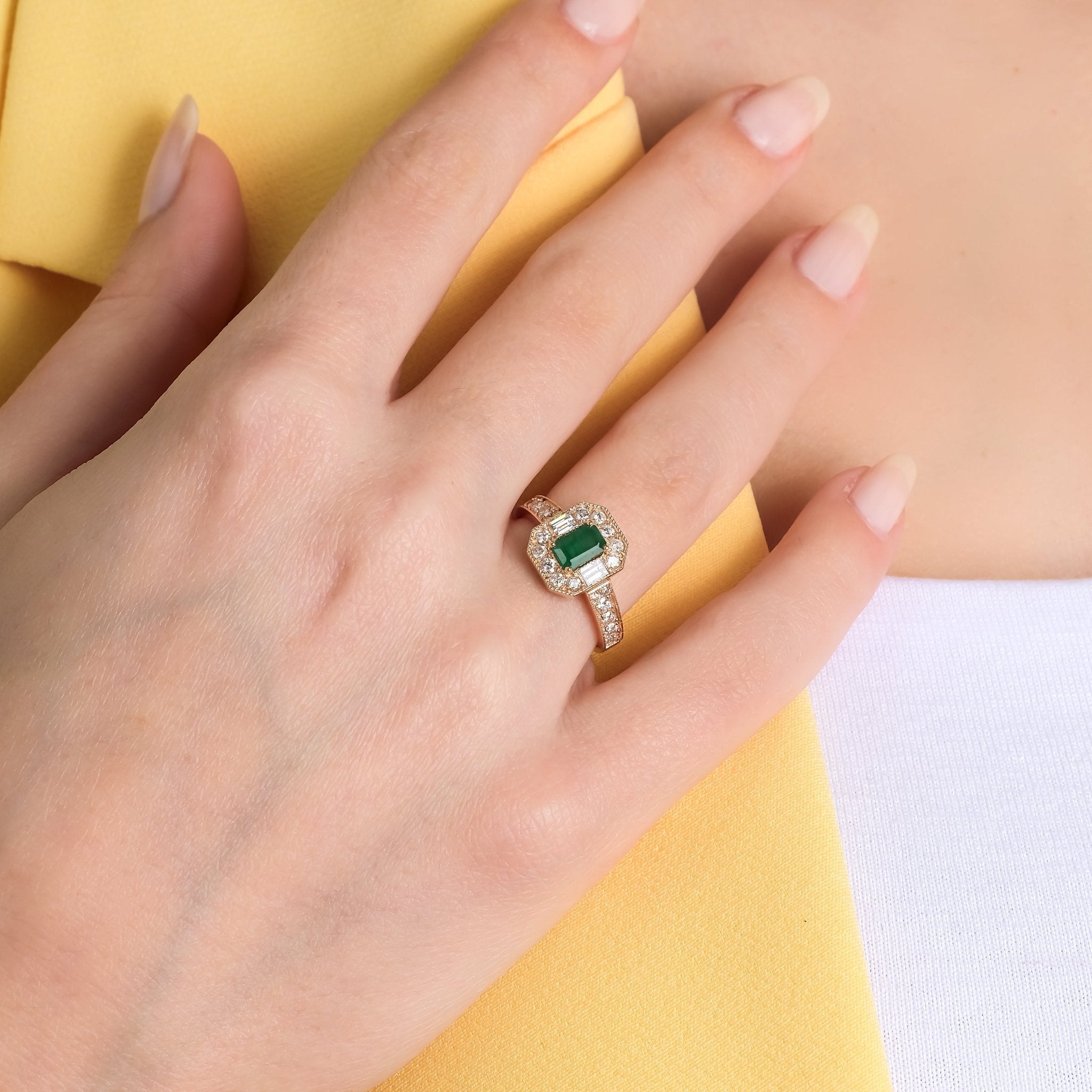 0.80 Karat Zümrüt & 0.40 Karat Baget & 0.25 Karat Yuvarlak Pırlanta Yüzük - RNF01020