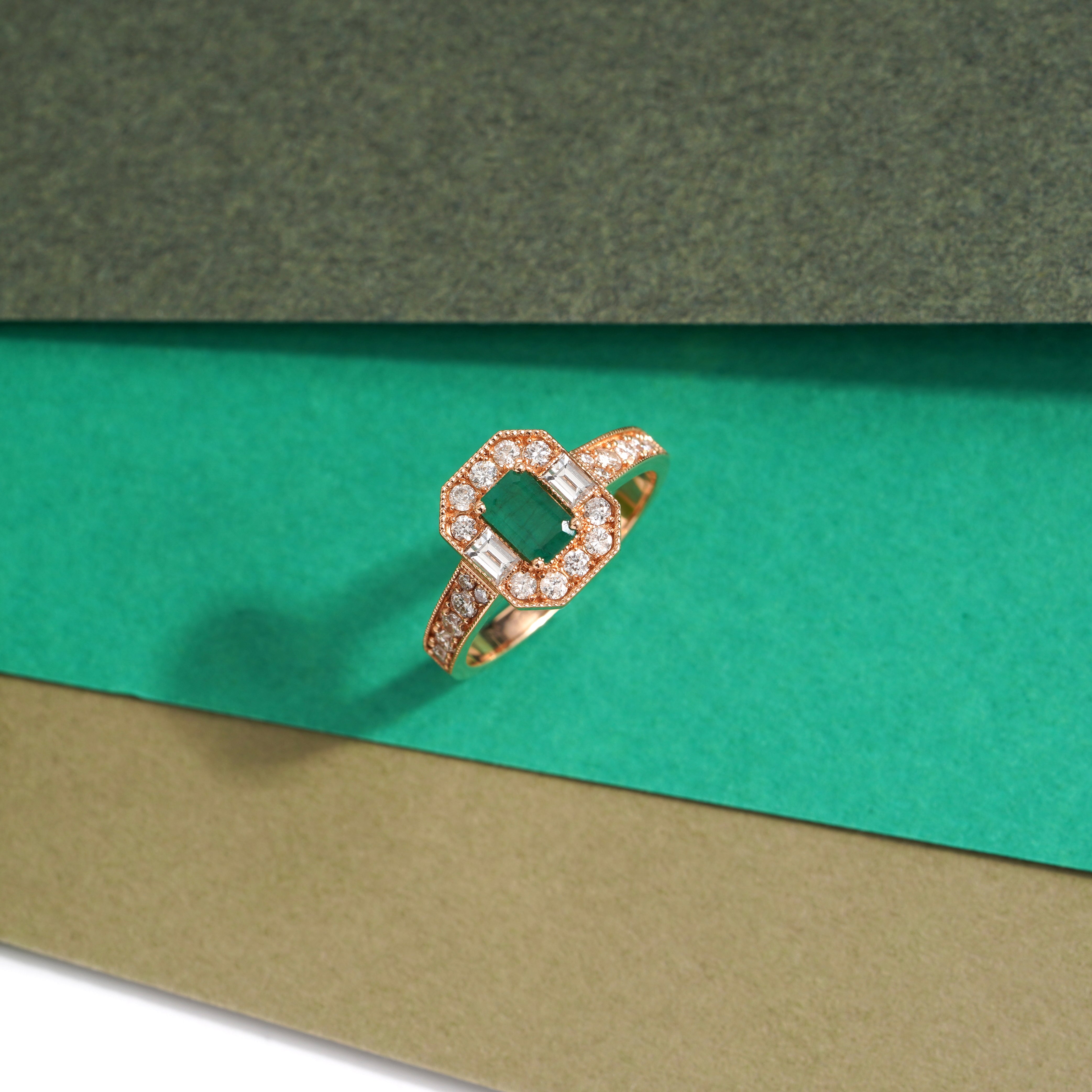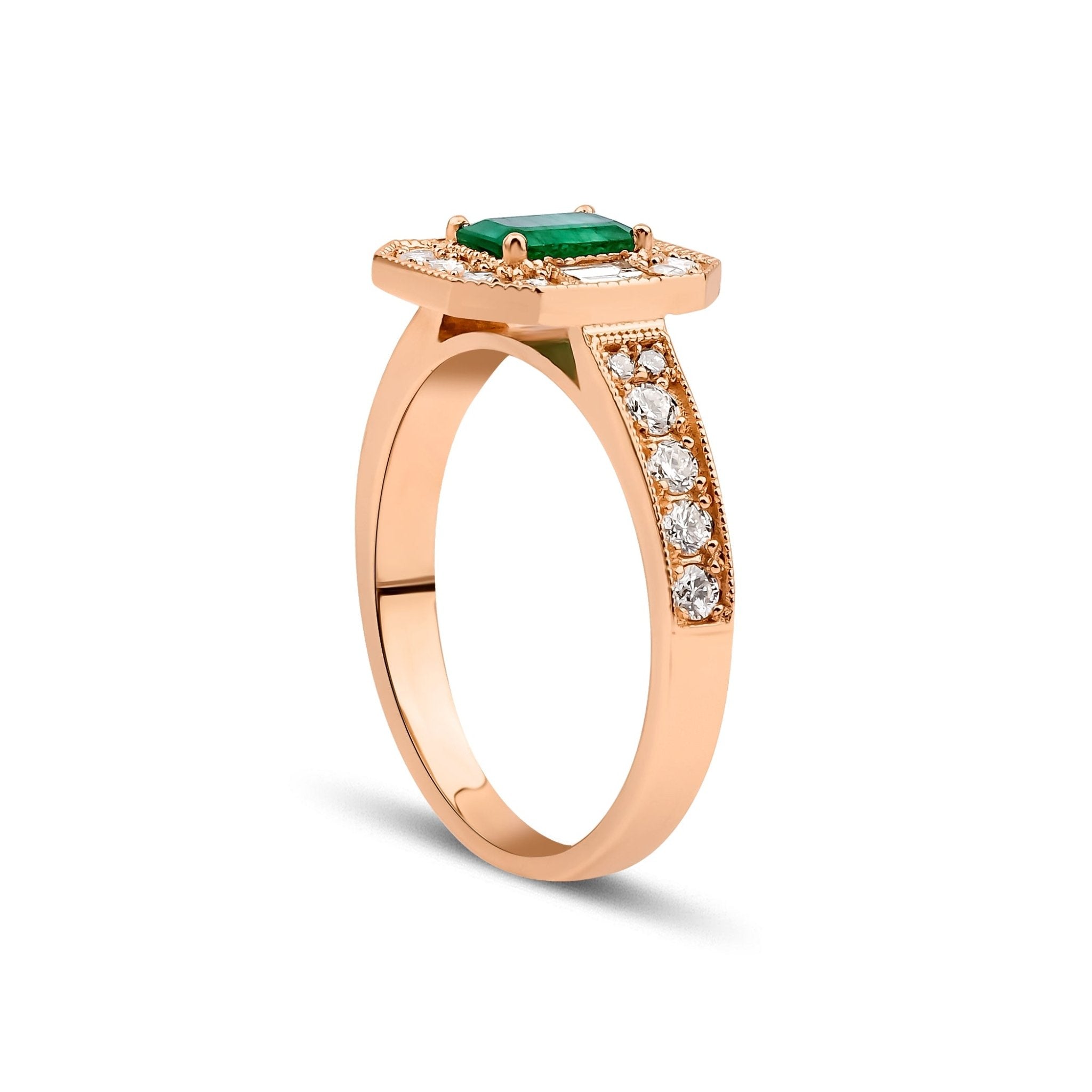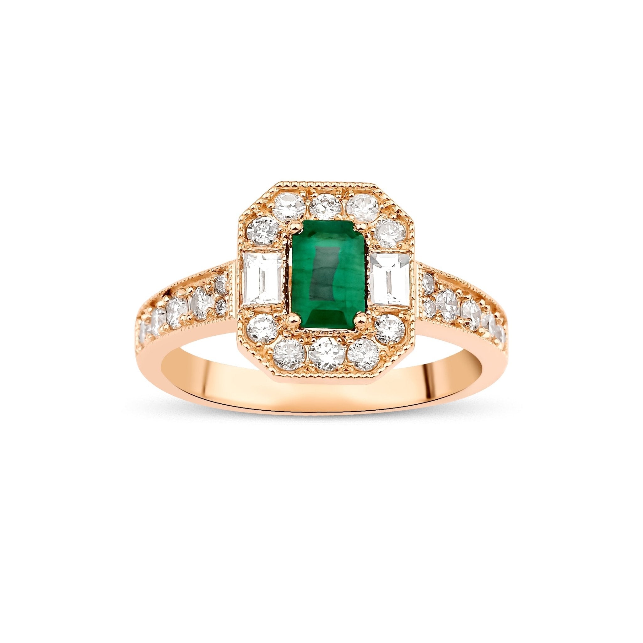 0.80 Karat Zümrüt & 0.40 Karat Baget & 0.25 Karat Yuvarlak Pırlanta Yüzük modeli, yaklaşık 3.20 gr ağırlığında 14 Ayar Rose Altın kullanılarak özel olarak tasarlanmıştır.