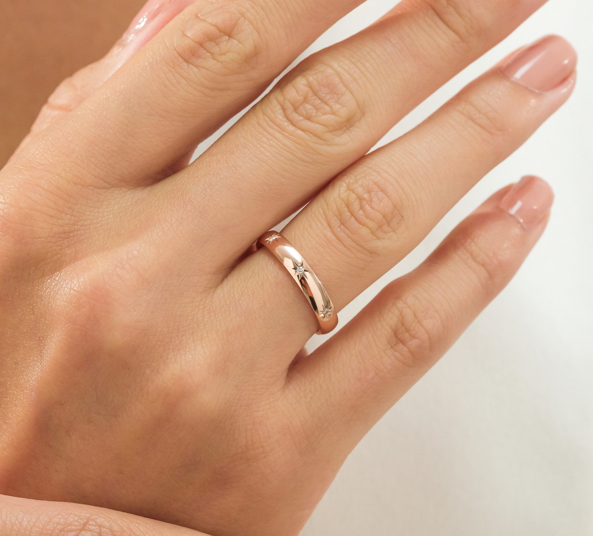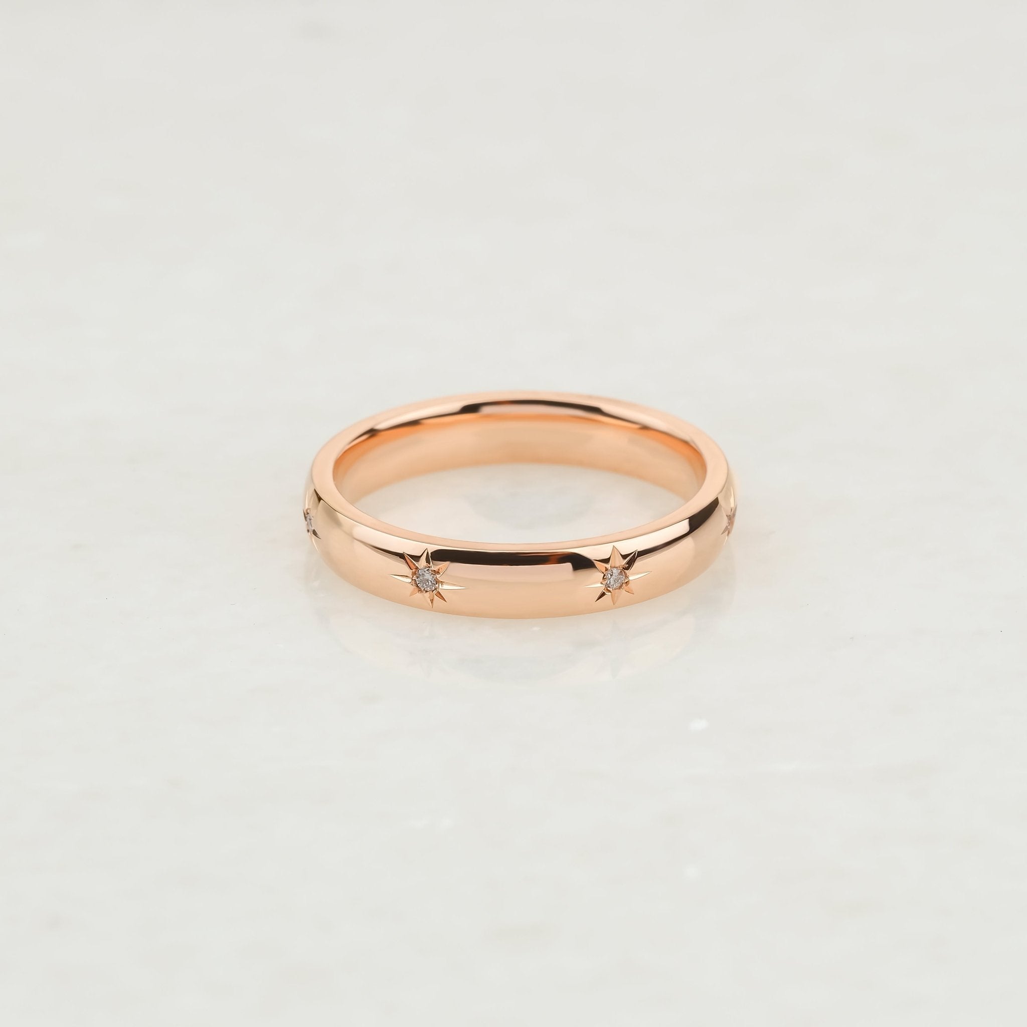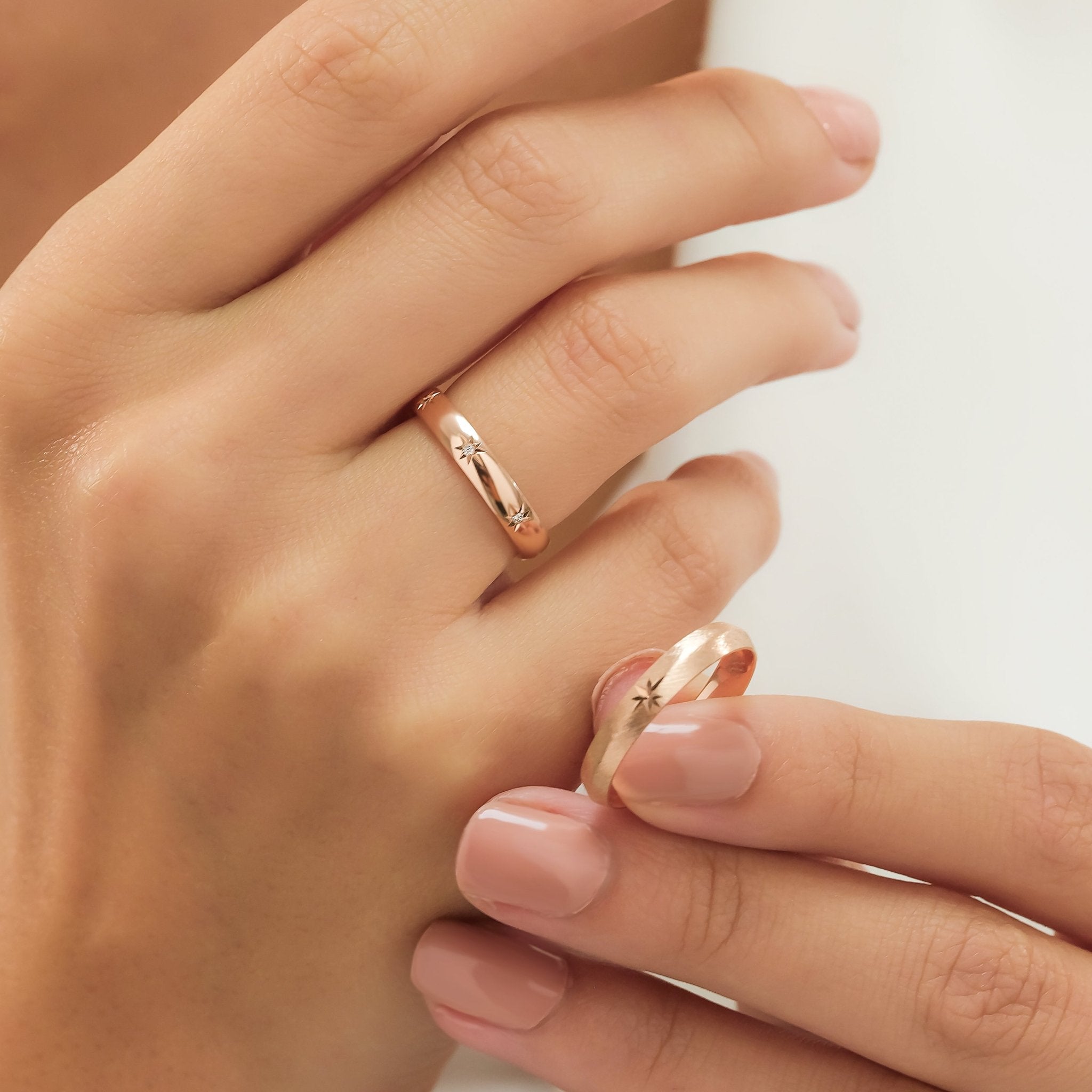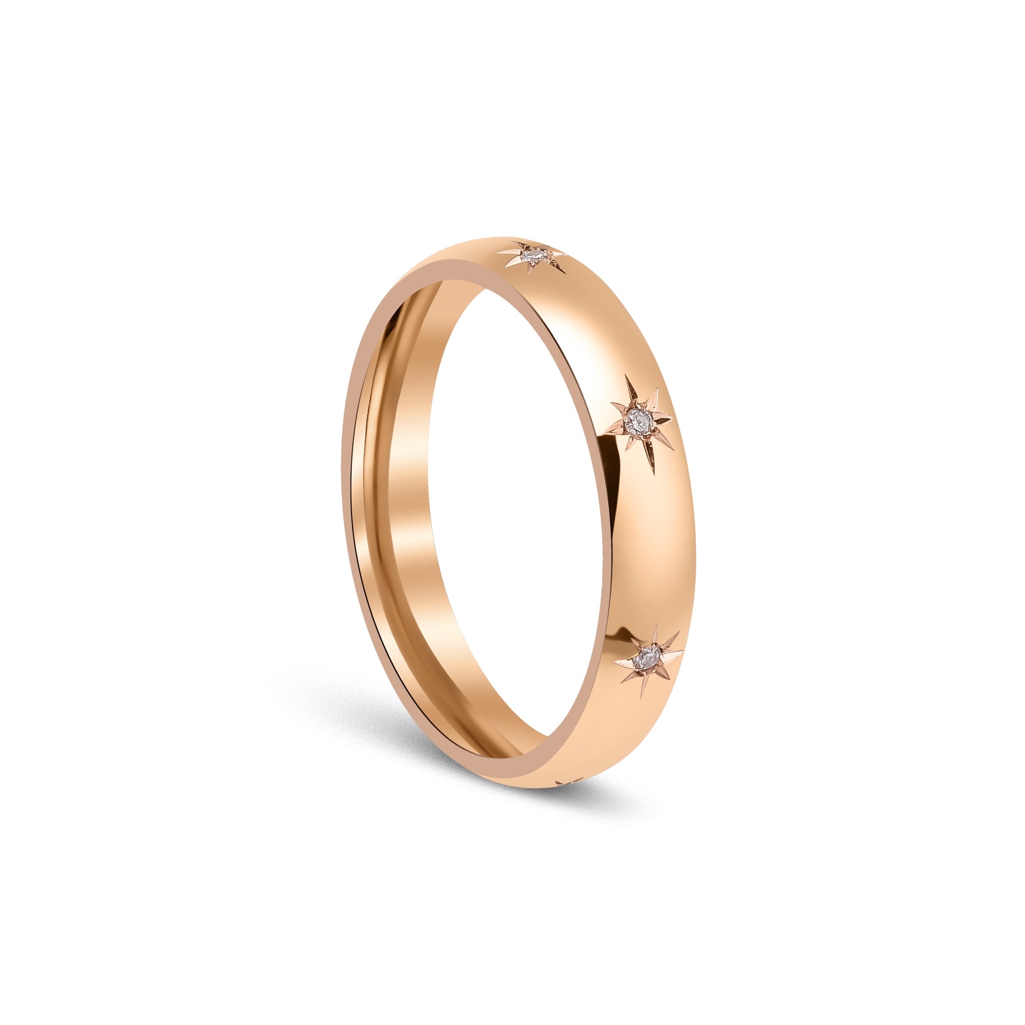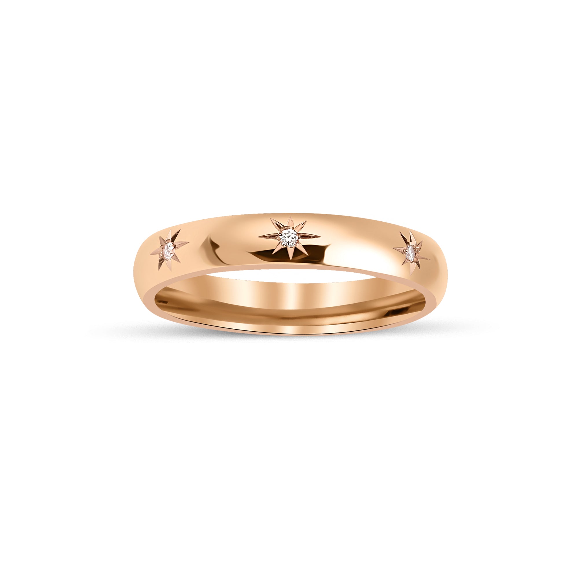 0.08 Karat Yuvarlak Kesim Pırlanta Kutup Yıldızı Desenli Bombeli Alyans modeli, yaklaşık 3.88 gr ağırlığında 14 Ayar Rose Altın kullanılarak özel olarak tasarlanmıştır.