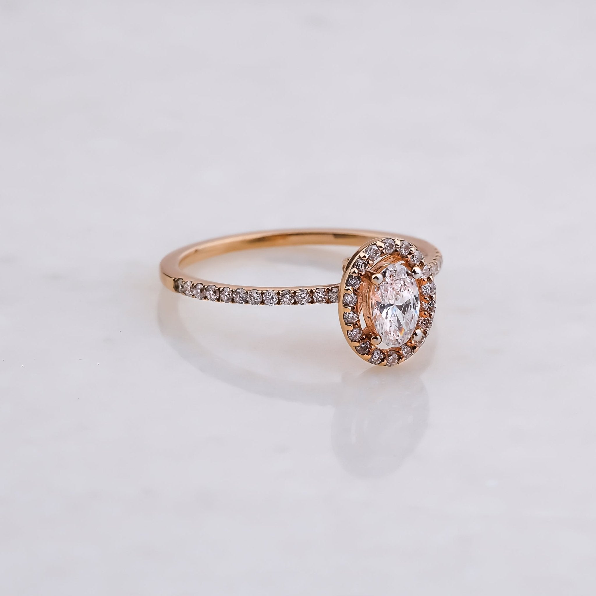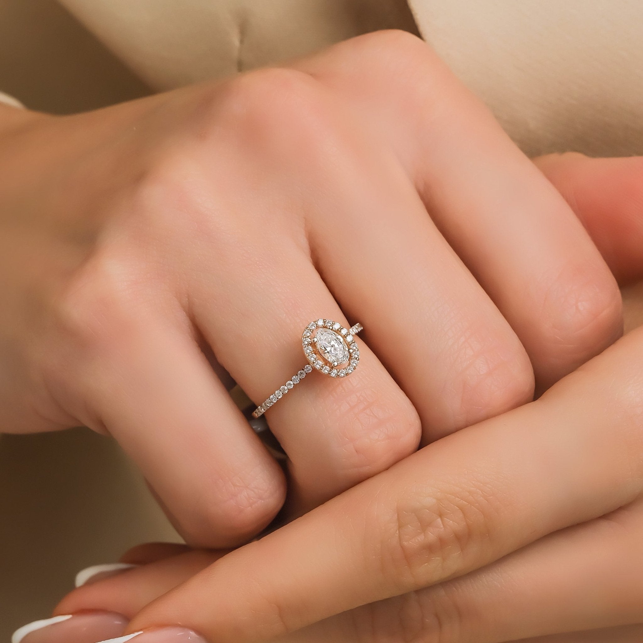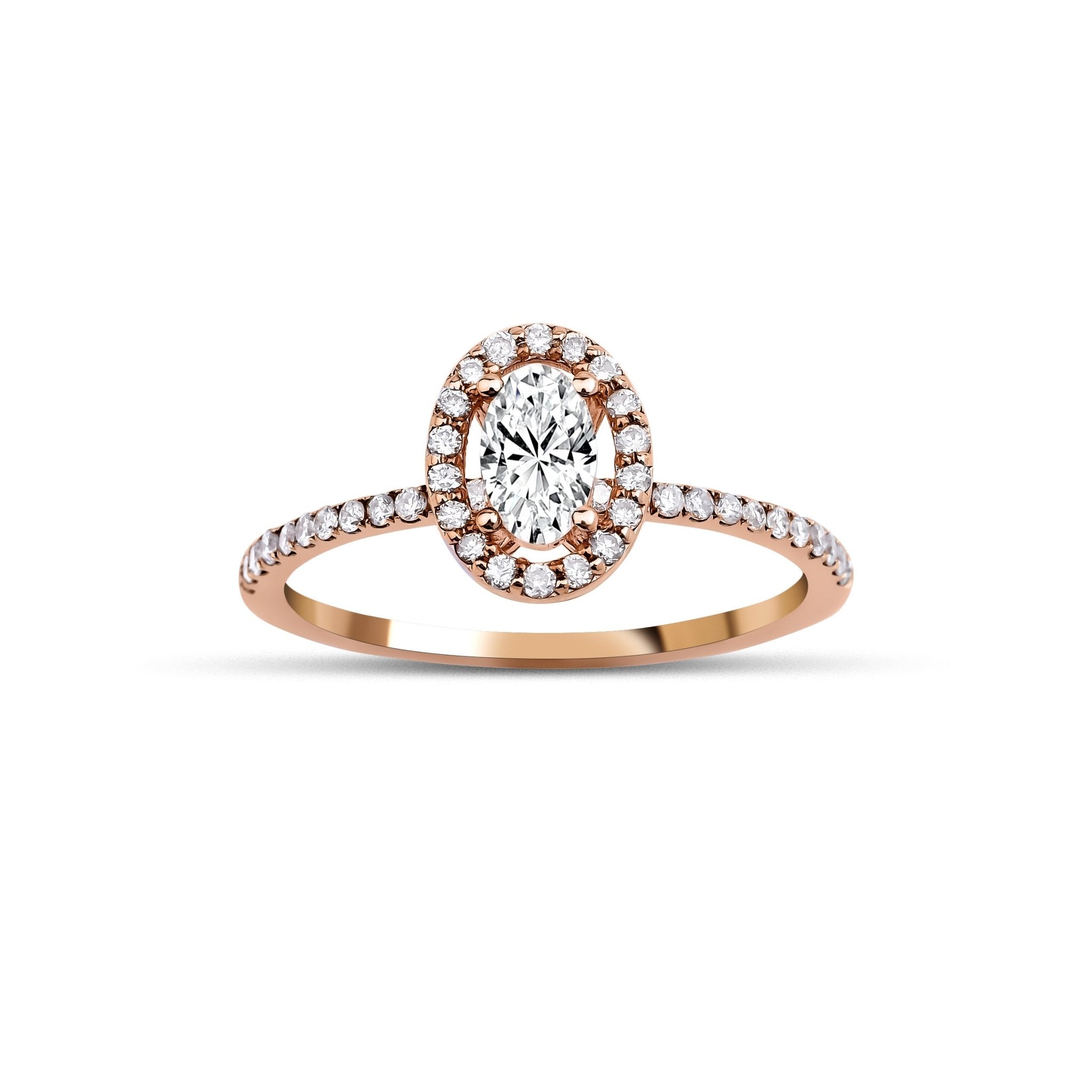 0.40 Karat Oval Merkez & 0.16 Karat Kenar Pırlanta Teklif Yüzüğü modeli, yaklaşık 2.33 gr ağırlığında 14 Ayar Rose Altın kullanılarak özel olarak tasarlanmıştır.