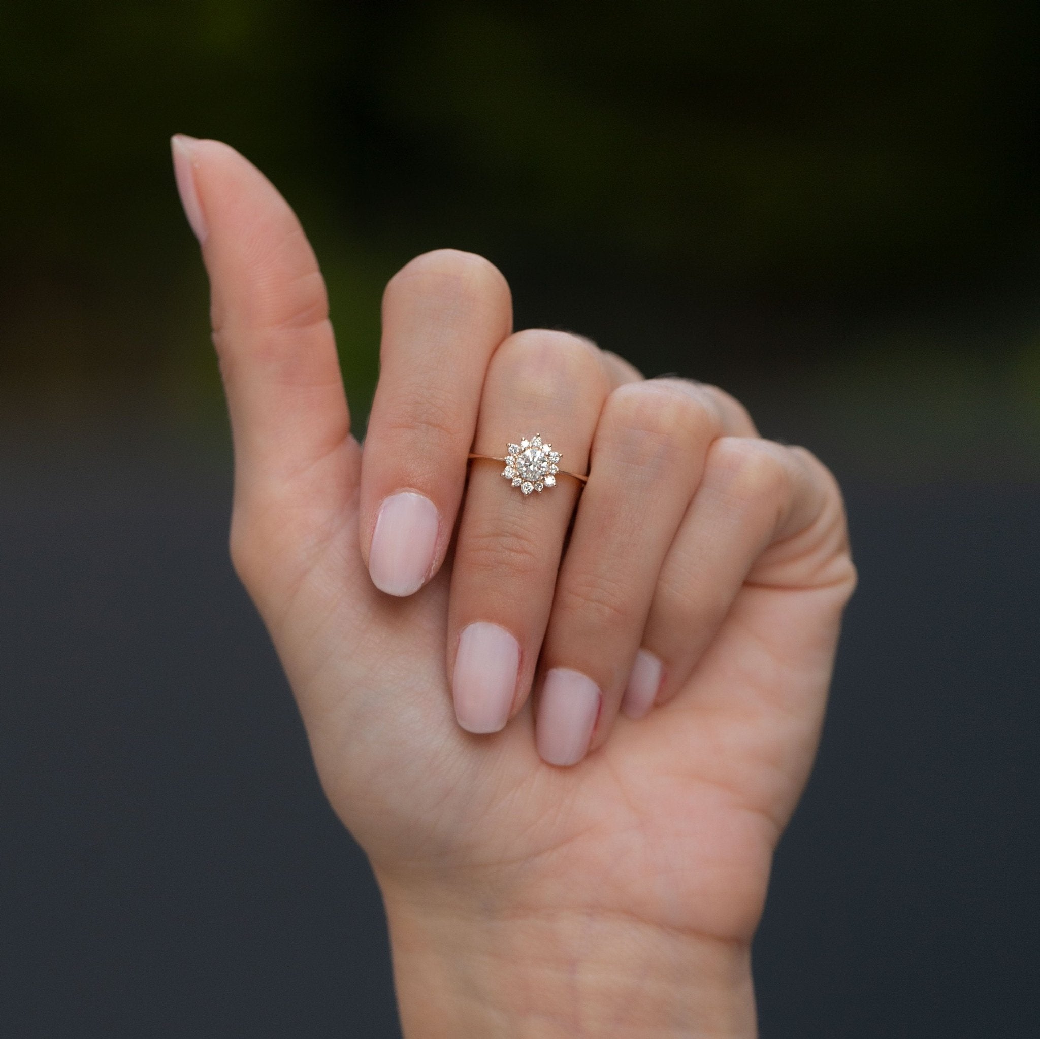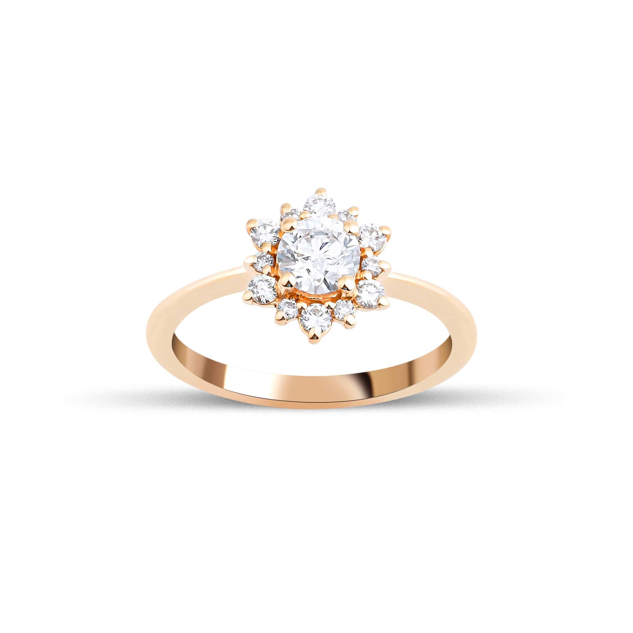 0.48 Karat Yuvarlak Kesim GIA/HRD Sertifikalı Çiçek Pırlanta Yüzük modeli, yaklaşık 2.48 gr ağırlığında 14 Ayar Rose Altın kullanılarak özel olarak tasarlanmıştır.
