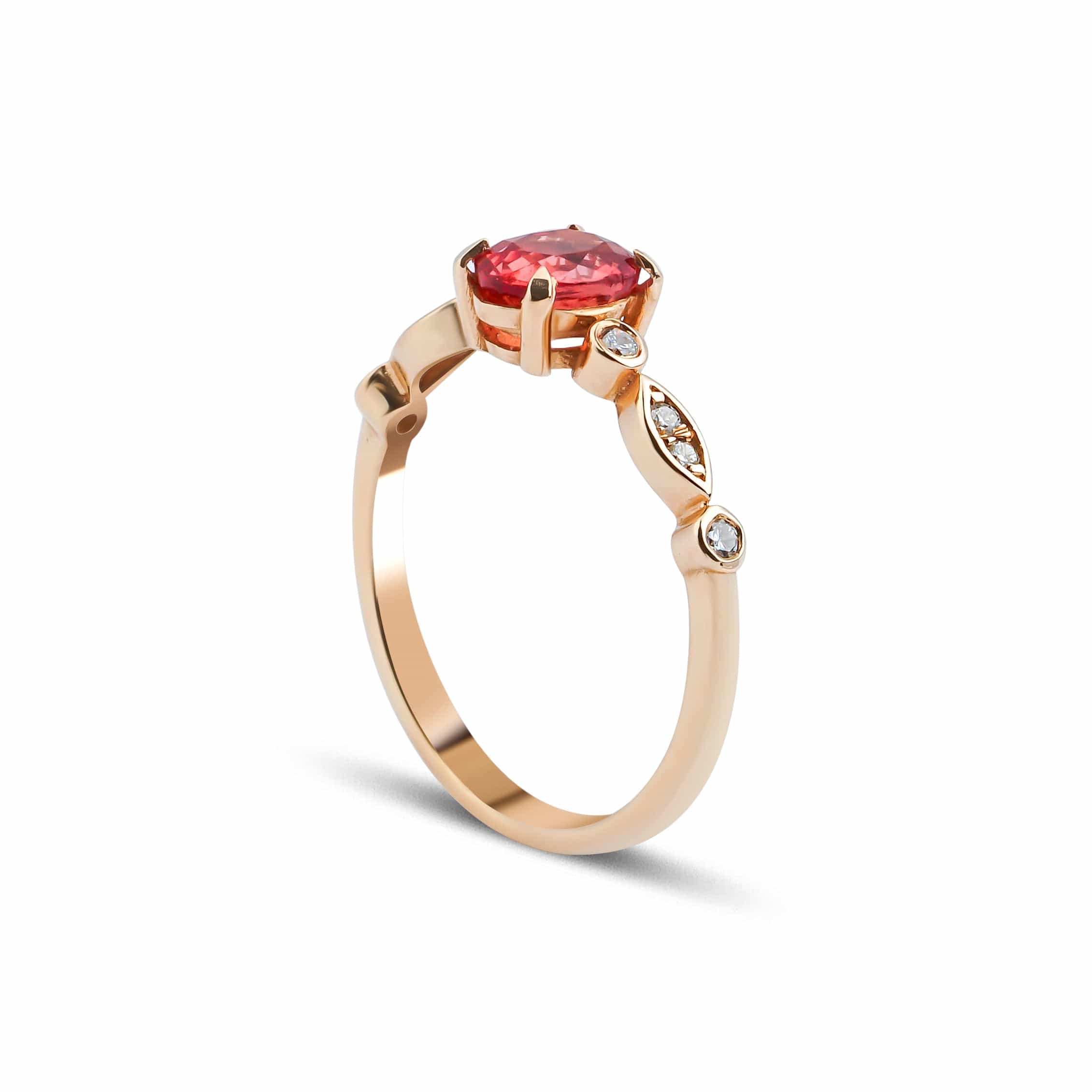 1.12 Karat Turuncu Safir Pırlantalı Yüzük  modeli, yaklaşık 2.30 gr ağırlığında 14 Ayar Rose Altın kullanılarak özel olarak tasarlanmıştır.