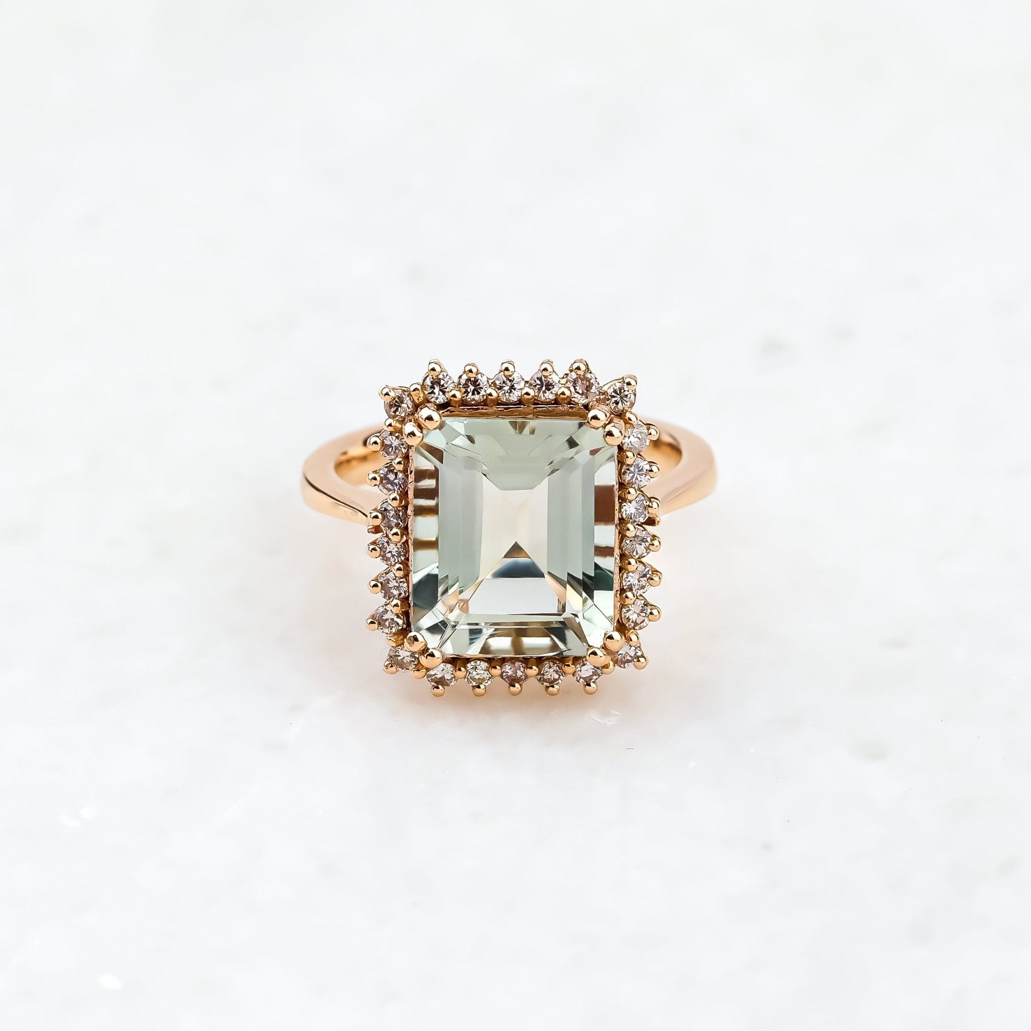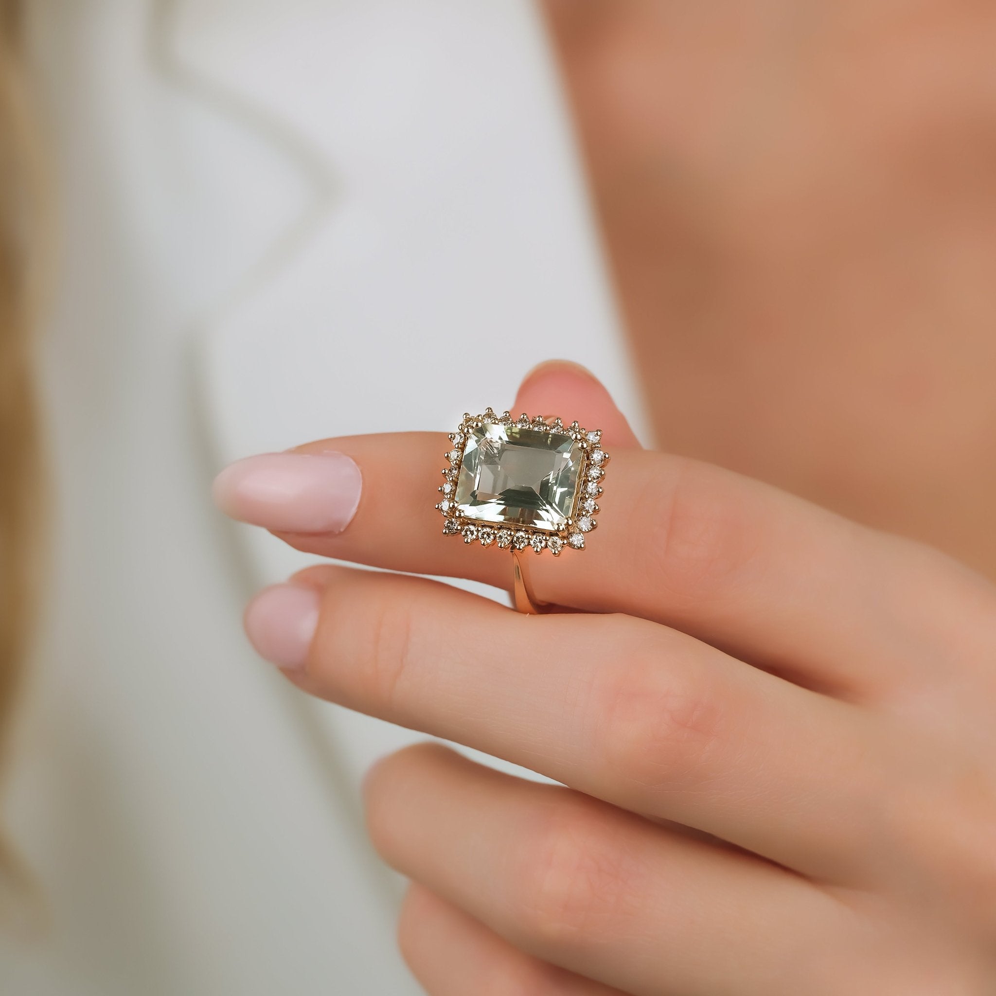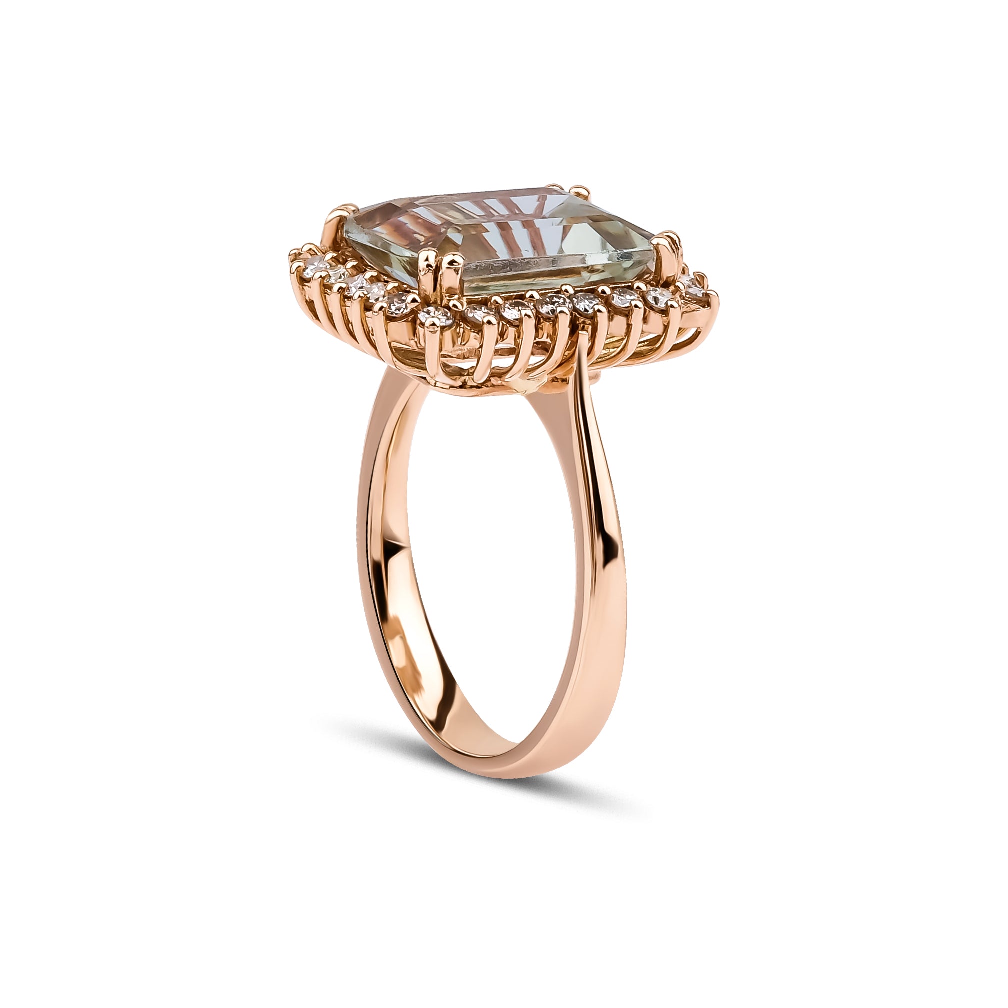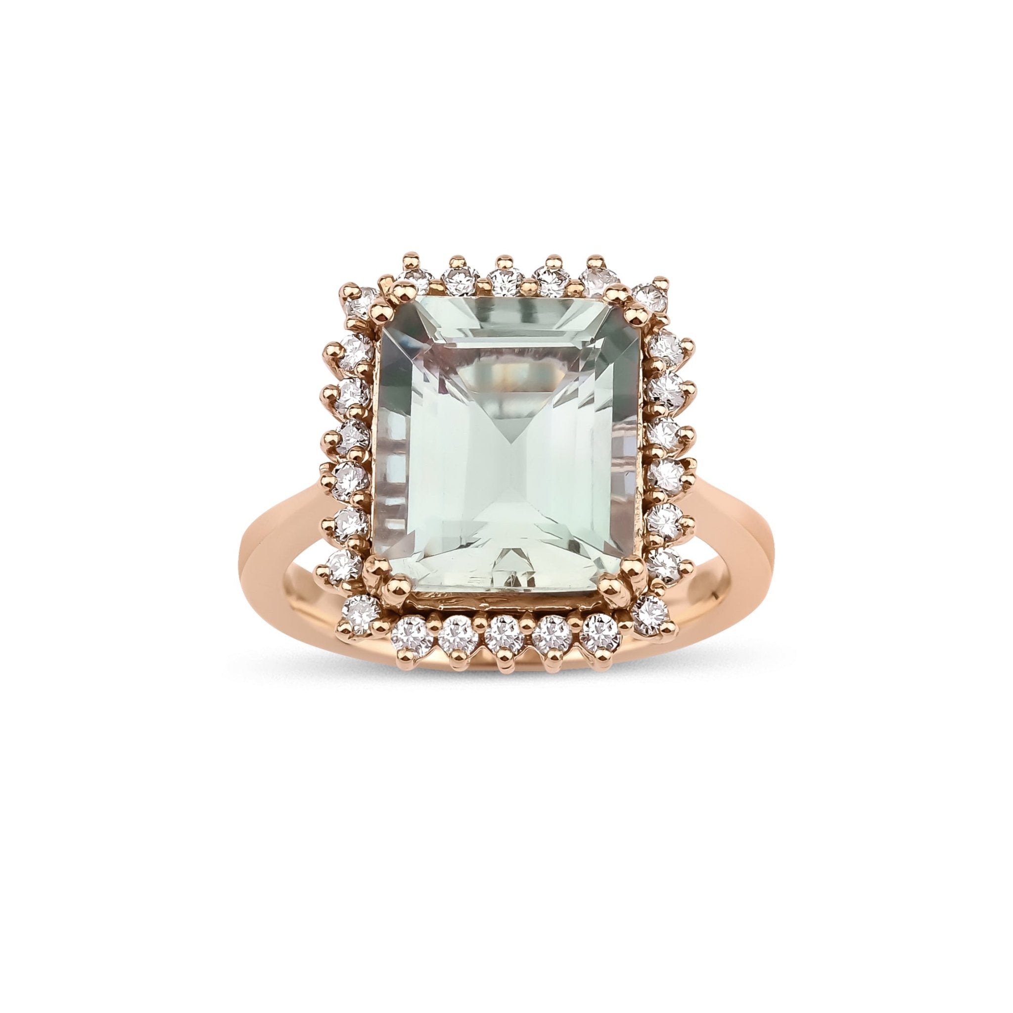 3.22 Karat Yeşil Ametist & 0.30 Karat Kenar Tasarım Pırlantalı Yüzük modeli, yaklaşık 3.25 gr ağırlığında 14 Ayar Rose Altın kullanılarak özel olarak tasarlanmıştır.