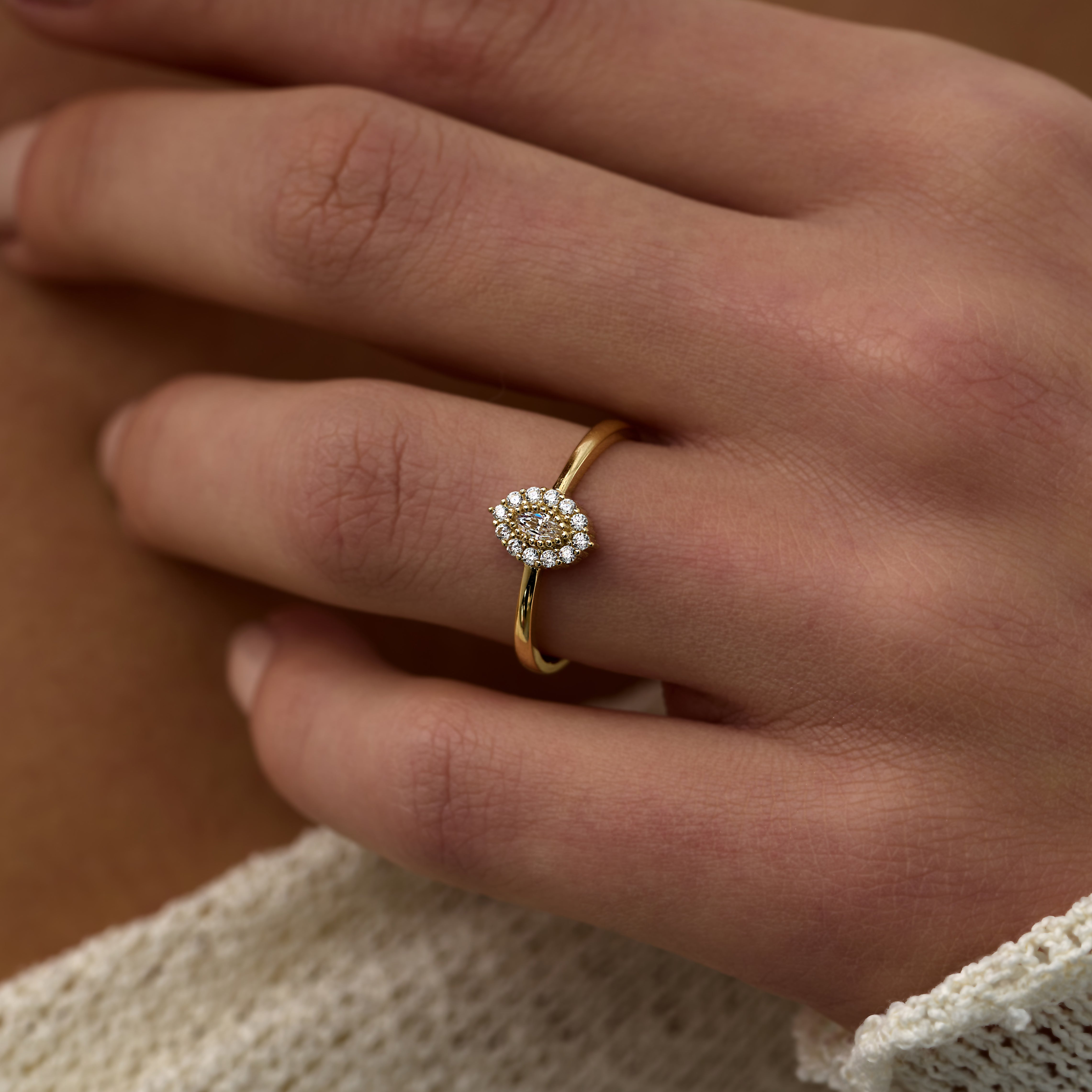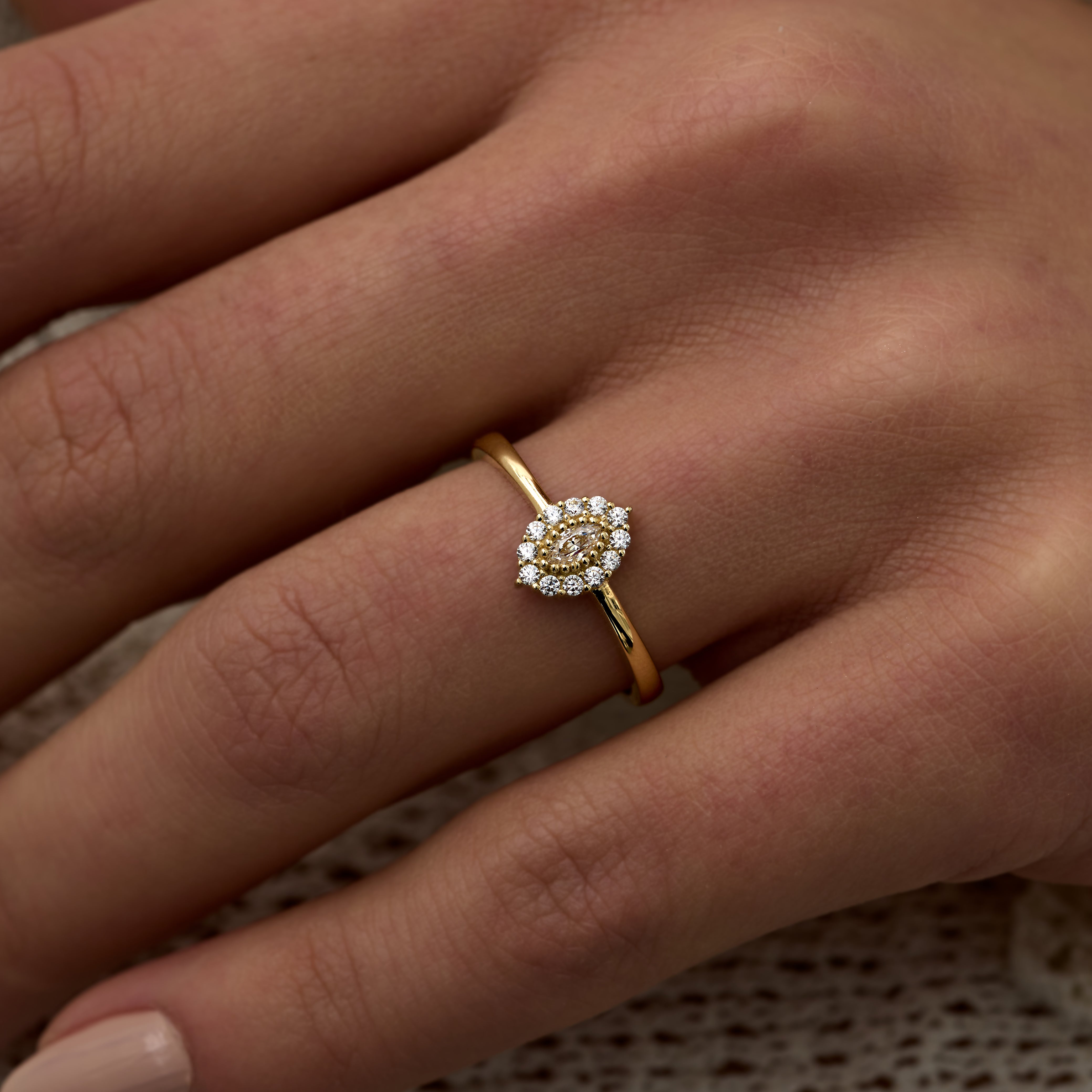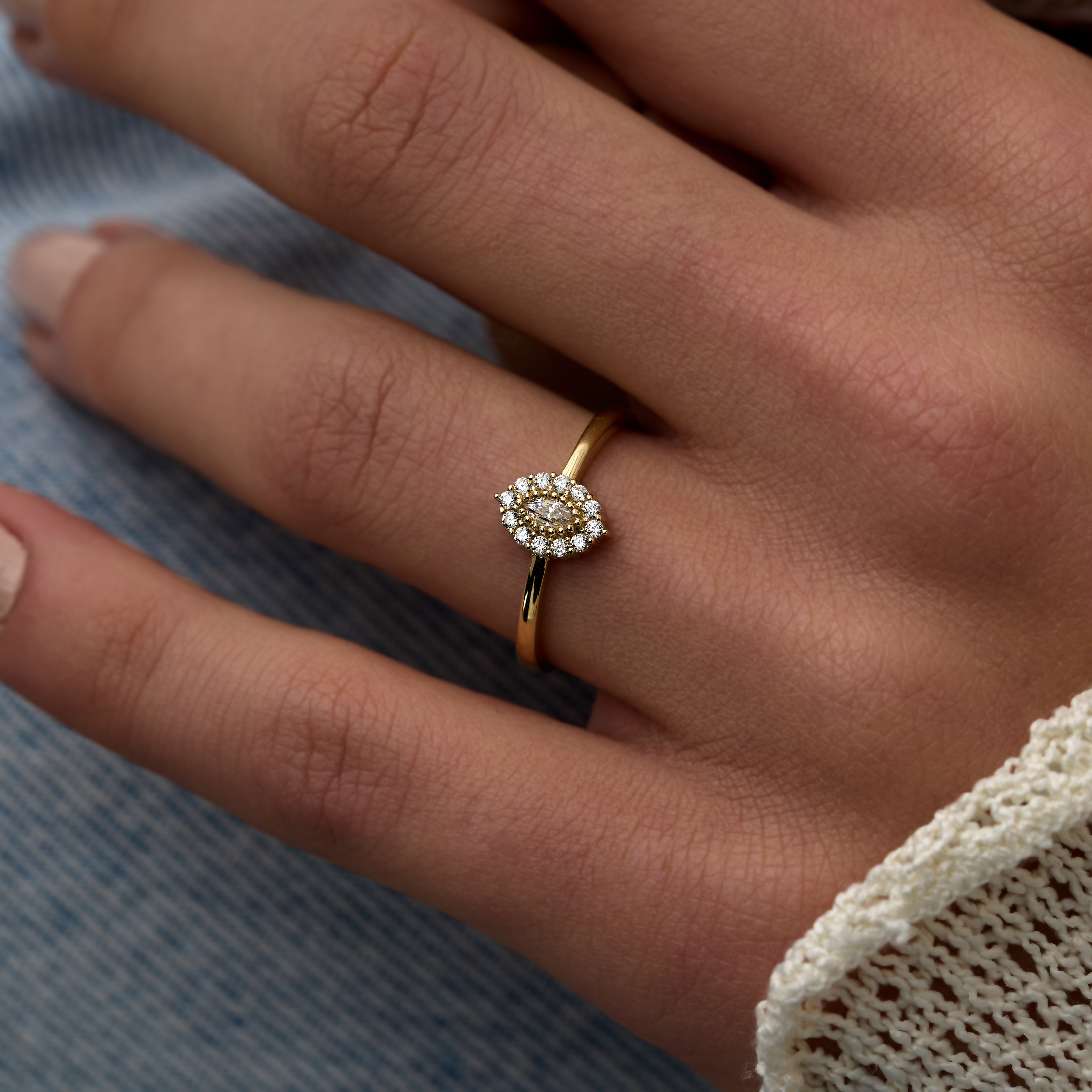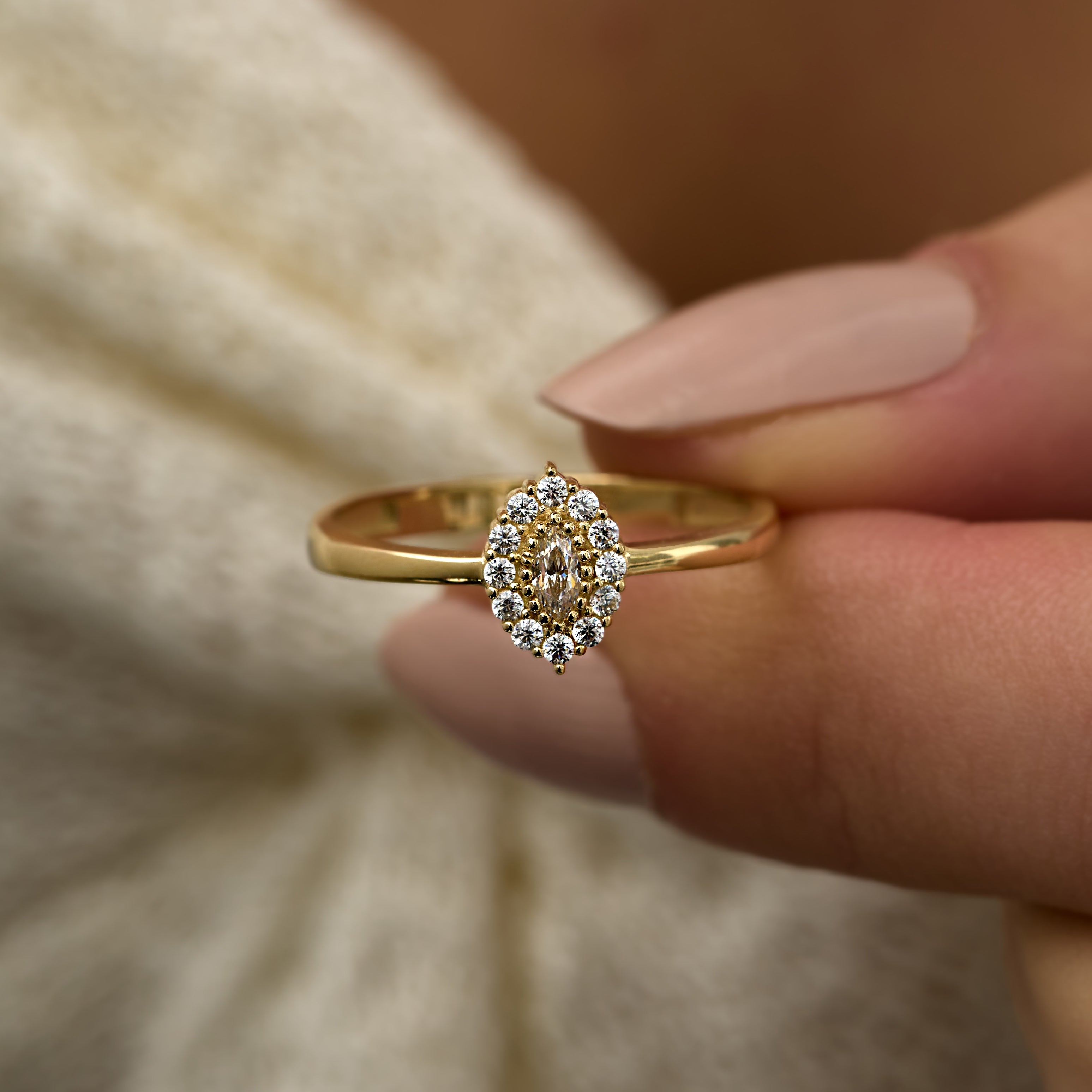 Markiz Kesim Quartz Pırlanta Yüzük modeli, yaklaşık 1.50 gr ağırlığında 14 Ayar Sarı Altın kullanılarak özel olarak tasarlanmıştır.