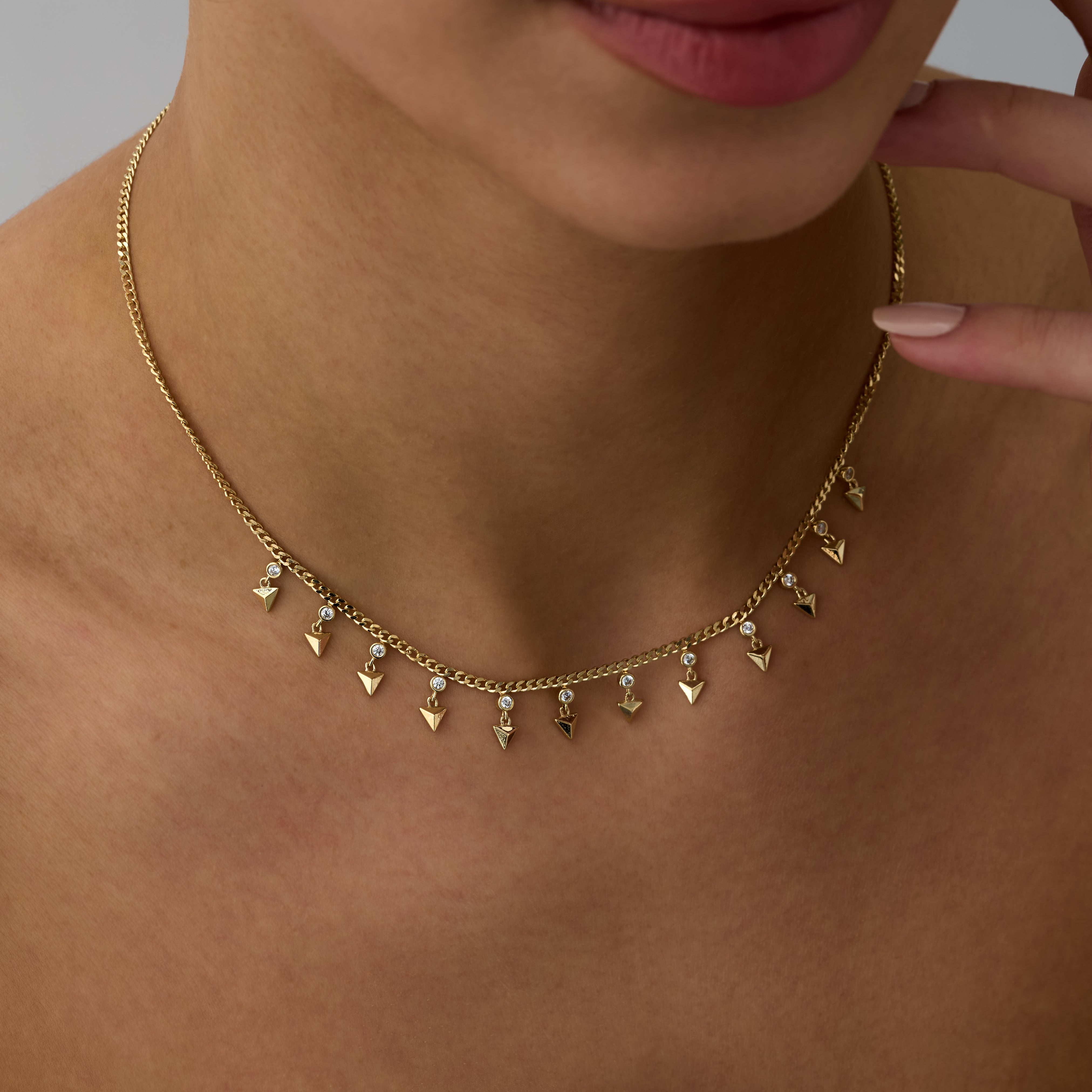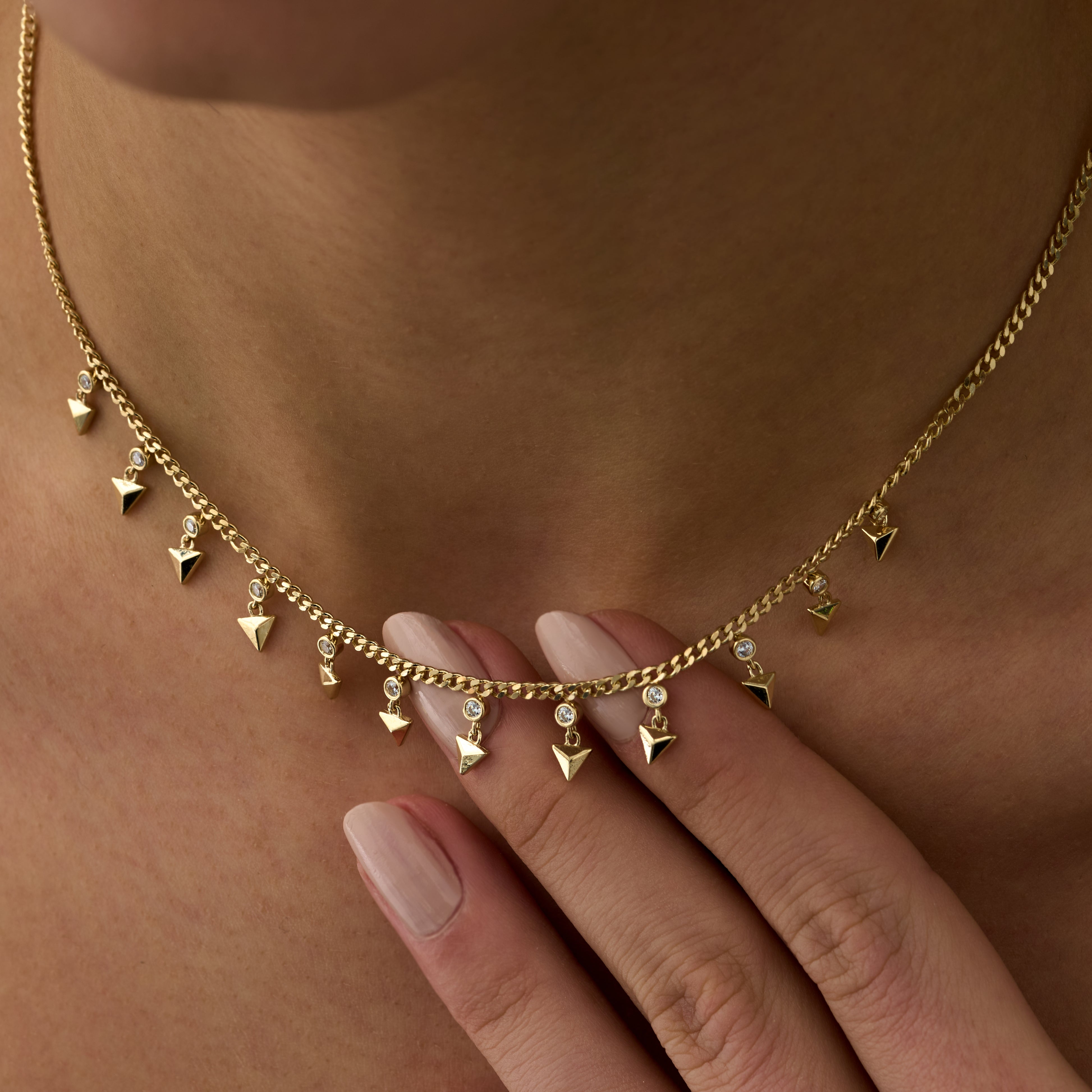 Piramit Sallantılı Pırlanta Kolye modeli, yaklaşık 8.37 gr ağırlığında 14 Ayar Sarı Altın kullanılarak özel olarak tasarlanmıştır.