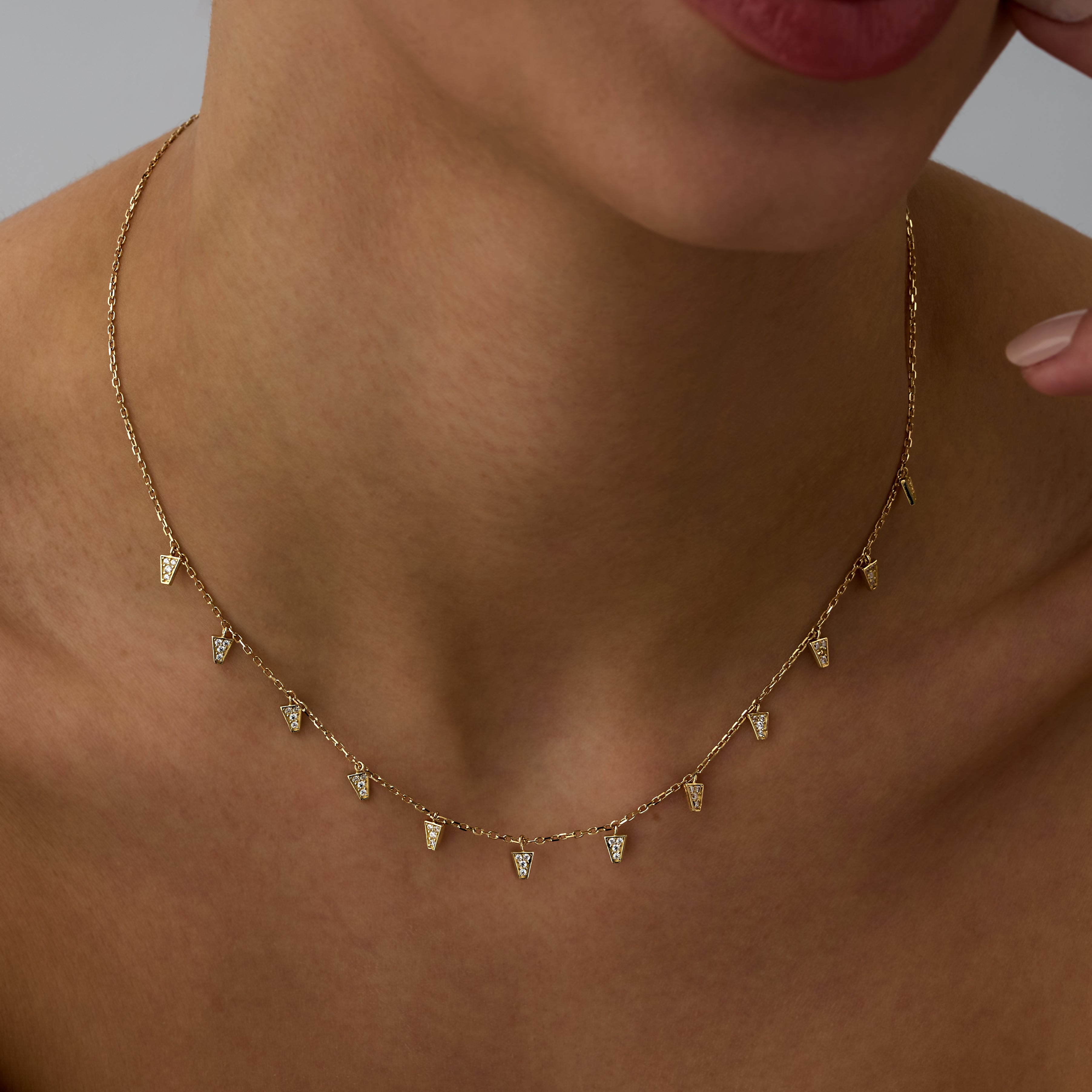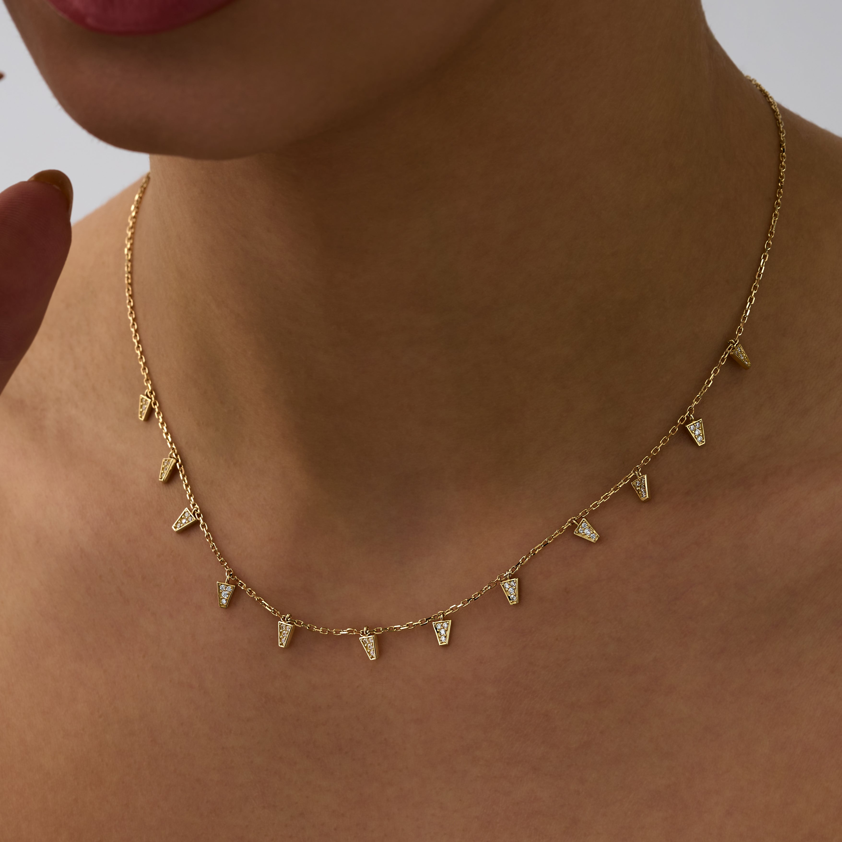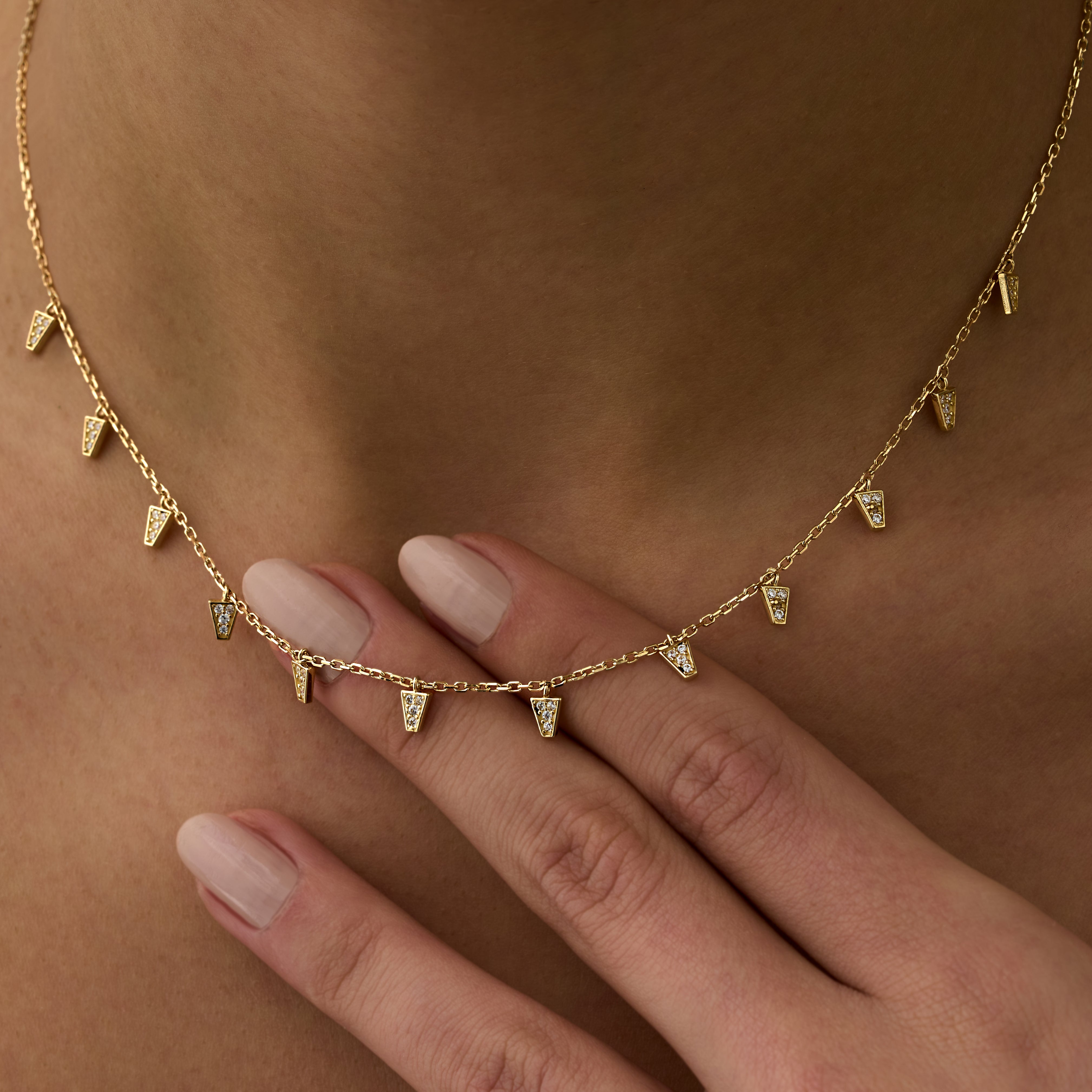 Geometrik Üçgen Pırlanta Kolye modeli, yaklaşık 4.08 gr ağırlığında 14 Ayar Sarı Altın kullanılarak özel olarak tasarlanmıştır.