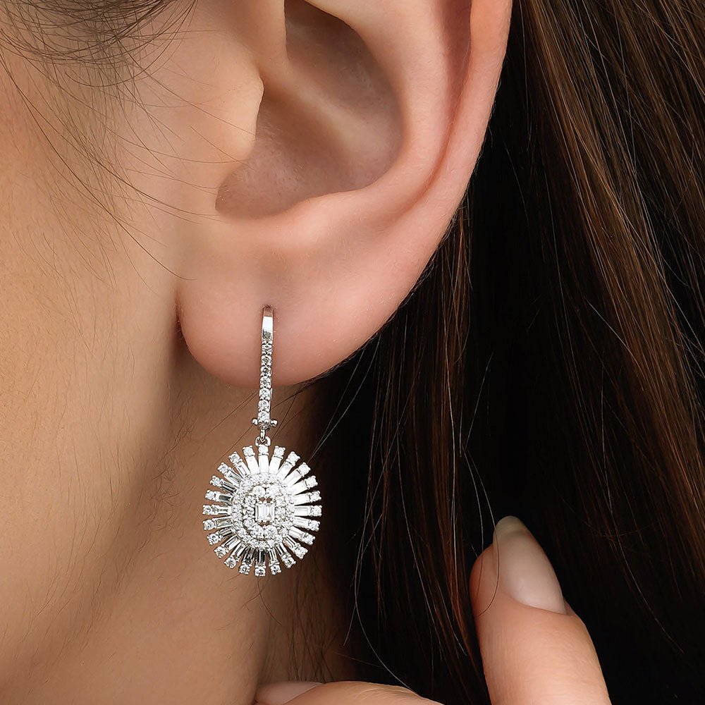 The 2.28 Carat Baguette Diamond Dangle Earring model is specially designed using 14 Carat White Gold weighing approximately 5.70 gr.