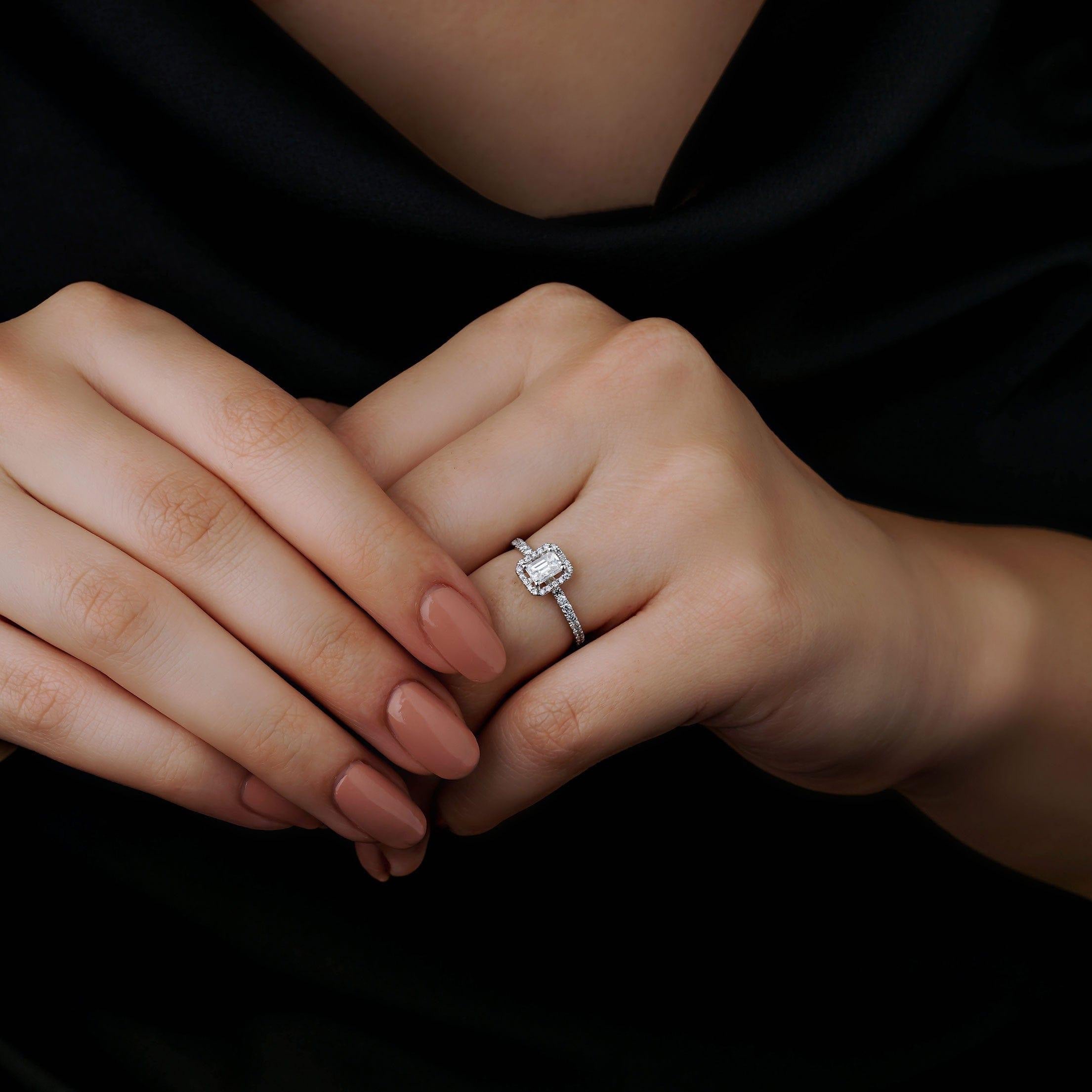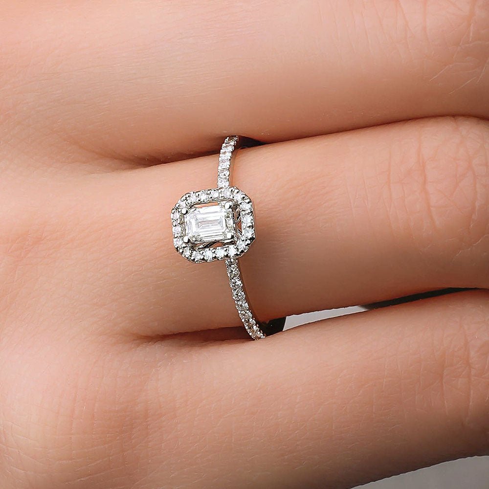 The 0.64 Carat Emerald Cut Solitaire Diamond Ring model is specially designed using 14 Carat White Gold weighing approximately 2.66 gr.