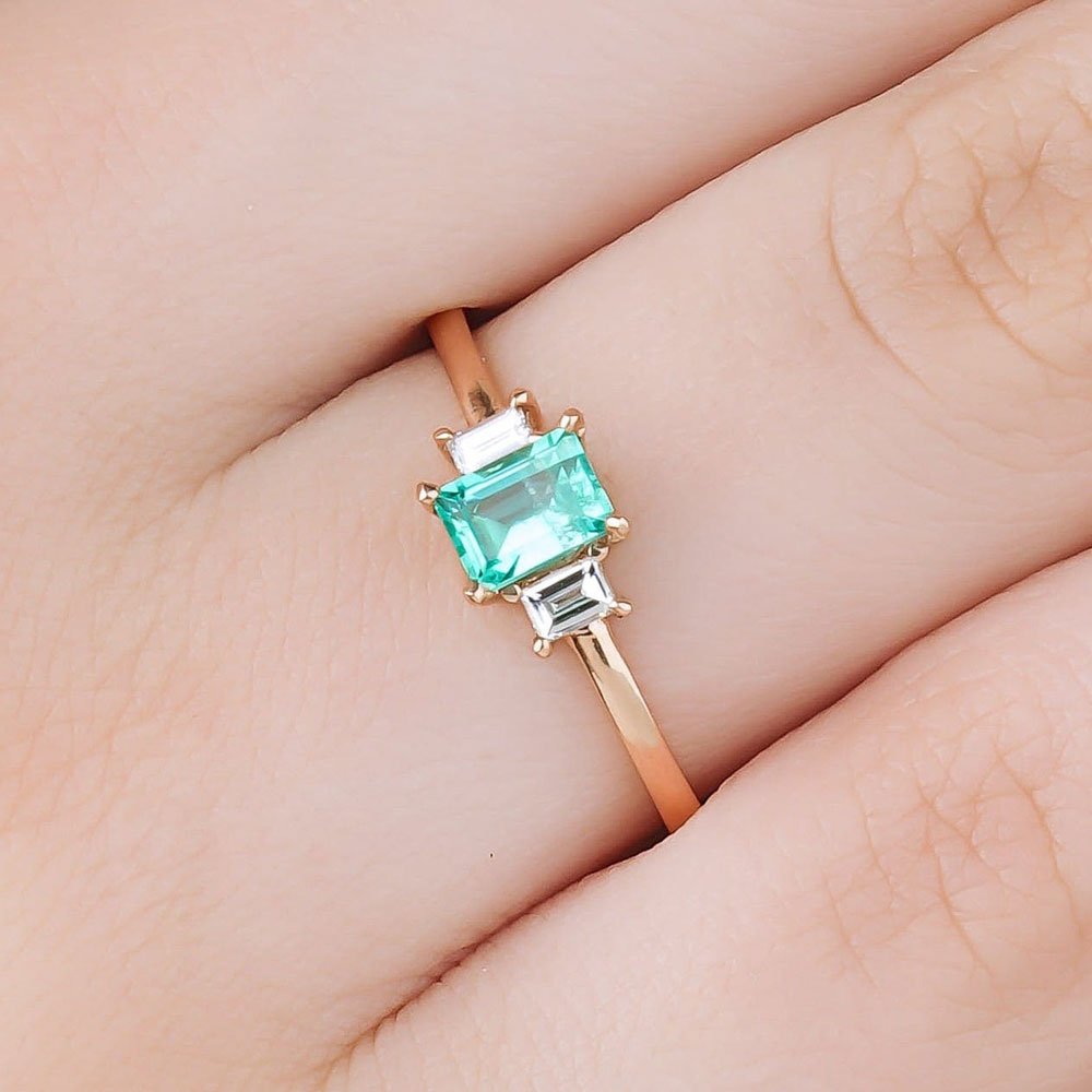 1.28 Carat Emerald Cut Emerald & 0.40 Carat Baguette Cut Diamond Solitaire Ring model is specially designed using 14 Carat Rose Gold weighing approximately 3.22 gr.