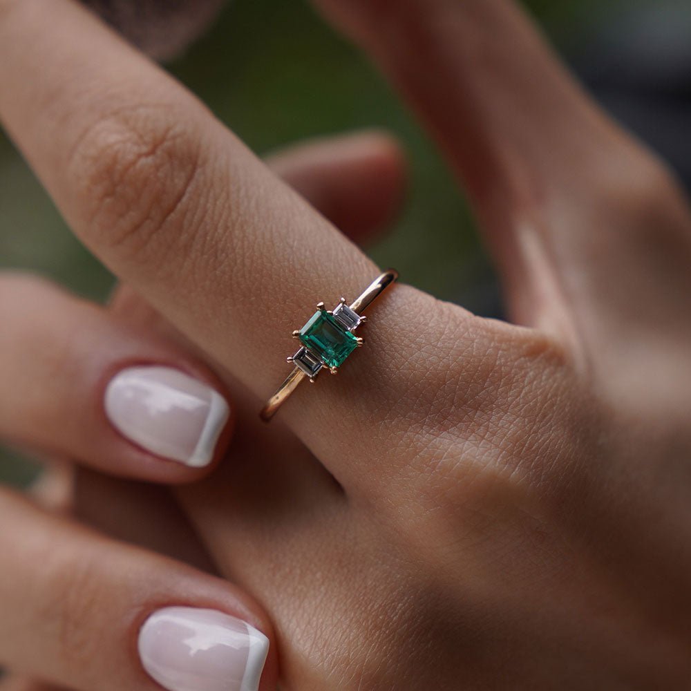 1.28 Carat Emerald Cut Emerald & 0.40 Carat Baguette Cut Diamond Solitaire Ring - RNF0118