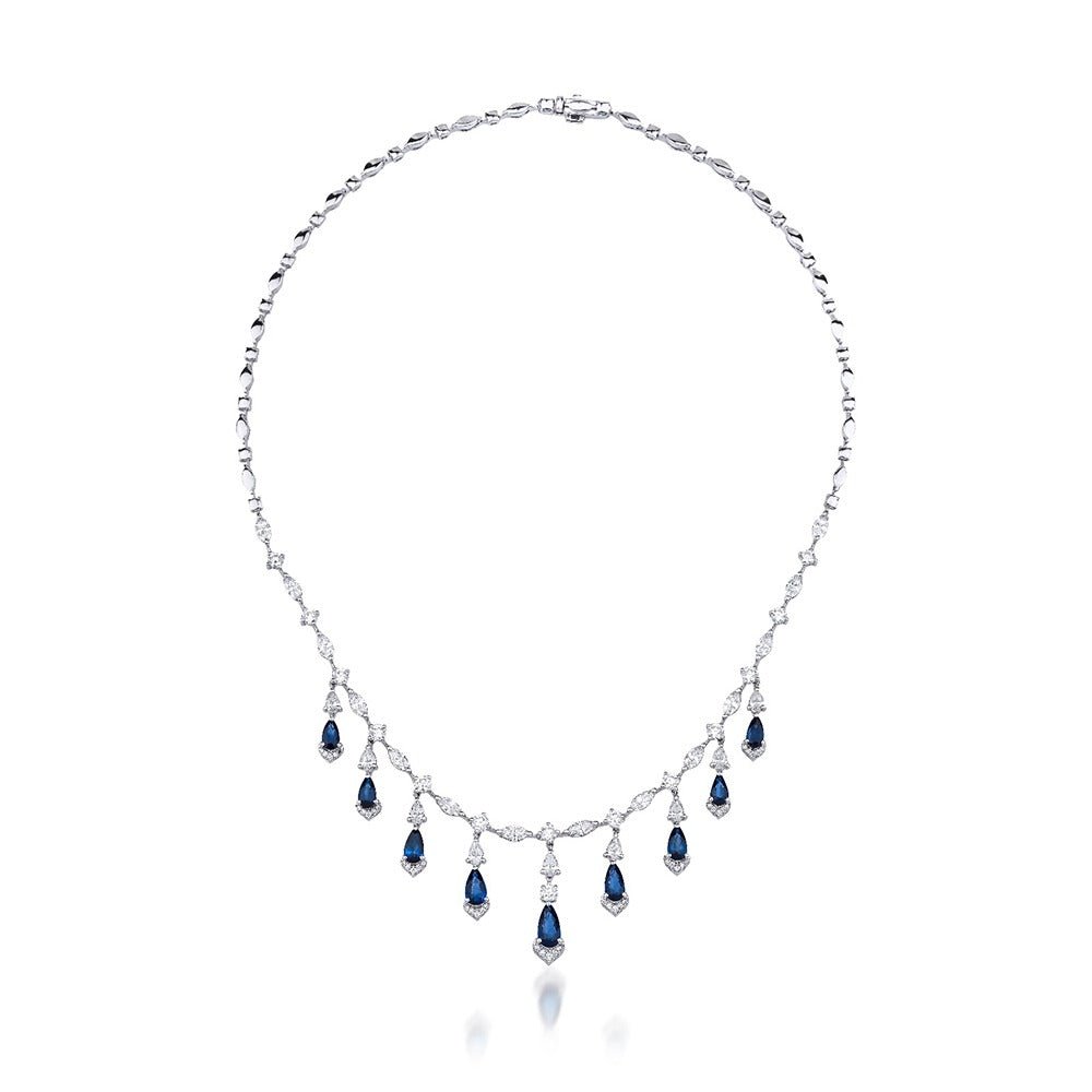 Nine teardrop-cut sapphires, competing with the deep blue of the sky, form the soul of this magnificent necklace. Each sapphire represents mysterious depths and infinite power, while its sparkle surrounded by diamonds emphasizes this power.