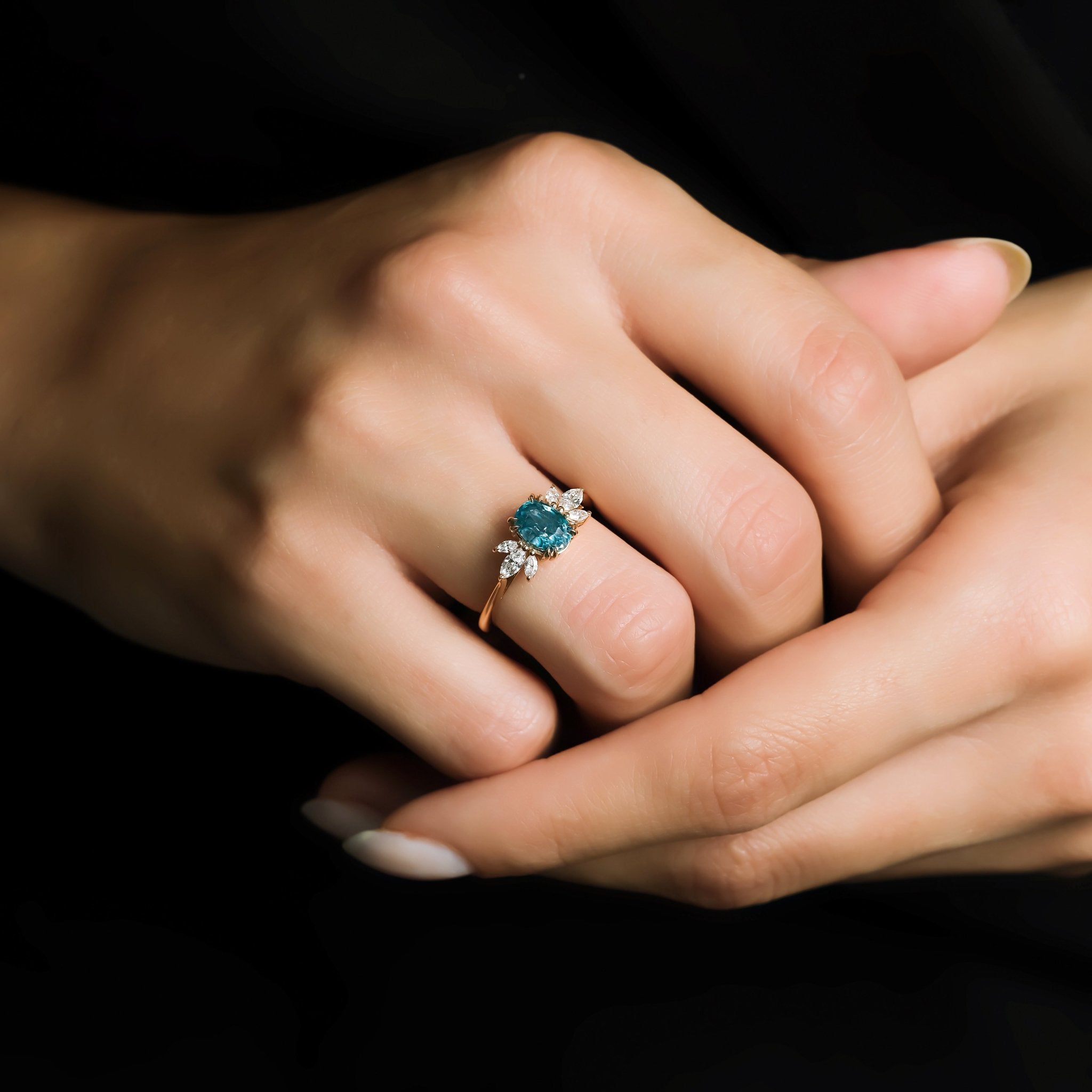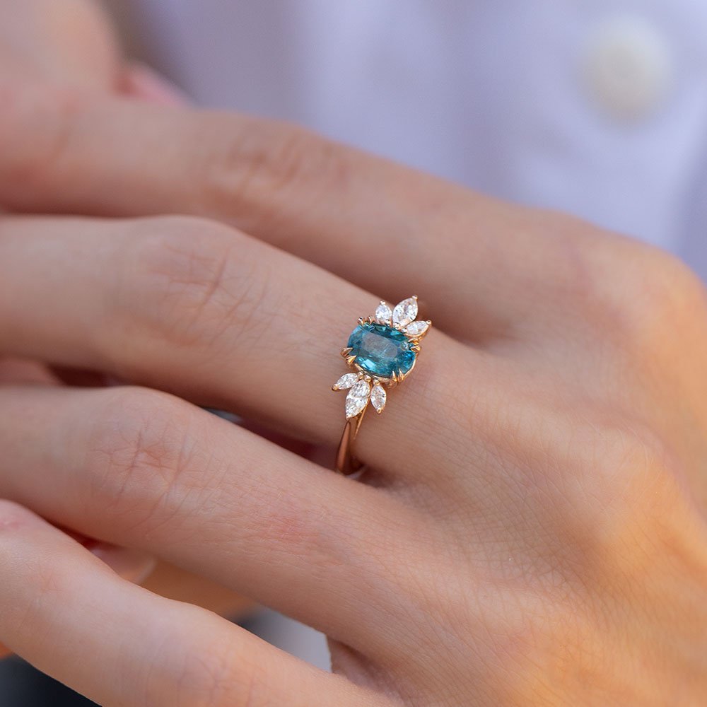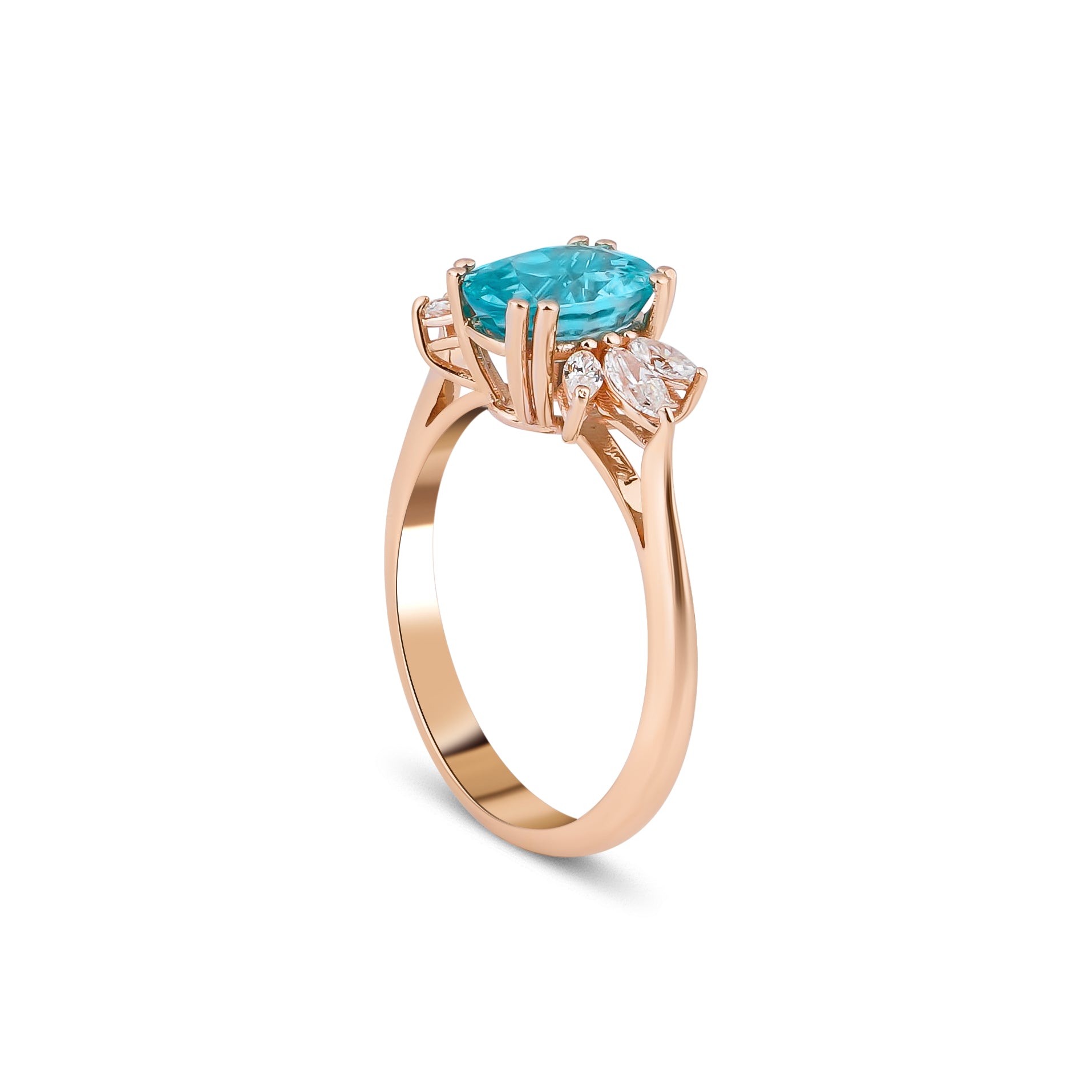 1.80 Carat Natural Blue Zirconium & 0.40 Carat Marquise Cut Diamond Ring model is specially designed using 14 Carat Rose Gold weighing approximately 3.32 gr.
