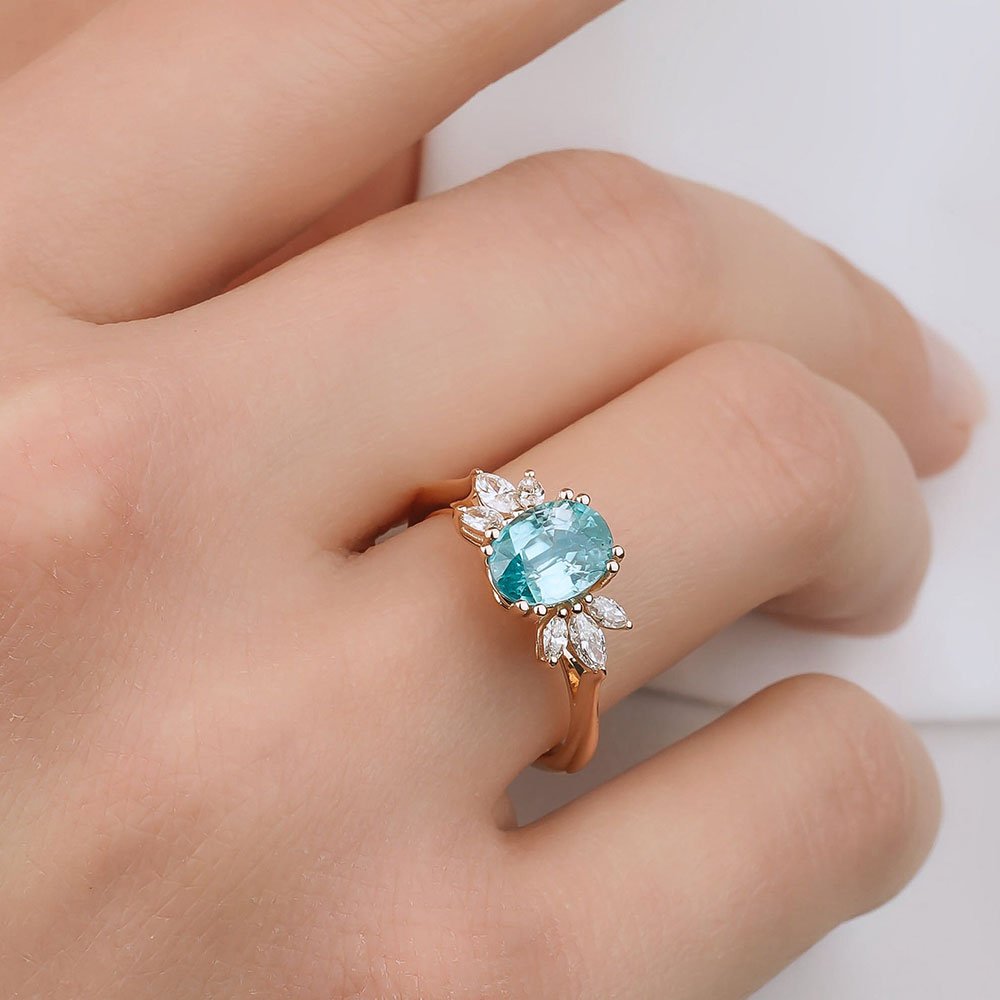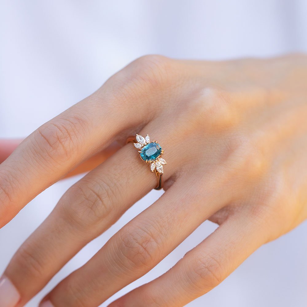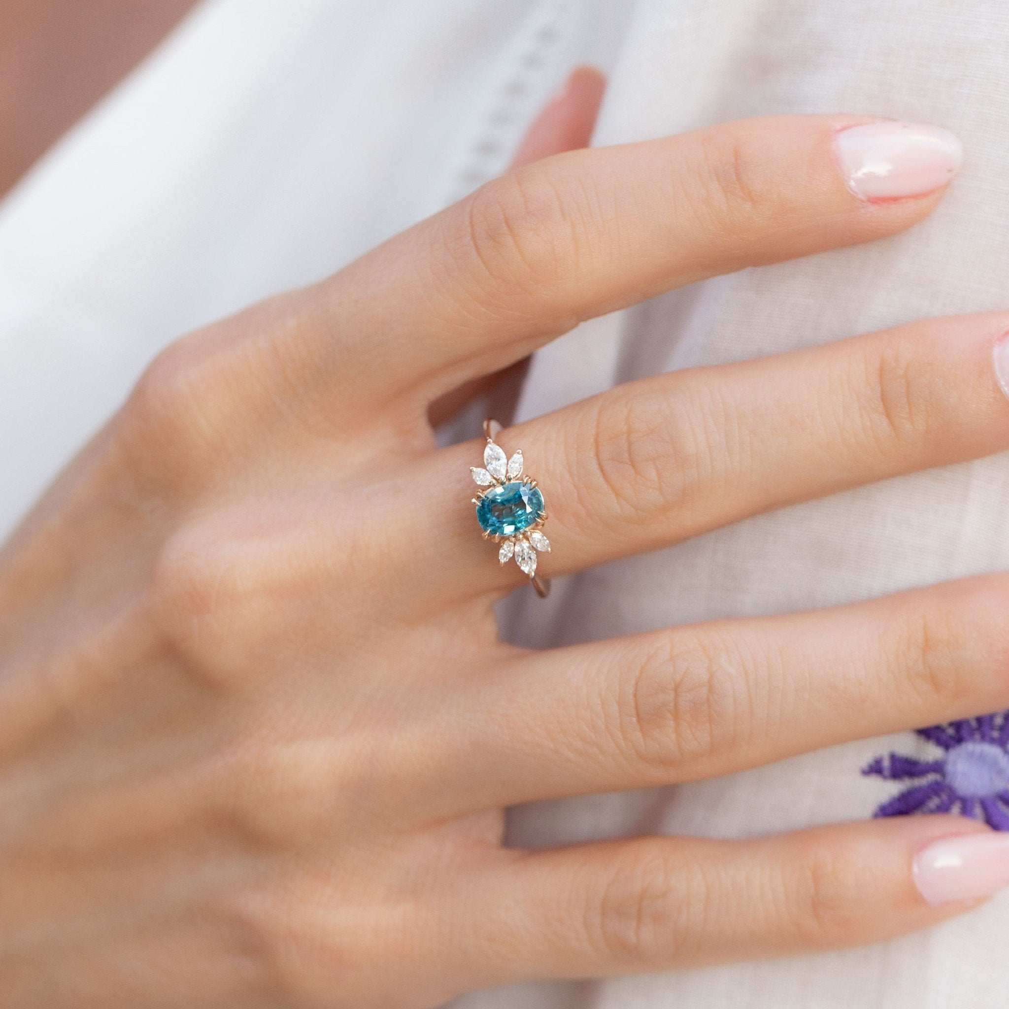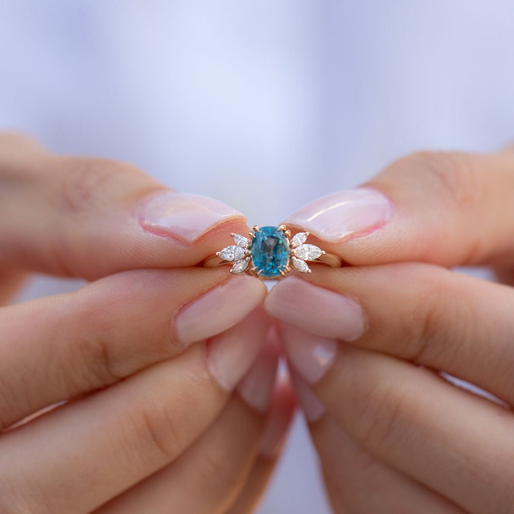 1.80 Carat Natural Blue Zirconium & 0.40 Carat Marquise Cut Diamond Ring model is specially designed using 14 Carat Rose Gold weighing approximately 3.32 gr.
