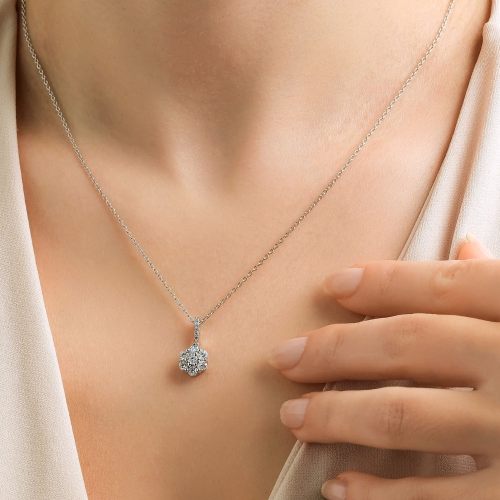 The 0.45 Carat Round Diamond Necklace model is specially designed using 14 Carat White Gold weighing approximately 3.40 grams.