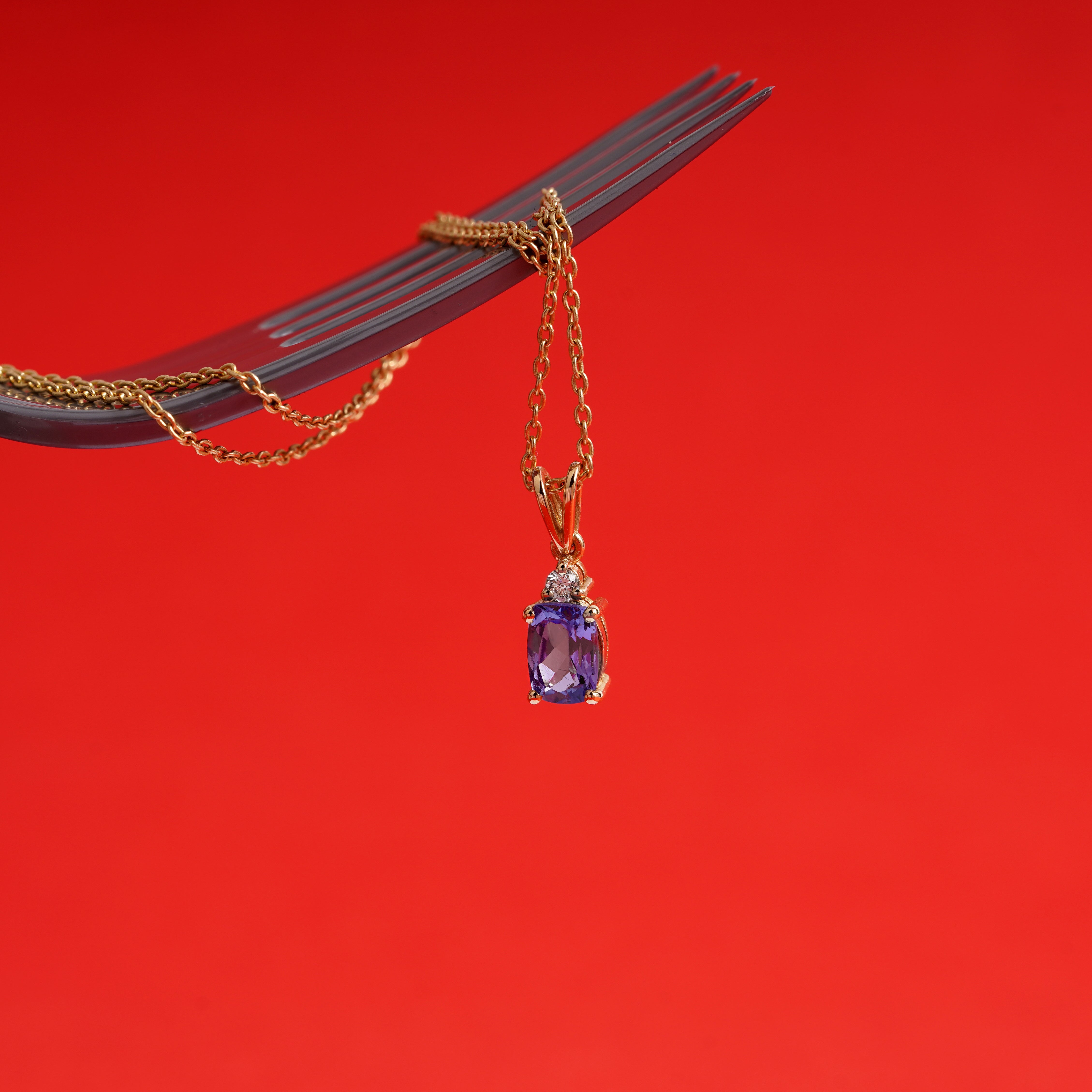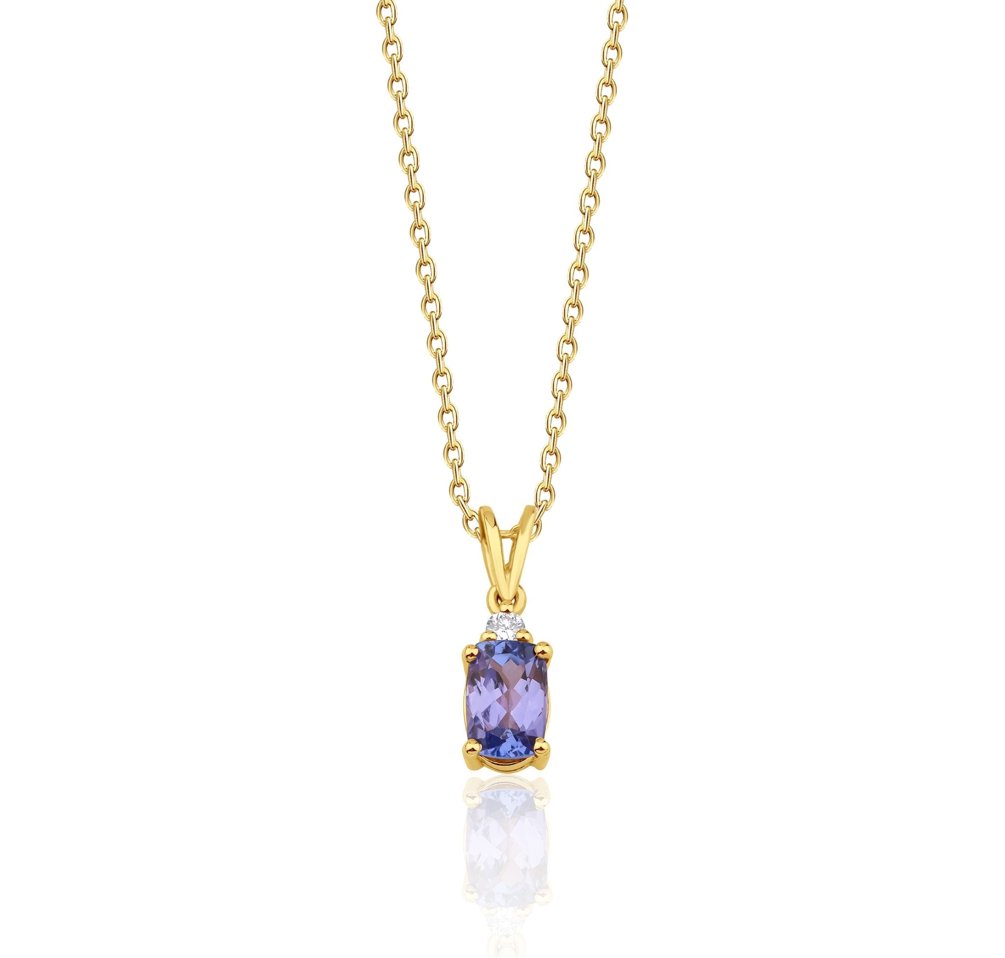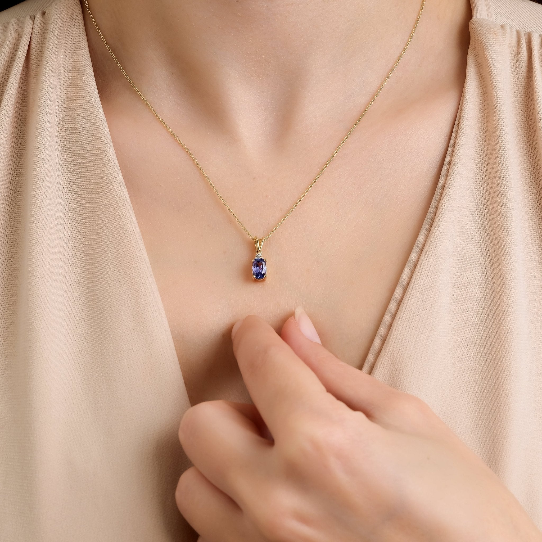 The 0.80 Carat Oval Tanzanite & 0.03 Carat Round Cut Diamond Necklace model is specially designed using 14 Carat Yellow Gold weighing approximately 2.26 grams.