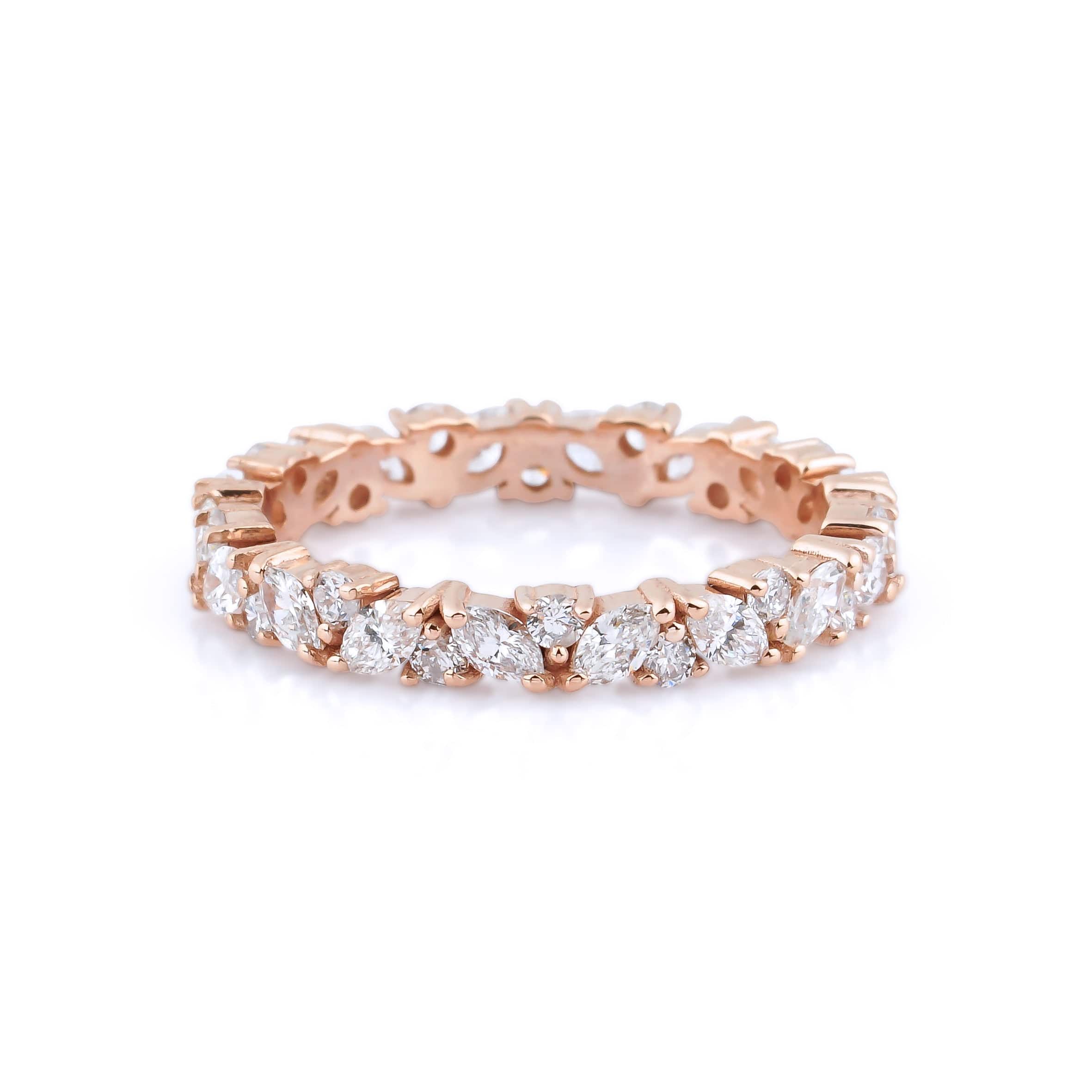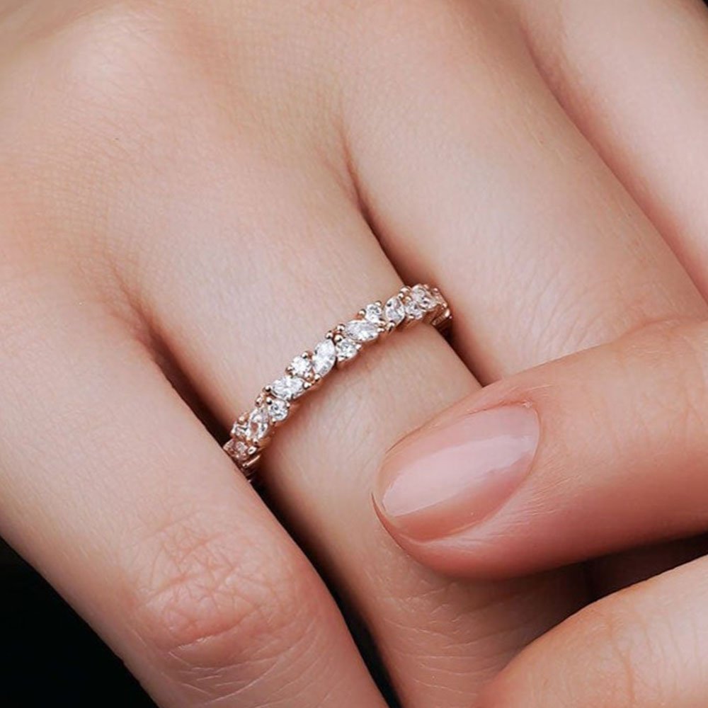 The 0.86 Carat Marquise Cut Diamond Special Design Eternity Ring model is specially designed using 14 Carat Rose Gold weighing approximately 3.22 grams.