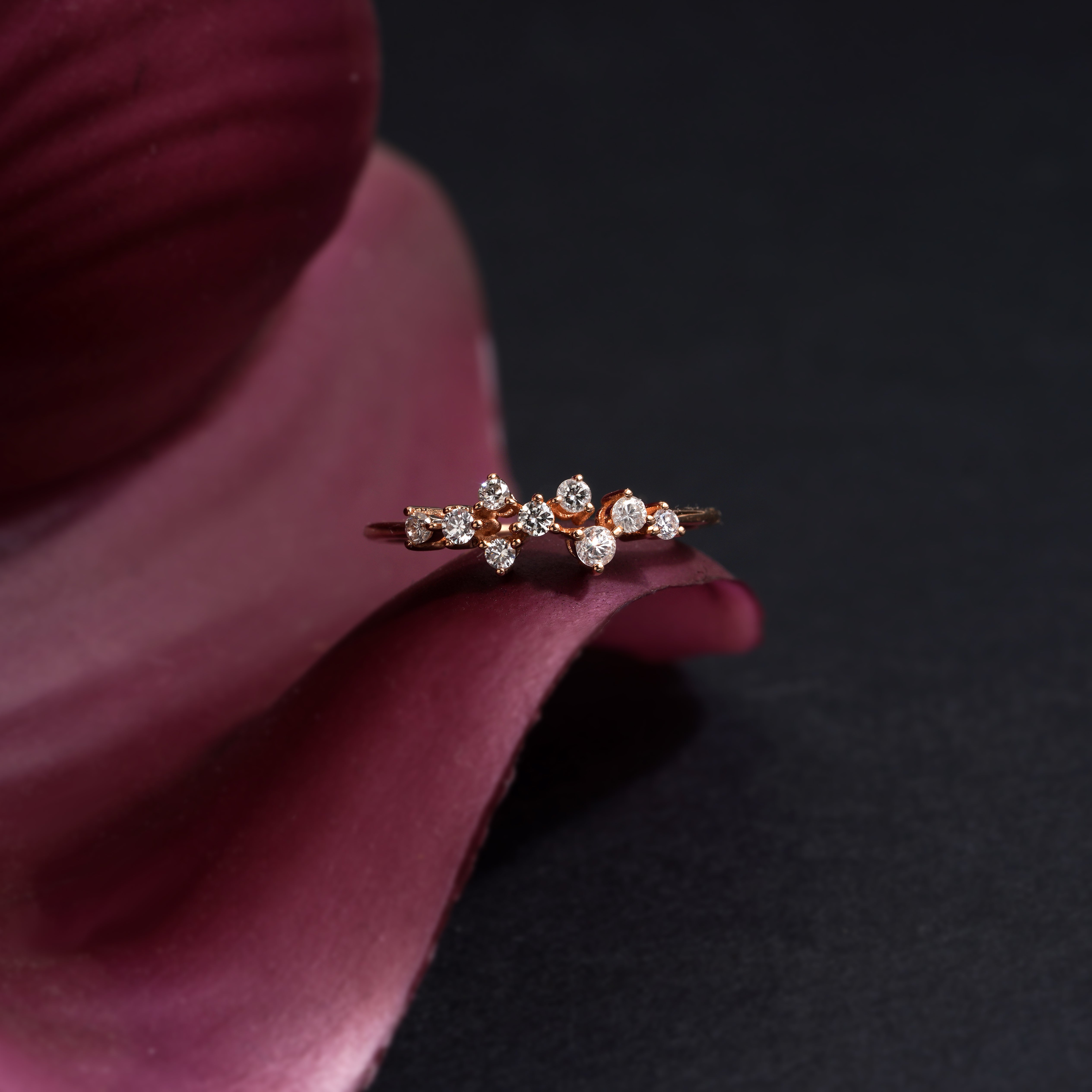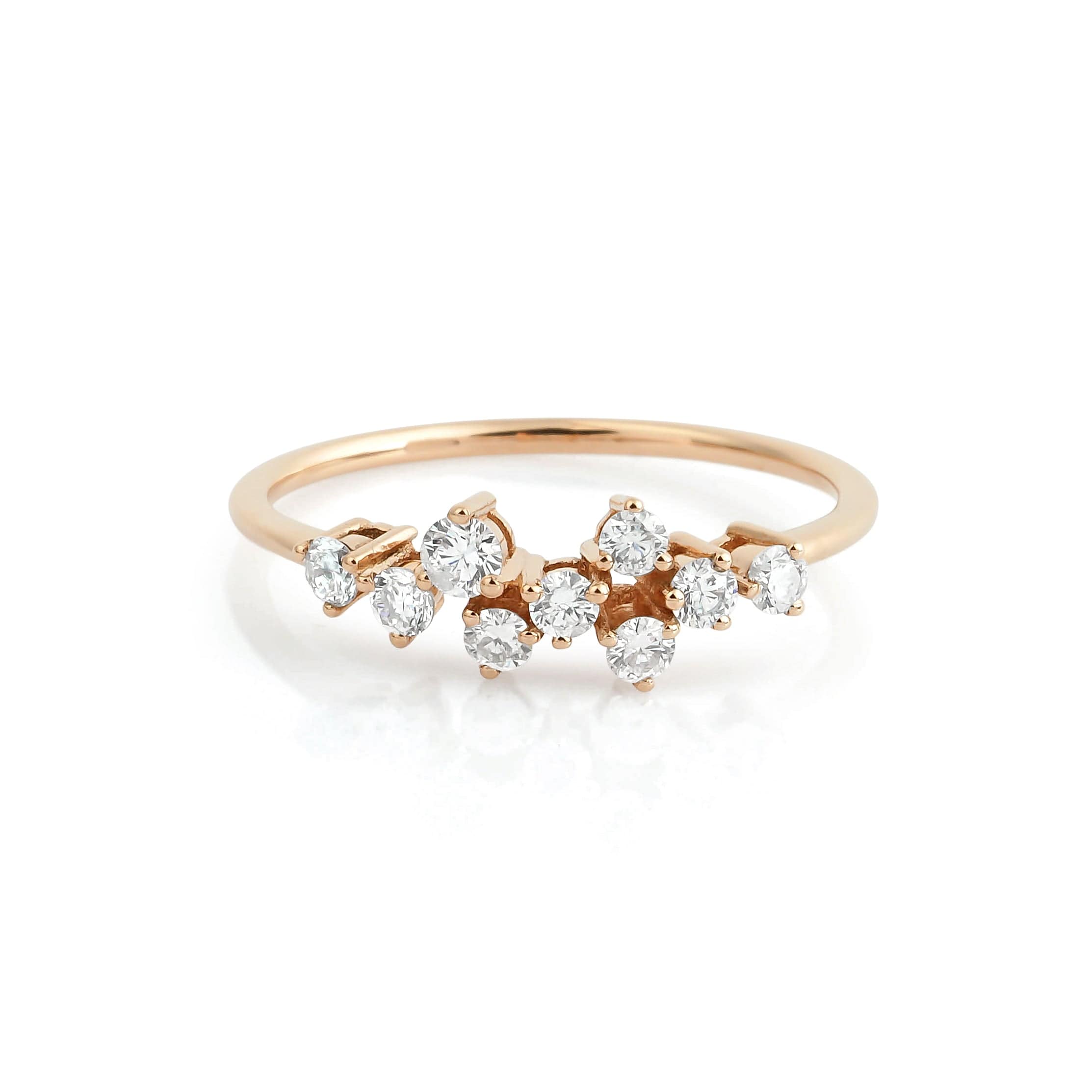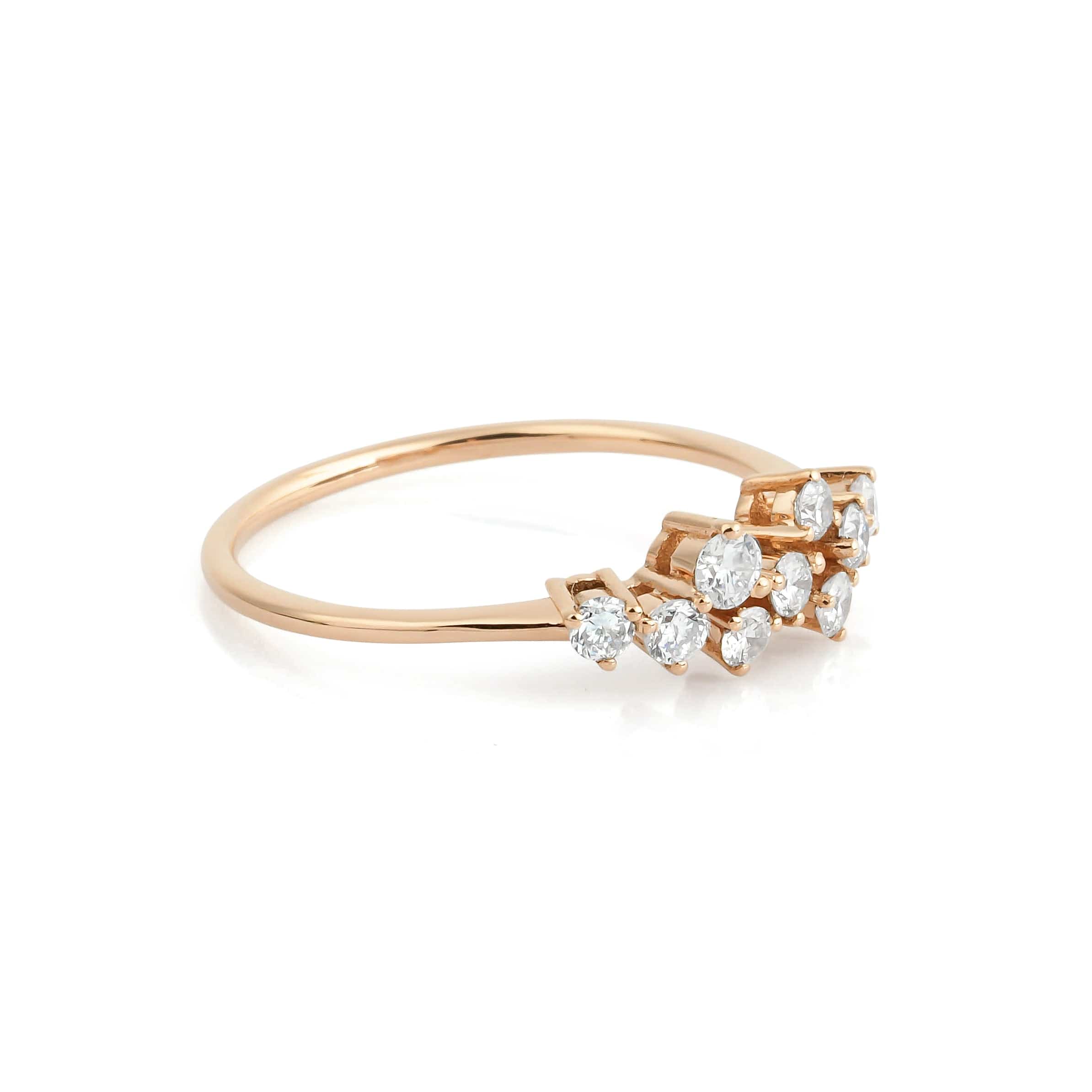 The 0.14 Carat Rose Gold Asymmetric Design Diamond Ring model is specially designed using 14 Carat Rose Gold weighing approximately 2.18 grams.