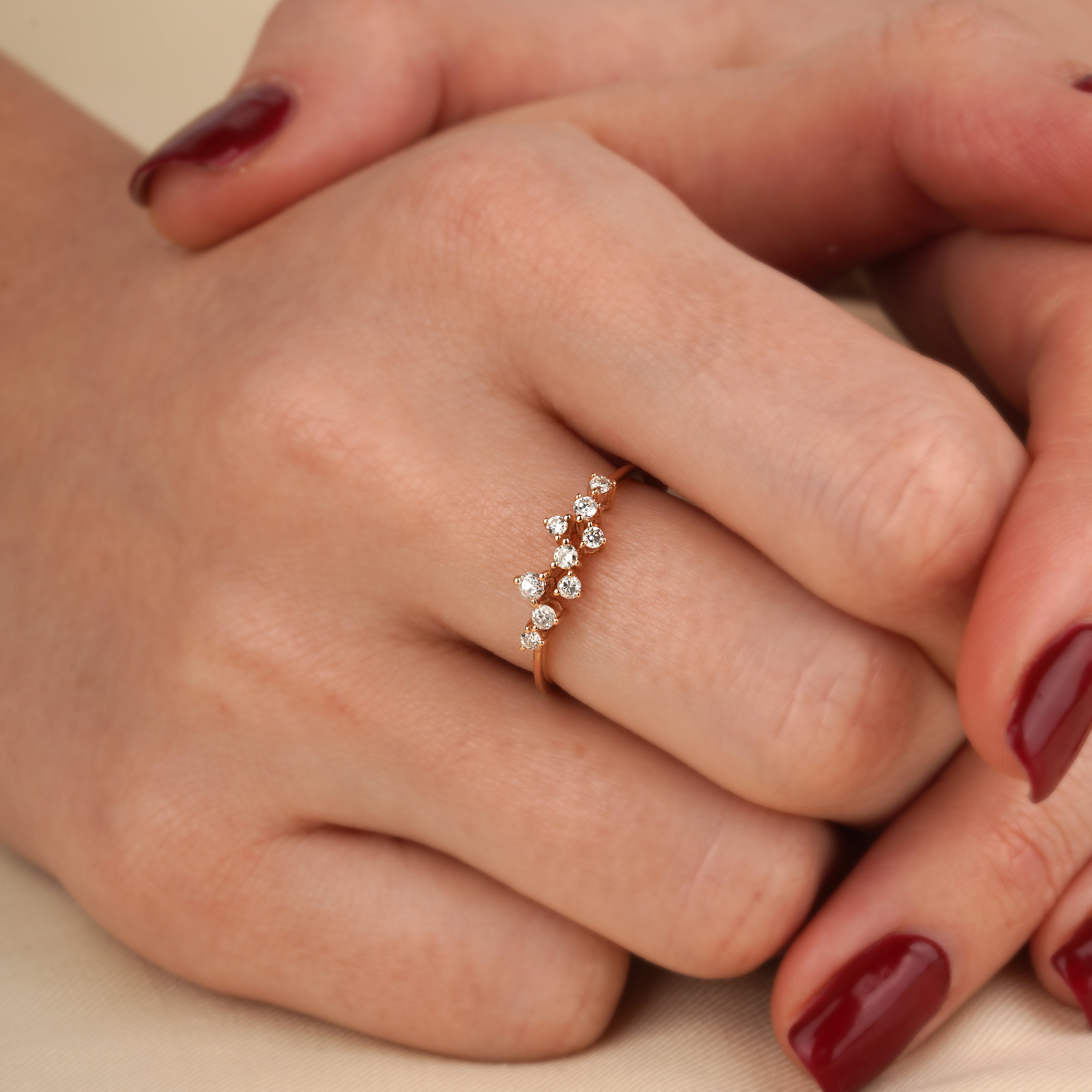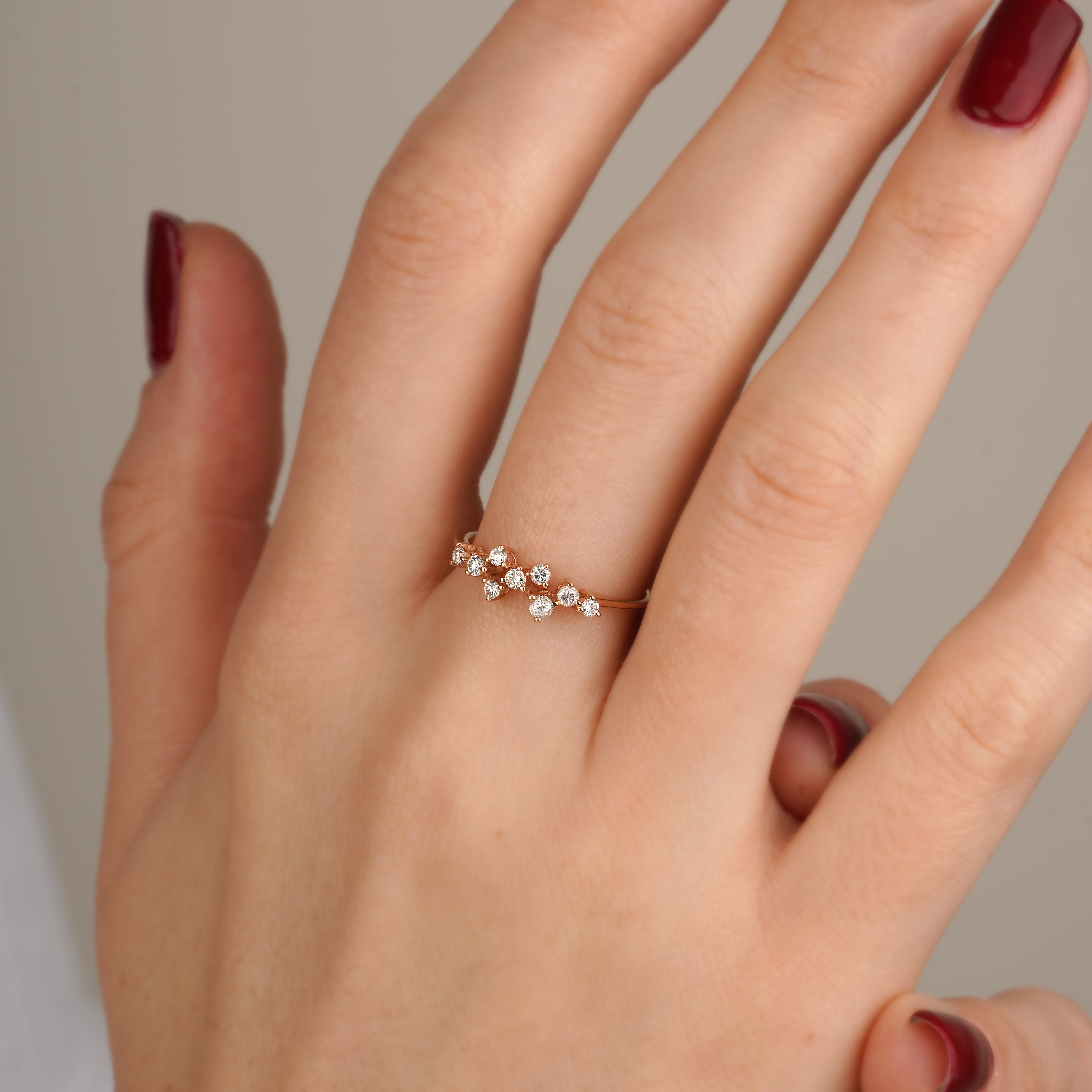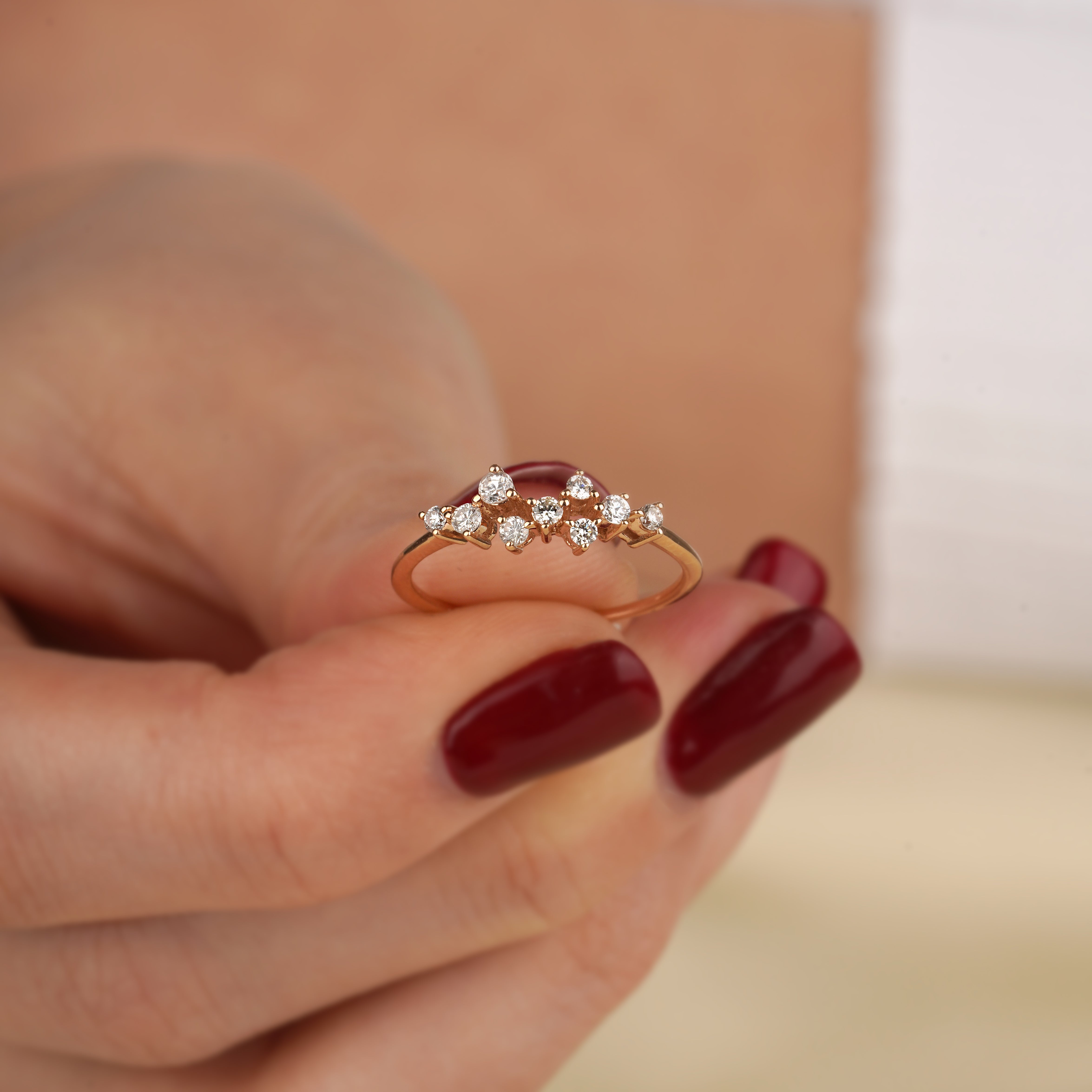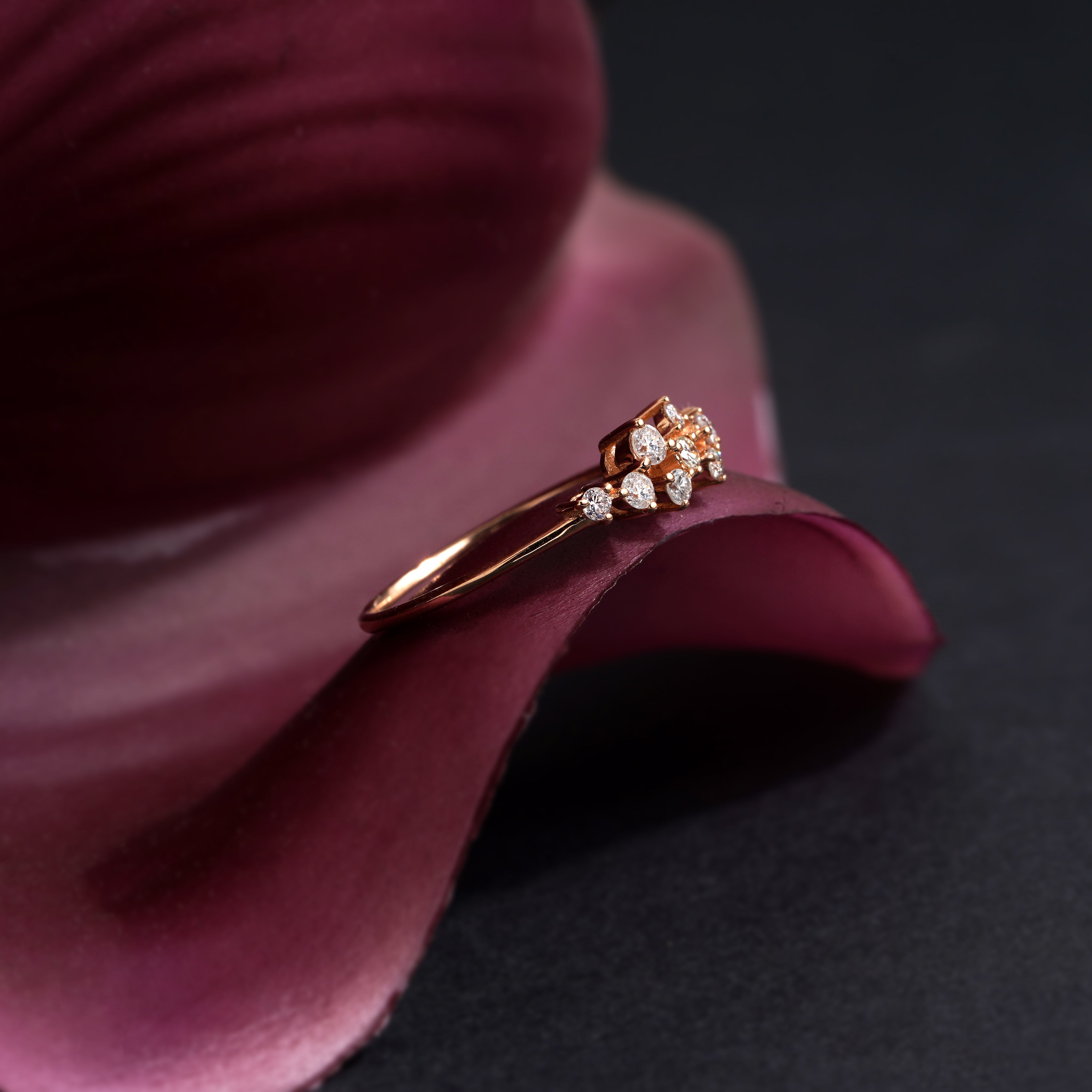 The 0.14 Carat Rose Gold Asymmetric Design Diamond Ring model is specially designed using 14 Carat Rose Gold weighing approximately 2.18 grams.