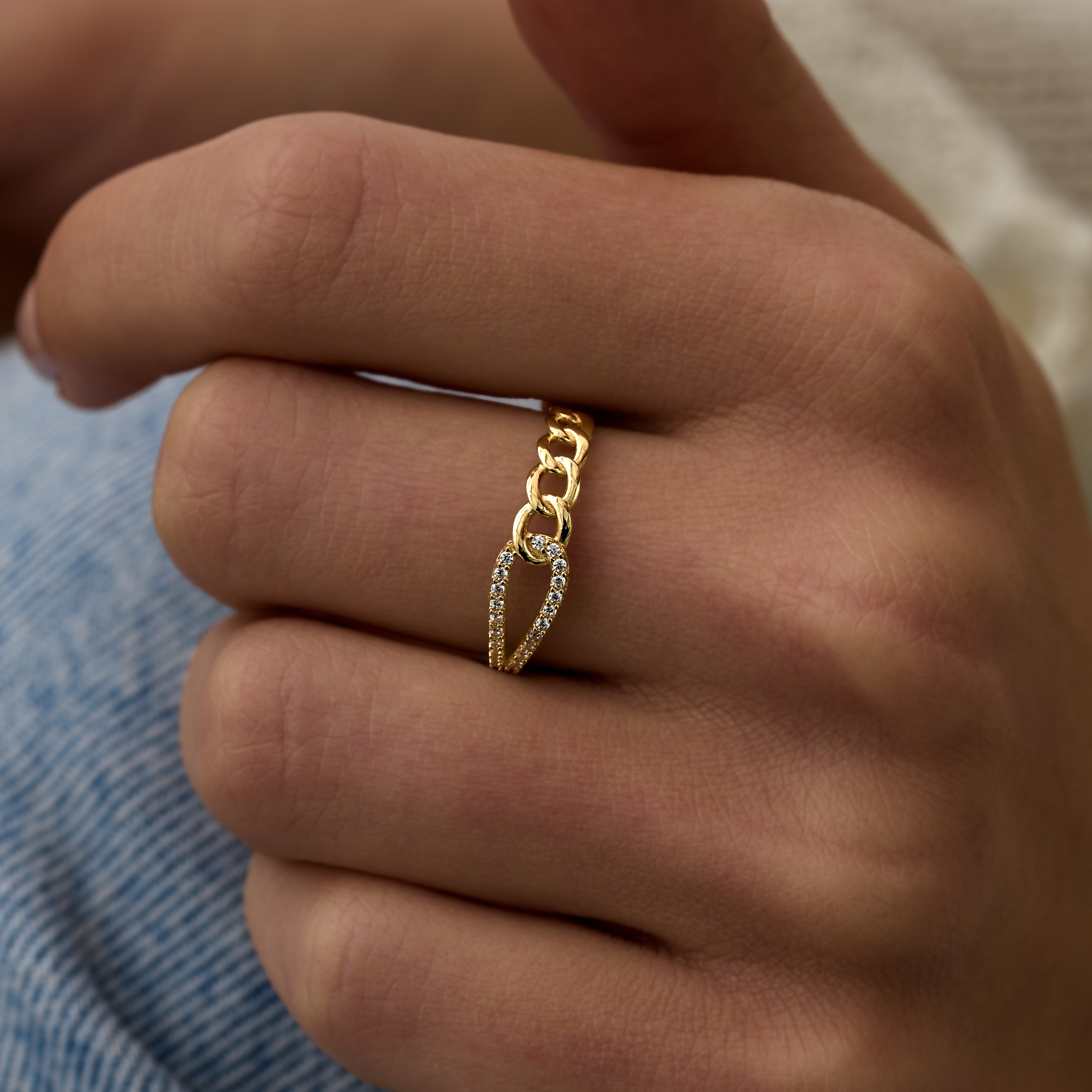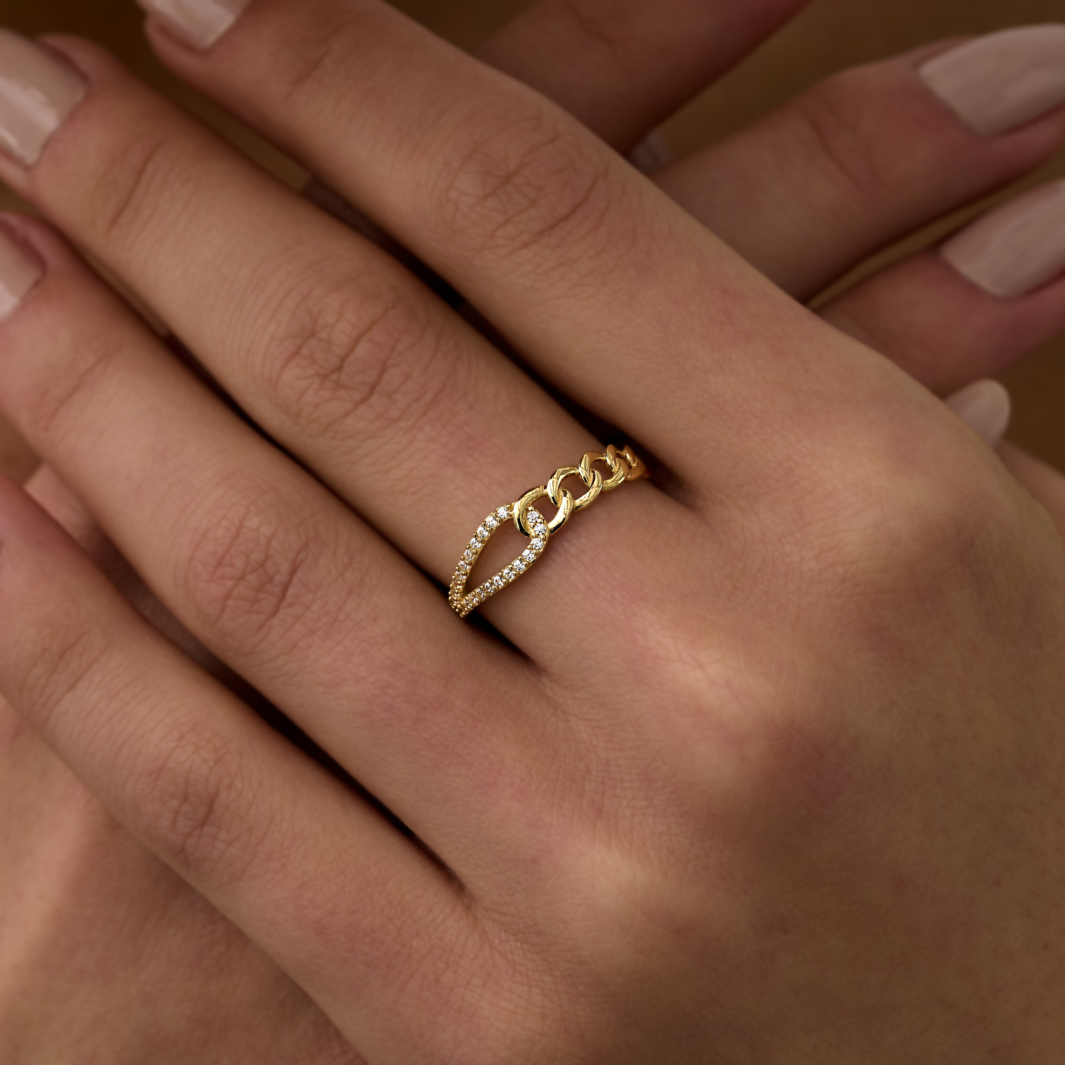 Zincir Formlu Pırlantalı Yüzük modeli, yaklaşık 1.29 gr ağırlığında 14 Ayar Sarı Altın kullanılarak özel olarak tasarlanmıştır.