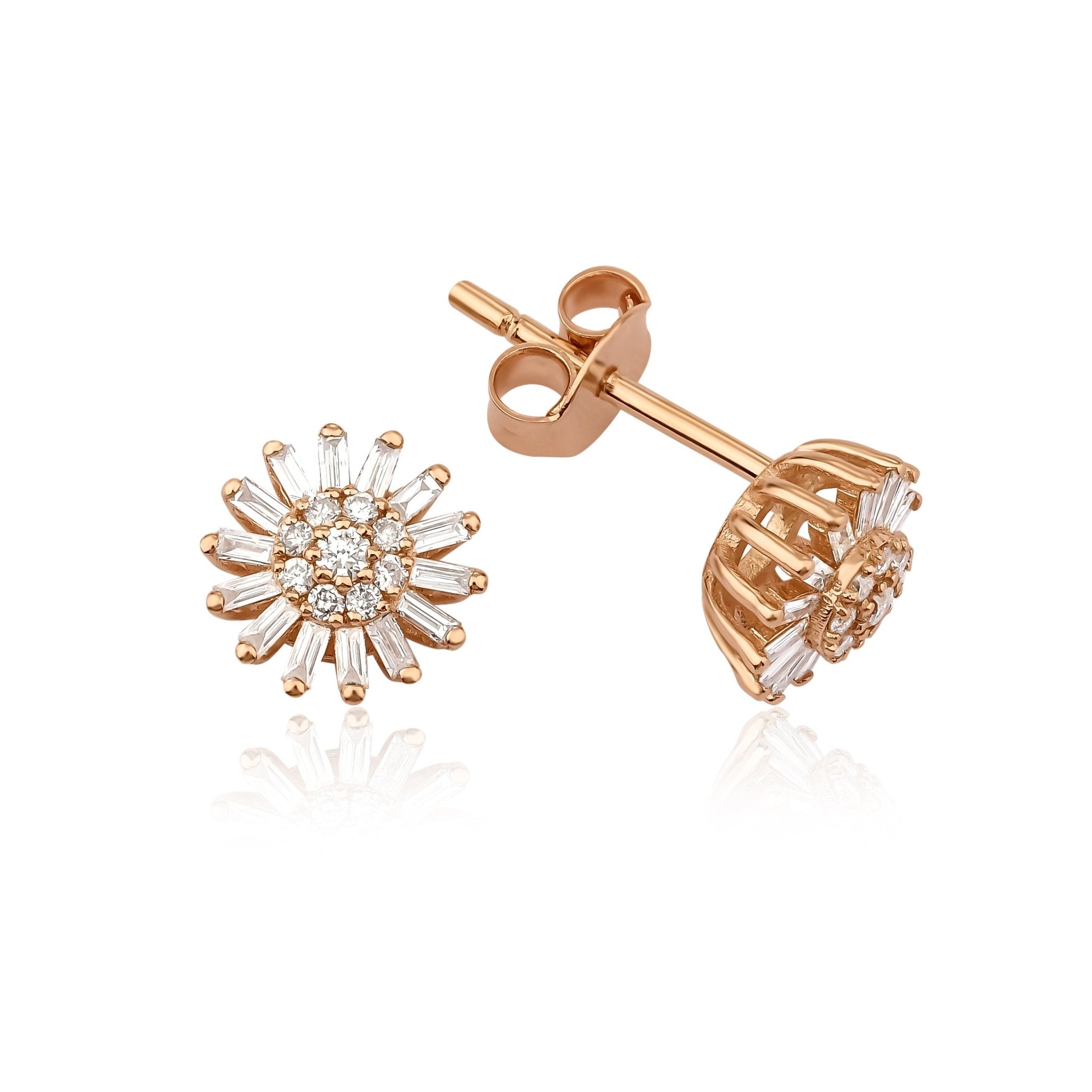 0.48 Karat Baget & 0.18 Karat Yuvarlak Pırlanta Küpe modeli, yaklaşık 2.12 gr 14 Ayar Rose Altın ağırlığında kullanılarak özel olarak tasarlanmıştır.