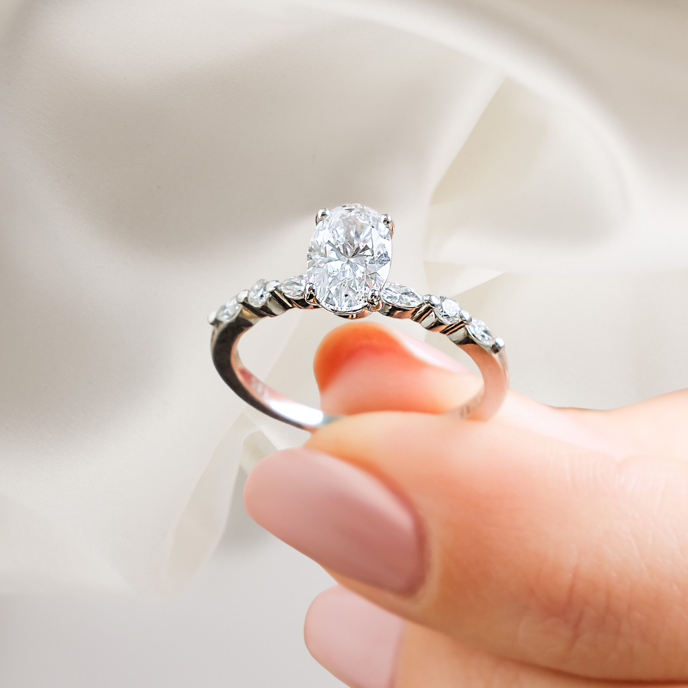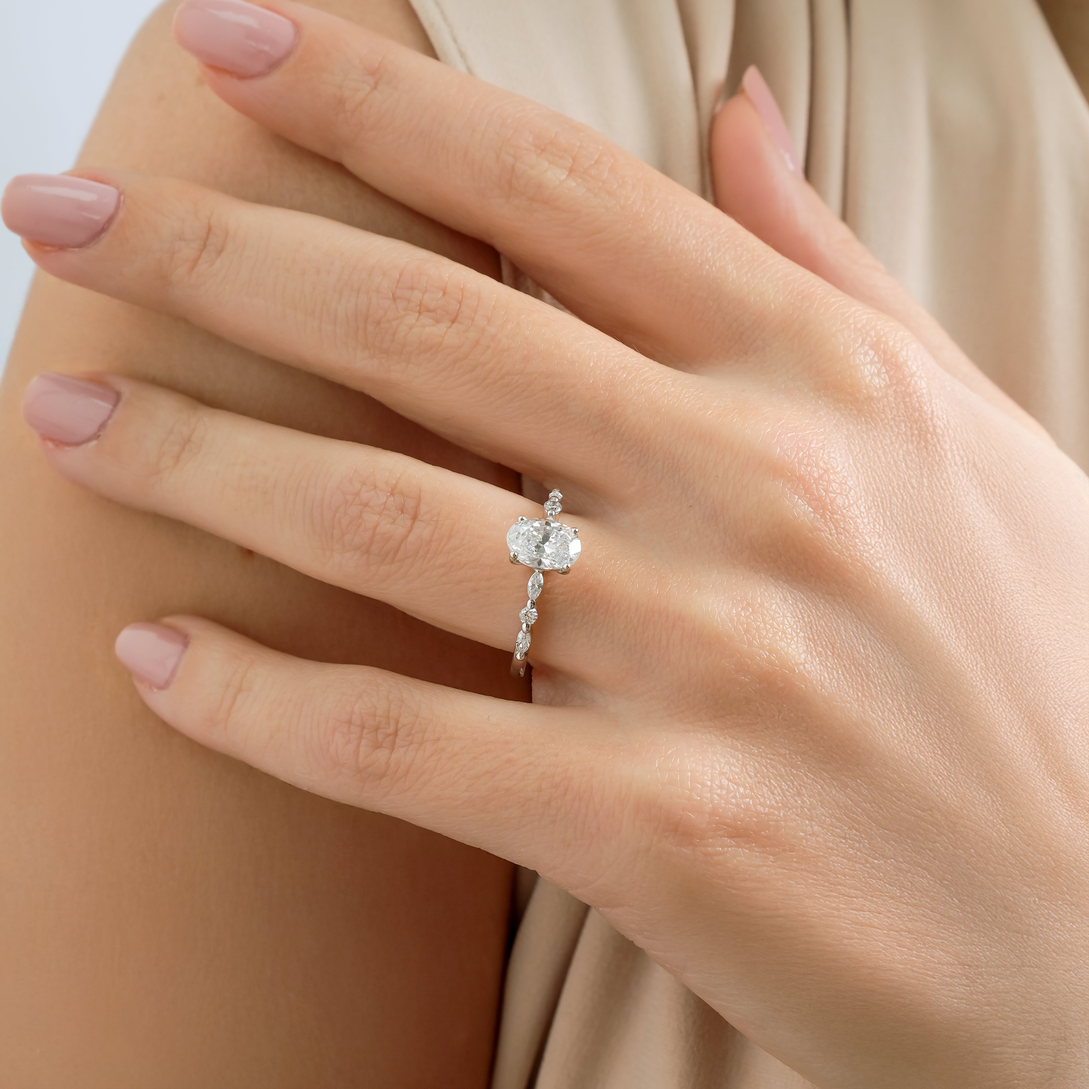 0.70 Karat Oval Kesim & 0.28 Karat Markiz-Yuvarlak Karat Pırlanta GIA/HRD Sertifikalı Özel Tasarım Tektaş Yüzük modeli, yaklaşık 2.44 gr ağırlığında 14 Ayar Beyaz Altın kullanılarak özel olarak tasarlanmıştır.