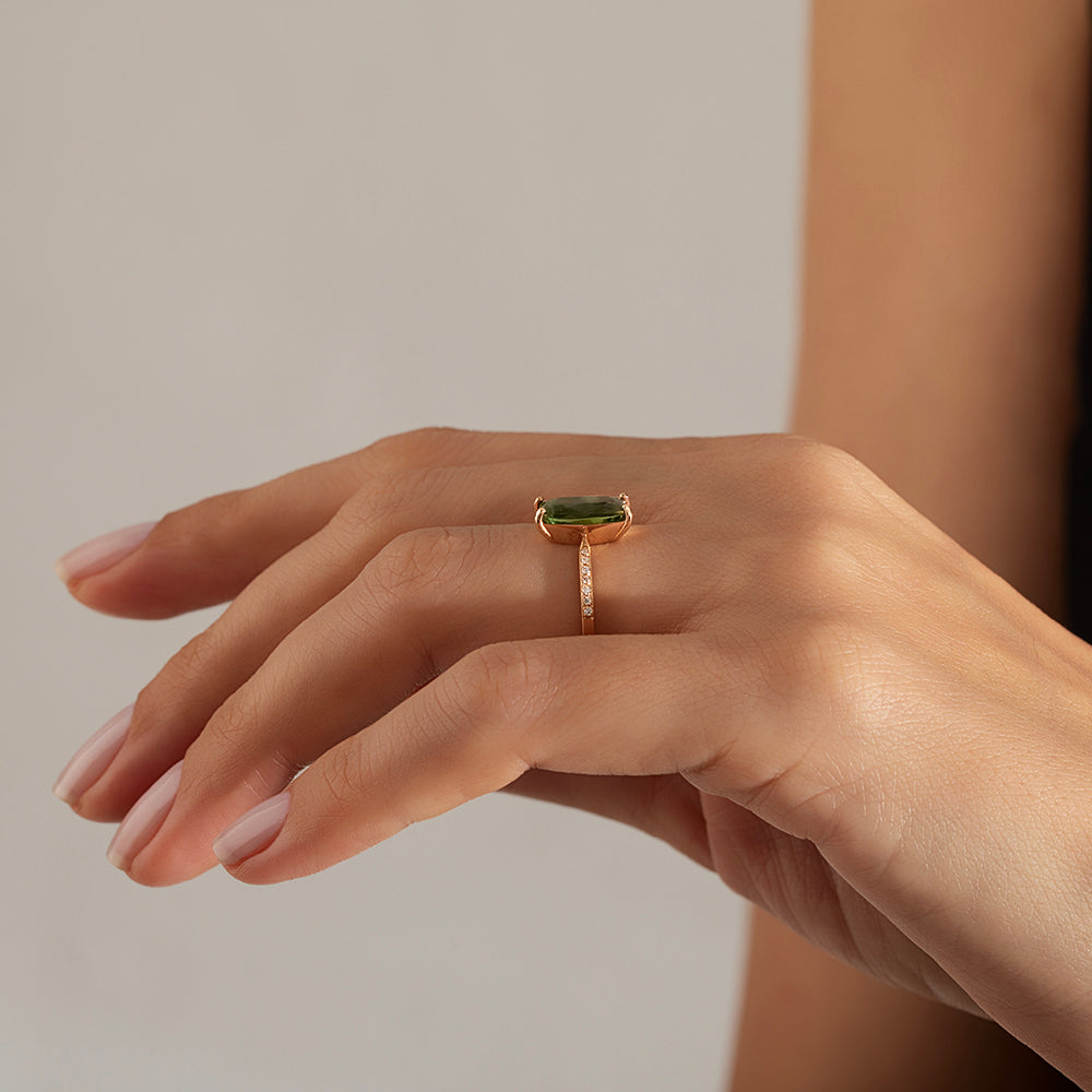 2.70 Karat Peridot & 0.16 Karat Yuvarlak Pırlantalı Yüzük modeli, yaklaşık 3.00 gr ağırlığında 14 Ayar Sarı Altın kullanılarak özel olarak tasarlanmıştır.