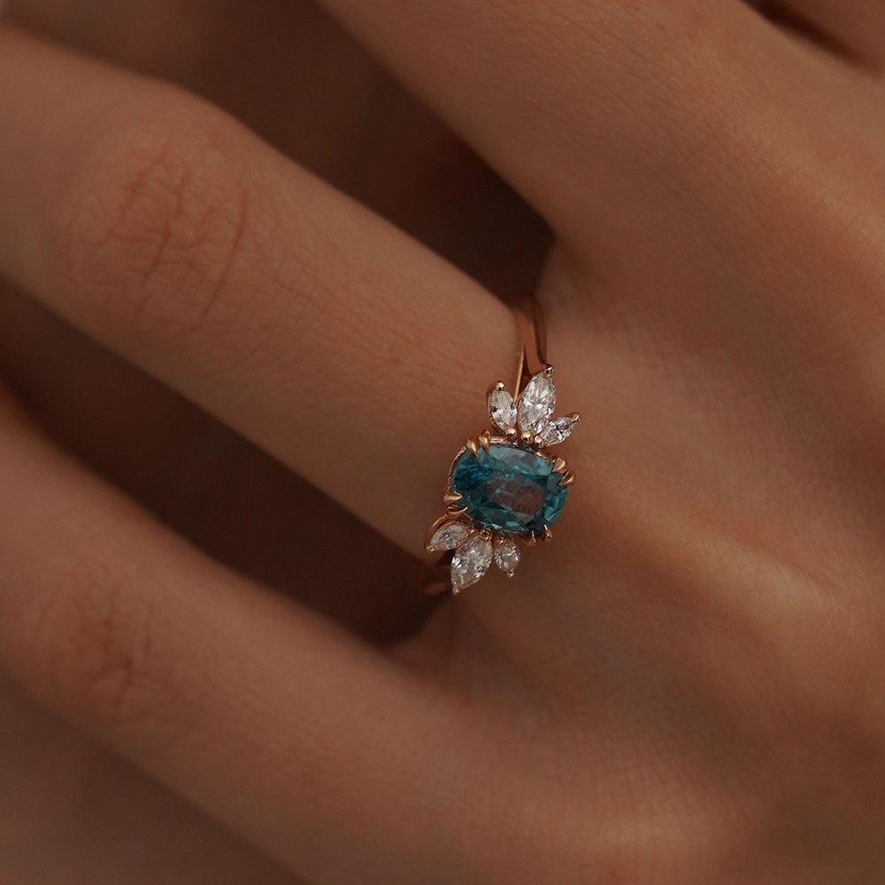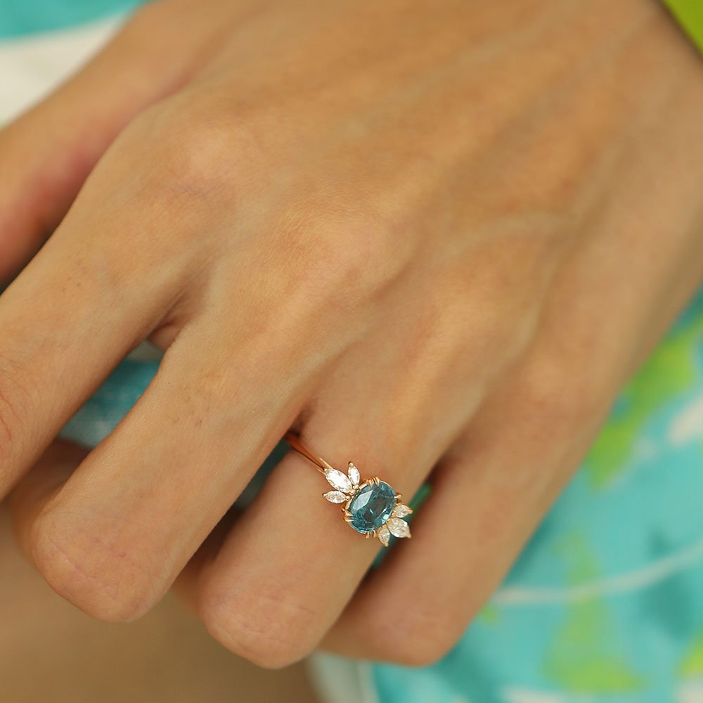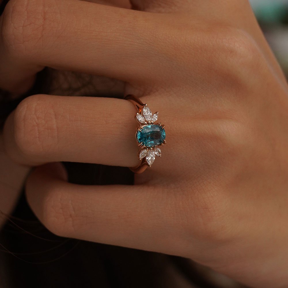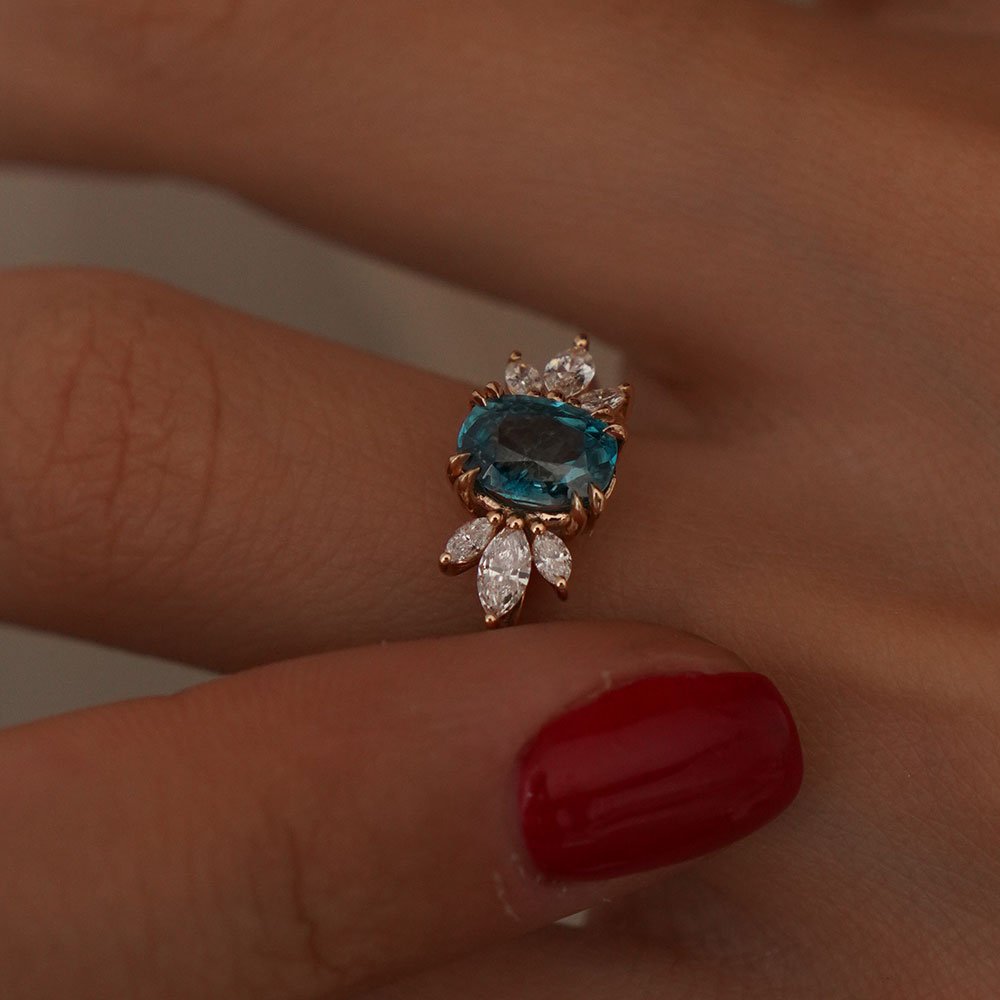 2.78 Karat Marla London Blue Topaz & 0.40 ct Markiz Kesim Pırlantalı Yüzük modeli, yaklaşık 3.88 gr ağırlığında 14 Ayar Rose Altın kullanılarak özel olarak tasarlanmıştır.