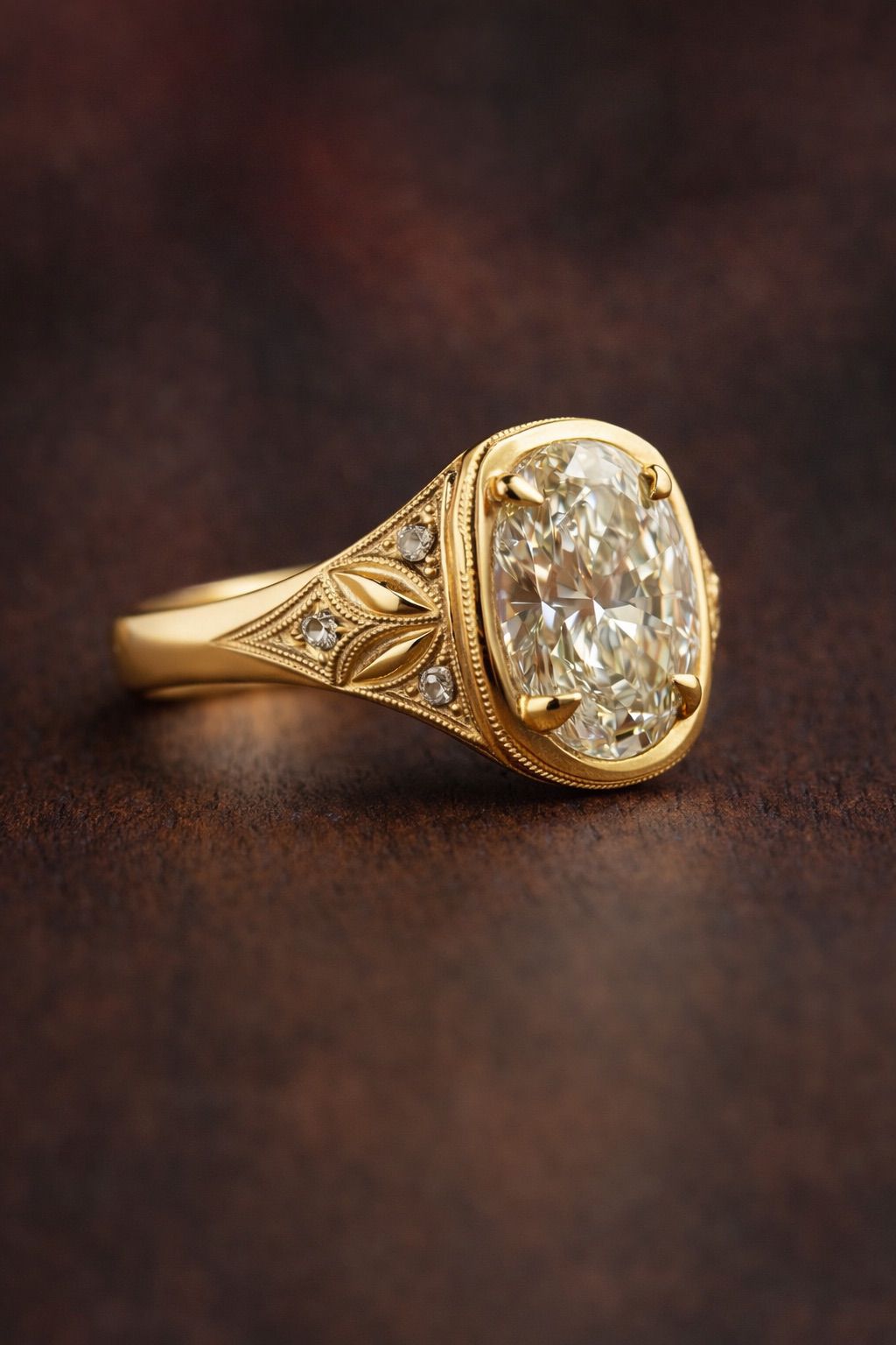 Oval Kesim Pırlanta Yüzük modeli, 14 Ayar Sarı Altın kullanılarak özel olarak tasarlanmıştır.