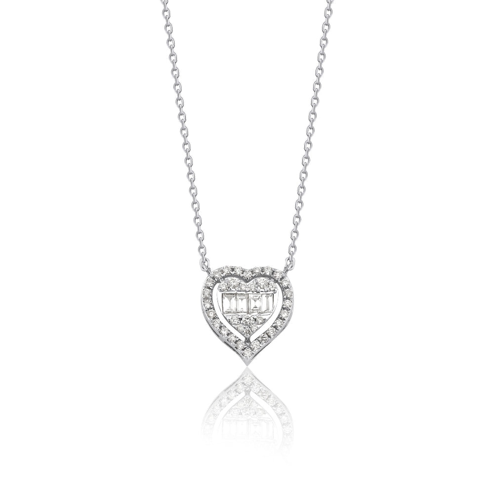 0.21 Karat Kalpli Pırlanta Kolye modeli, yaklaşık 2.55 gr ağırlığında 14 Ayar Beyaz Altın kullanılarak özel olarak tasarlanmıştır.