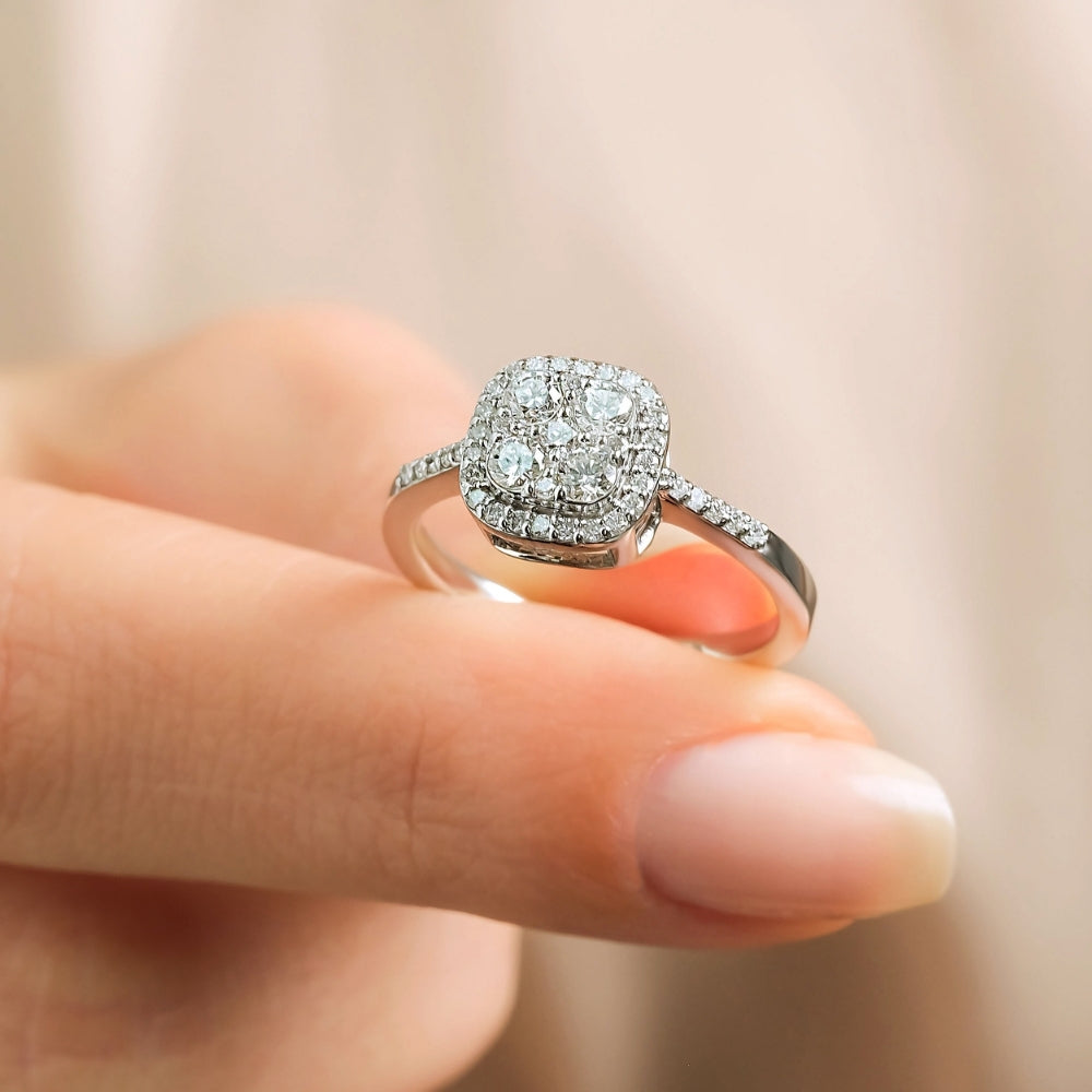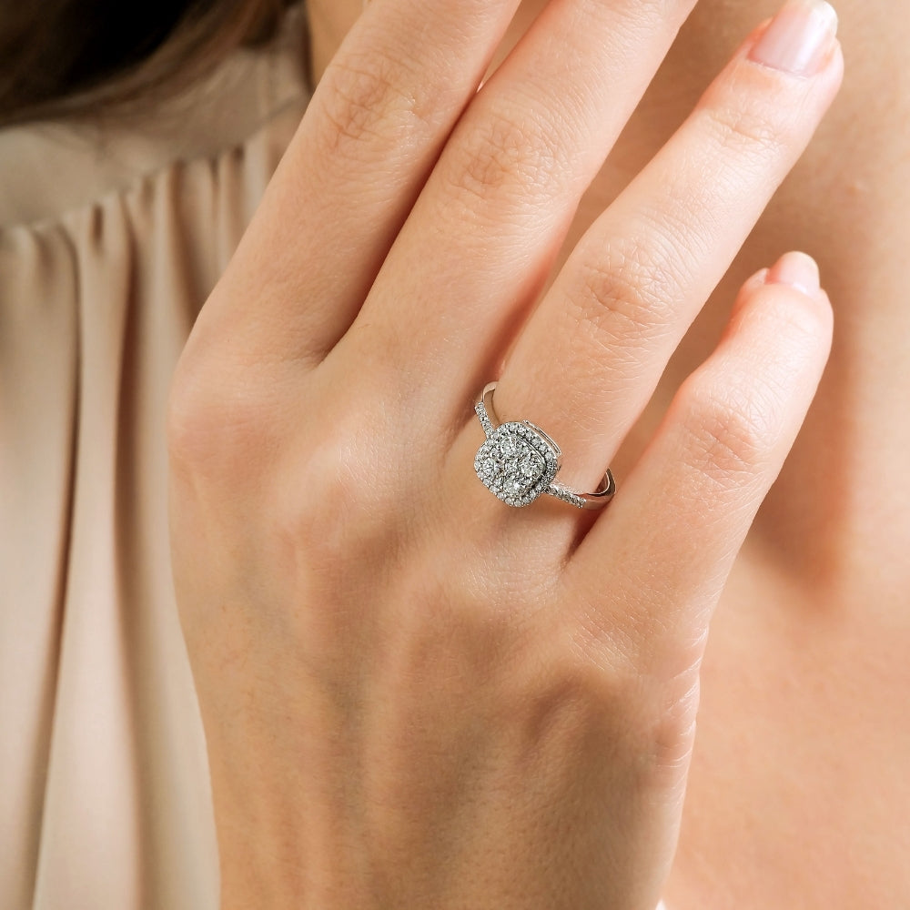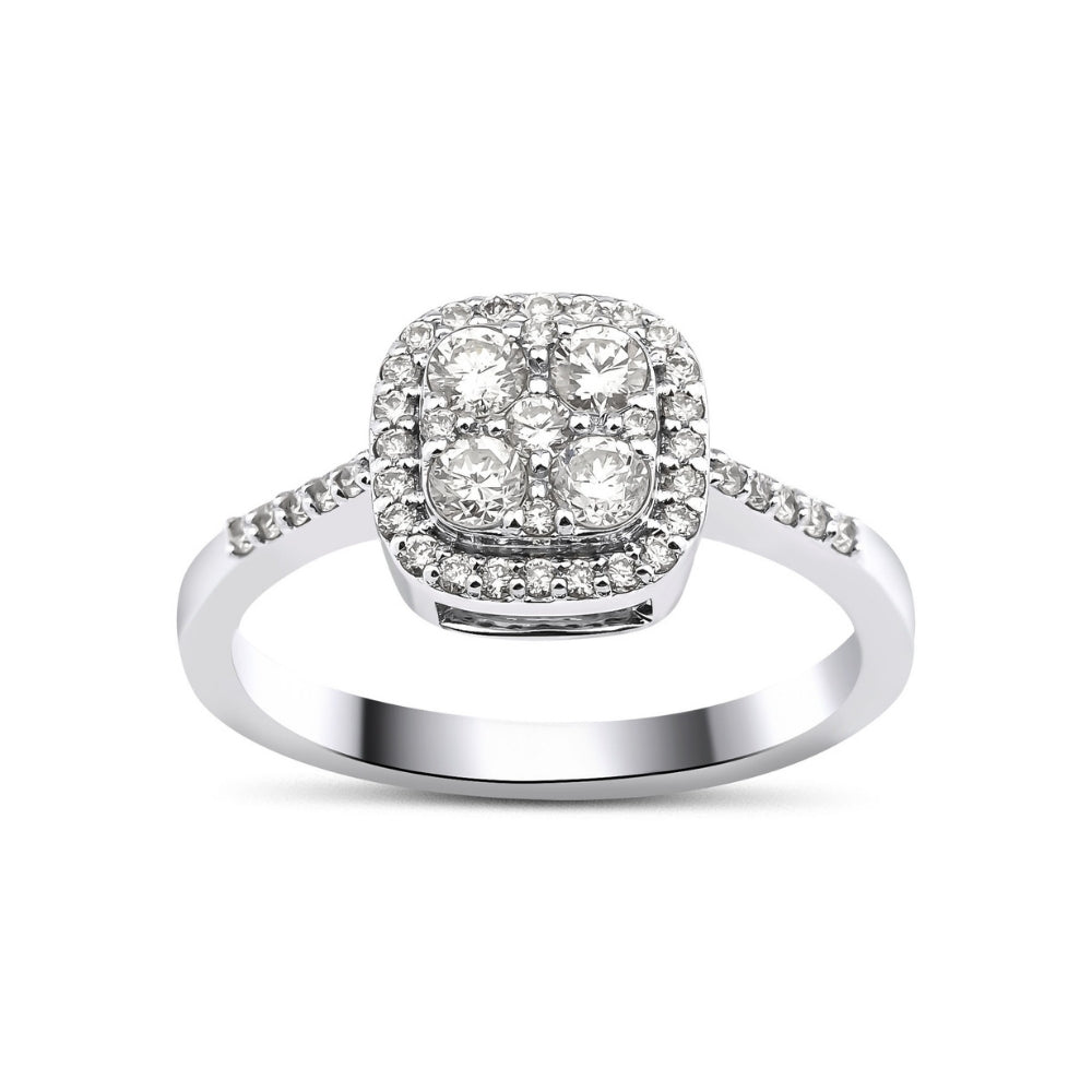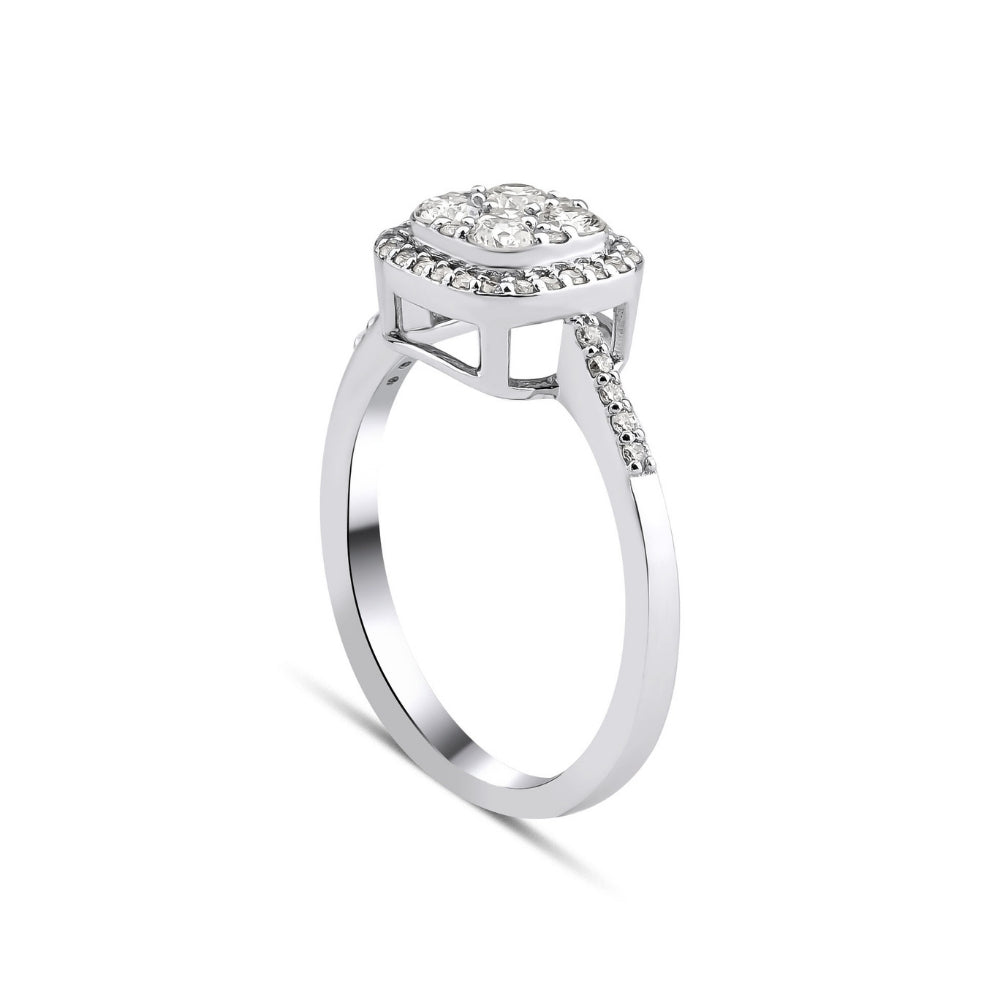 0.58 Karat Pırlanta Yüzük modeli, yaklaşık 3,16 gr ağırlığında 14 Ayar Beyaz Altın kullanılarak özel olarak tasarlanmıştır.