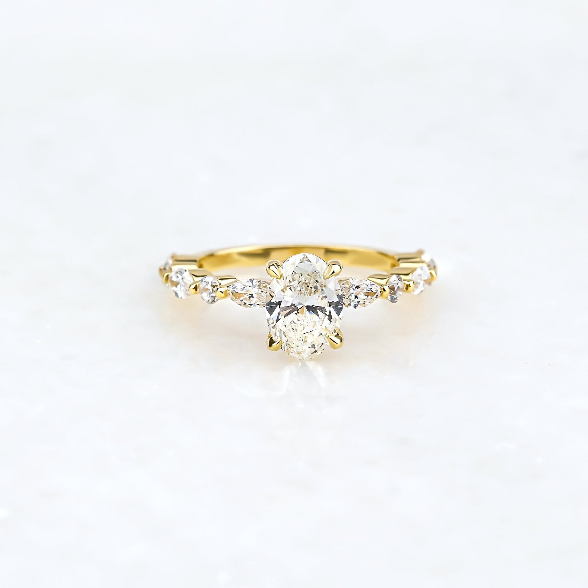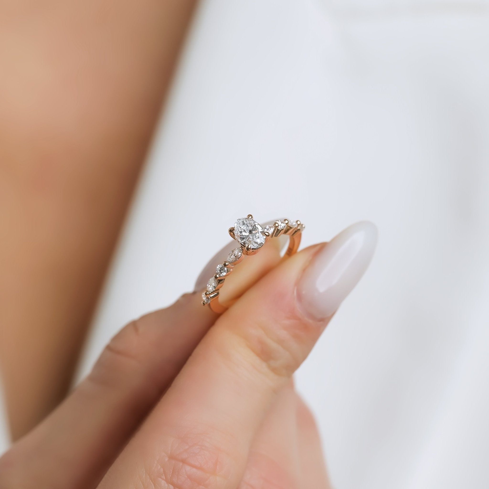 0.70 Karat Oval Kesim & 0.30 Karat Markiz Kesim & 0.12 Karat Yuvarlak Kesim GIA/HRD Sertifikalı Tektaş Pırlanta Markiz Kollu Yüzük - RNF0767