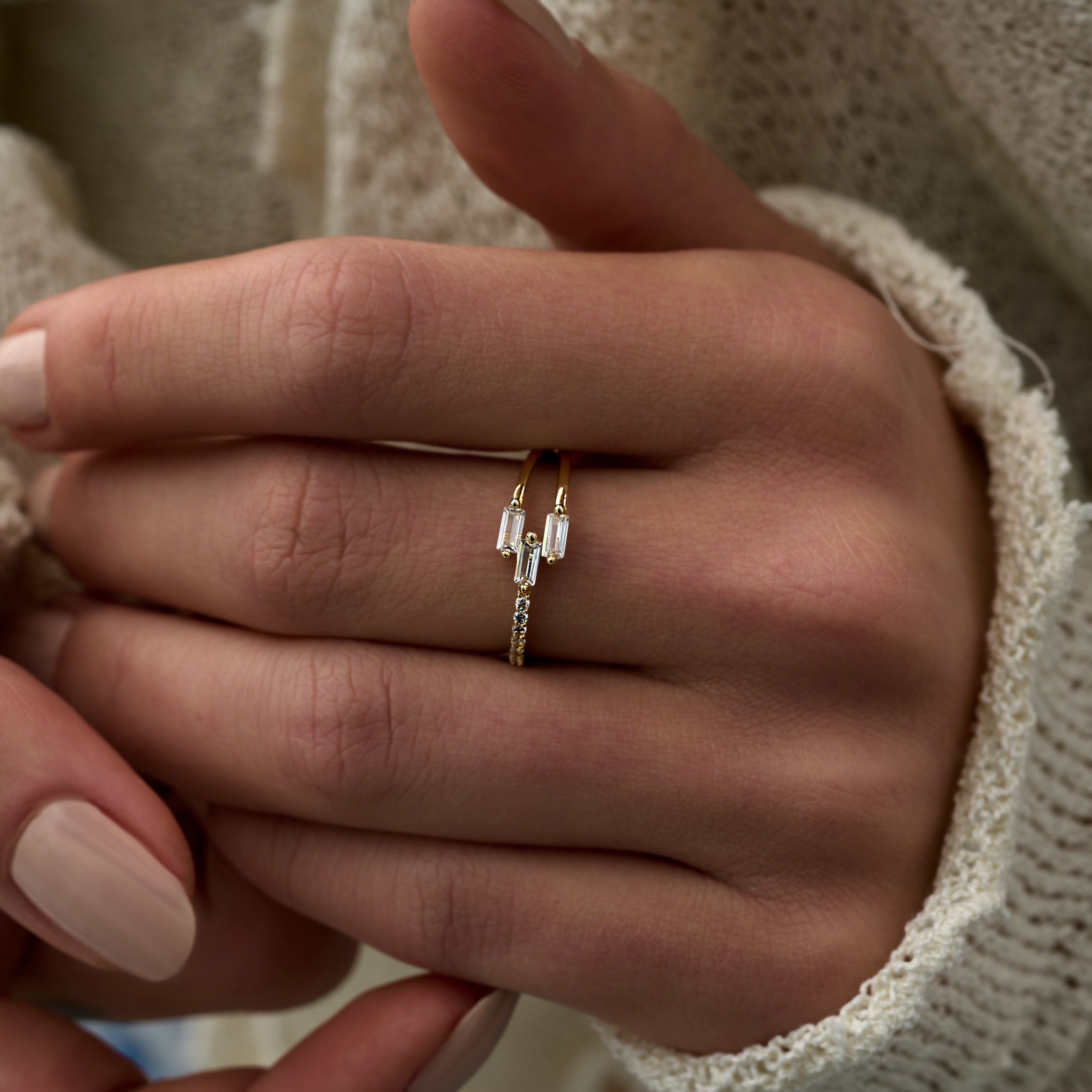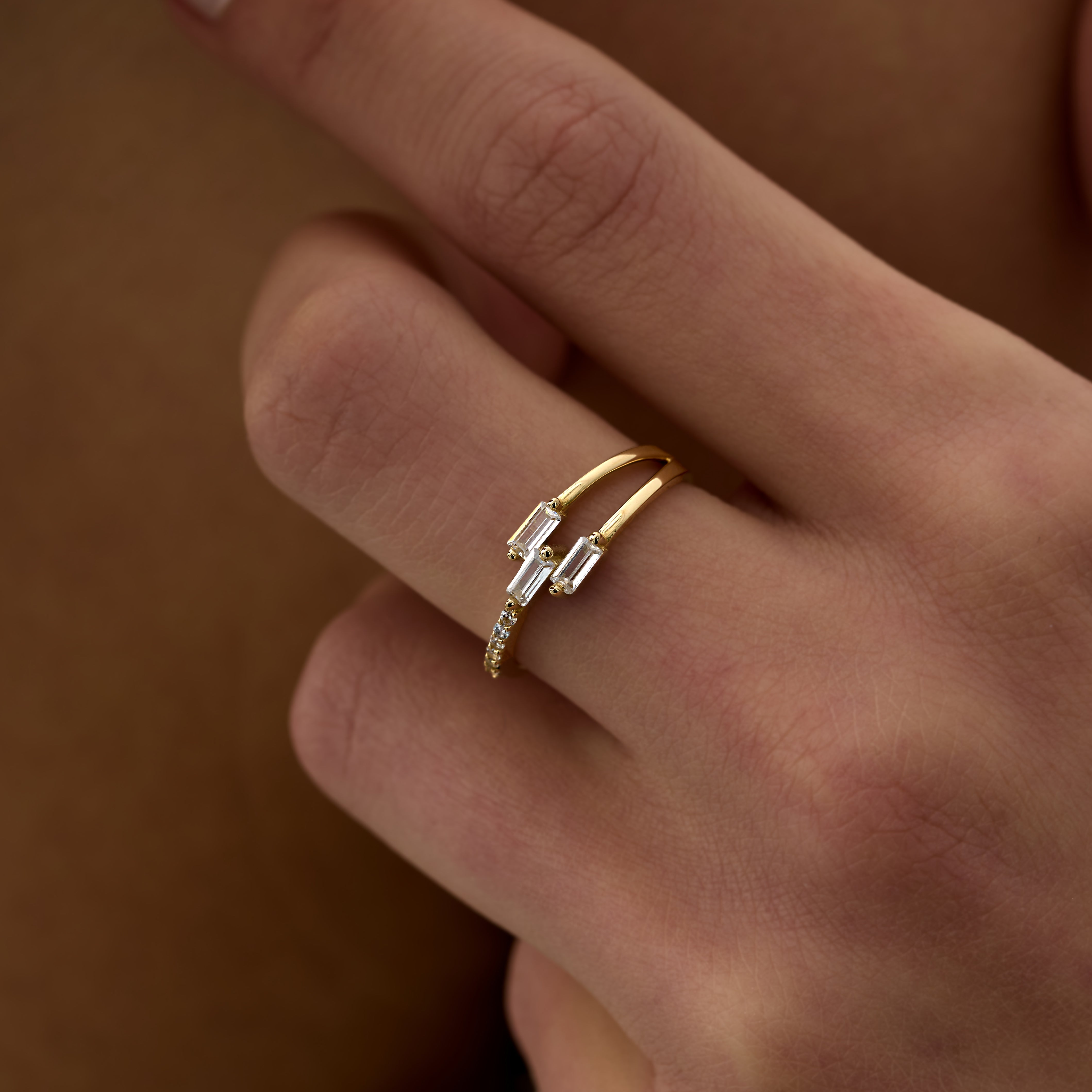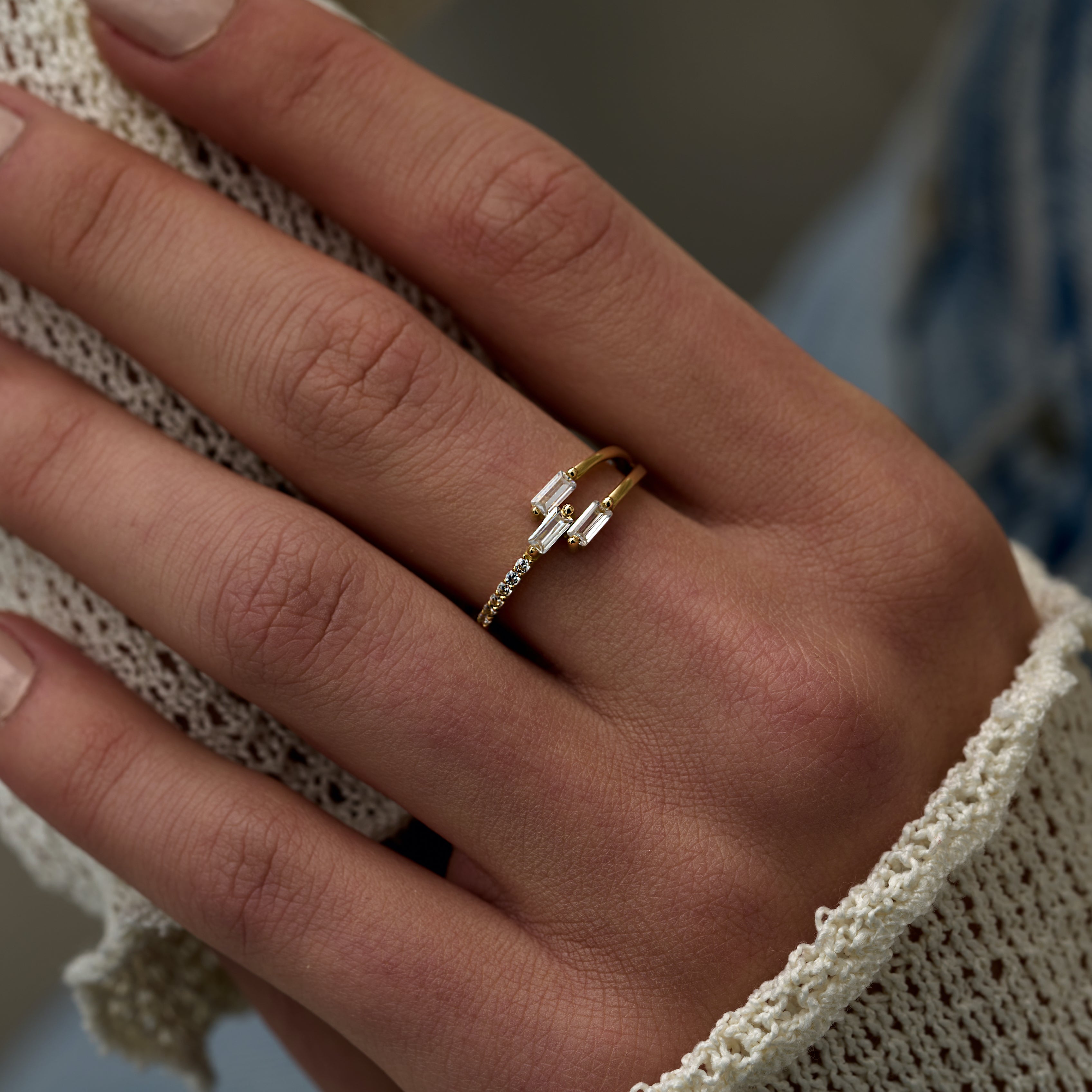 Baget Şeritli Pırlanta Yüzük modeli, yaklaşık 1.92 gr ağırlığında 14 Ayar Sarı Altın kullanılarak özel olarak tasarlanmıştır.